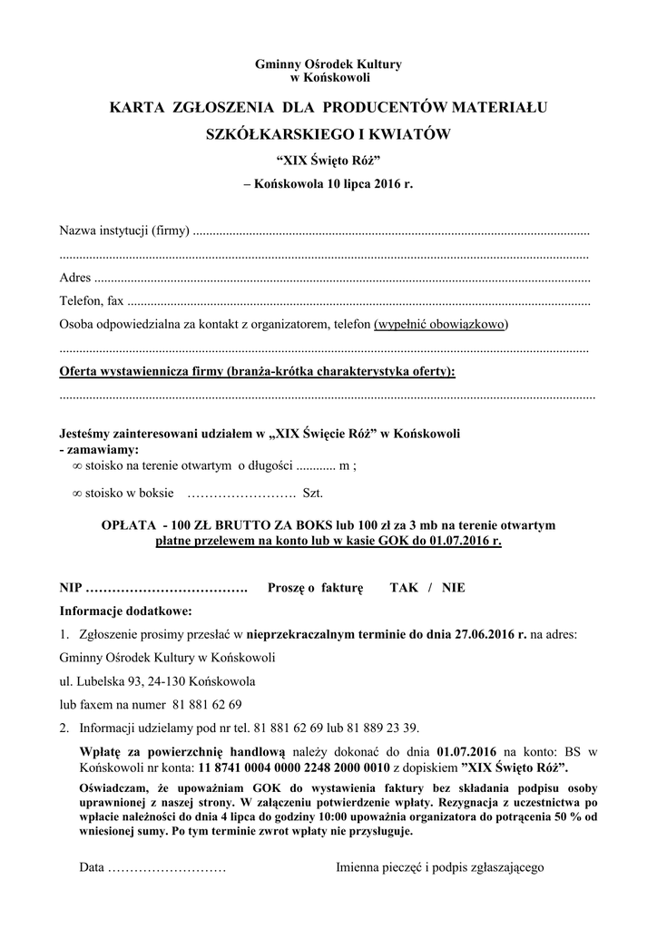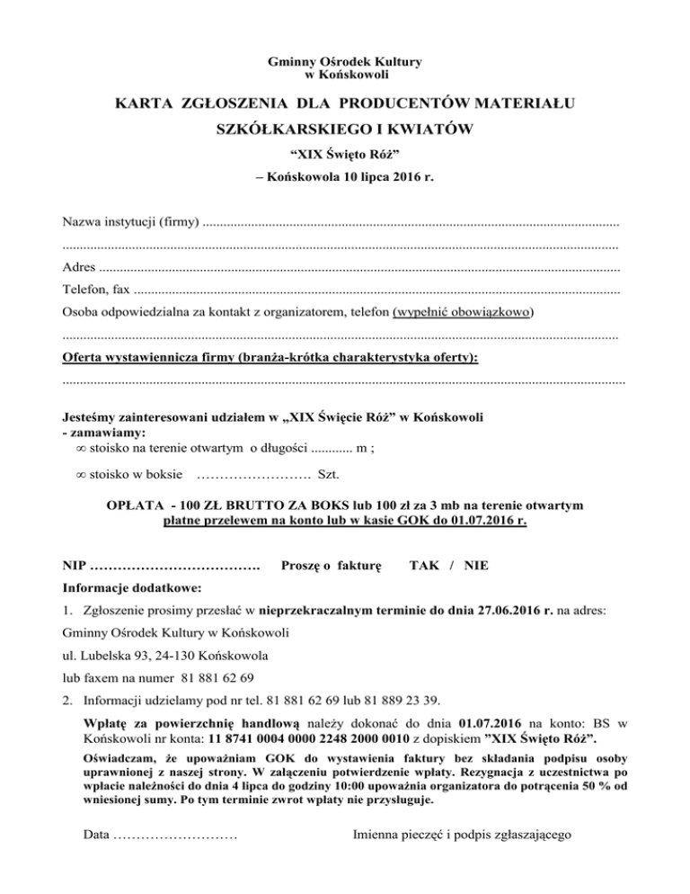 Gminny Ośrodek Kultury w Końskowoli KARTA ZGŁOSZENIA DLA PRODUCENTÓW MATERIAŁU SZKÓŁKARSKIEGO I KWIATÓW “XIX Święto Róż” – Końskowola 10 lipca 2016 r. Nazwa instytucji (firmy) ........................................................................................................................ ................................................................................................................................................................ Adres ...................................................................................................................................................... Telefon, fax ............................................................................................................................................ Osoba odpowiedzialna za kontakt z organizatorem, telefon (wypełnić obowiązkowo) ................................................................................................................................................................ Oferta wystawiennicza firmy (branża-krótka charakterystyka oferty): .................................................................................................................................................................. Jesteśmy zainteresowani udziałem w „XIX Święcie Róż” w Końskowoli - zamawiamy: • stoisko na terenie otwartym o długości ............ m ; • stoisko w boksie ……………………. Szt. OPŁATA - 100 ZŁ BRUTTO ZA BOKS lub 100 zł za 3 mb na terenie otwartym płatne przelewem na konto lub w kasie GOK do 01.07.2016 r. NIP ………………………………. Proszę o fakturę TAK / NIE Informacje dodatkowe: 1. Zgłoszenie prosimy przesłać w nieprzekraczalnym terminie do dnia 27.06.2016 r. na adres: Gminny Ośrodek Kultury w Końskowoli ul. Lubelska 93, 24-130 Końskowola lub faxem na numer 81 881 62 69 2. Informacji udzielamy pod nr tel. 81 881 62 69 lub 81 889 23 39. Wpłatę za powierzchnię handlową należy dokonać do dnia 01.07.2016 na konto: BS w Końskowoli nr konta: 11 8741 0004 0000 2248 2000 0010 z dopiskiem ”XIX Święto Róż”. Oświadczam, że upoważniam GOK do wystawienia faktury bez składania podpisu osoby uprawnionej z naszej strony. W załączeniu potwierdzenie wpłaty. Rezygnacja z uczestnictwa po wpłacie należności do dnia 4 lipca do godziny 10:00 upoważnia organizatora do potrącenia 50 % od wniesionej sumy. Po tym terminie zwrot wpłaty nie przysługuje. Data ……………………… Imienna pieczęć i podpis zgłaszającego Warunki udziału w XIX Święcie Róż 2016: 1. O przydziale miejsc podczas XIX Święta Róż w Końskowoli w roku 2016 będzie decydować kolejność zgłoszeń. Nie ma możliwości wyboru miejsc handlowych przez zainteresowane firmy. 2. GOK poinformuje firmę w przypadku braku miejsc w terminie 7 dni od wpłynięcia zgłoszenia. GOK zastrzega sobie prawo rezygnacji z udziału wystawców bez podania przyczyny. 3. GOK nie wyraża zgody na podnajem ani użyczanie powierzchni innej firmie niż podana na zgłoszeniu. 4. GOK informuje, iż wystawcy mają możliwość rozłożenia stoisk w dniu 10 lipca 2016 r. od godz. 7.00-11.00. Teren Święta Róż jest chroniony przez Agencję Ochrony w terminie 10.07.2016 r. od godz. 13.00 do zakończenia imprezy. 5. Wystawcy są zobowiązani do usunięcia samochodów z placu wystawy do godz. 11.00. 6. Zapłatę należności za zamówioną powierzchnię wystawienniczą należy dokonać przelewem w nieprzekraczalnym terminie do dnia 01.07.2016 r. na konto: Gminny Ośrodek Kultury w Końskowoli BS w Końskowoli 11 8741 0004 0000 2248 2000 0010 W treści przelewu konieczny dopisek: „XIX Święto Róż” 7. Wzięcie udziału w Święcie jest możliwe wyłącznie po wpłynięciu wpłaty na konto GOK. Fakturę wystawimy po otrzymaniu wpłaty. Nie opłacenie stoiska w terminie powoduje automatyczne wykreślenie z listy wystawców i sprzedaż miejsca kolejnemu zainteresowanemu, który natychmiast opłaci miejsce. 8. Organizator nie zwraca opłaty za miejsce wystawowe w przypadku nieobecności na XIX Święcie Róż 2016. 9. Wypełnienie poniższej Karty Zgłoszenia jest równoznaczne z akceptacją warunków udziału.