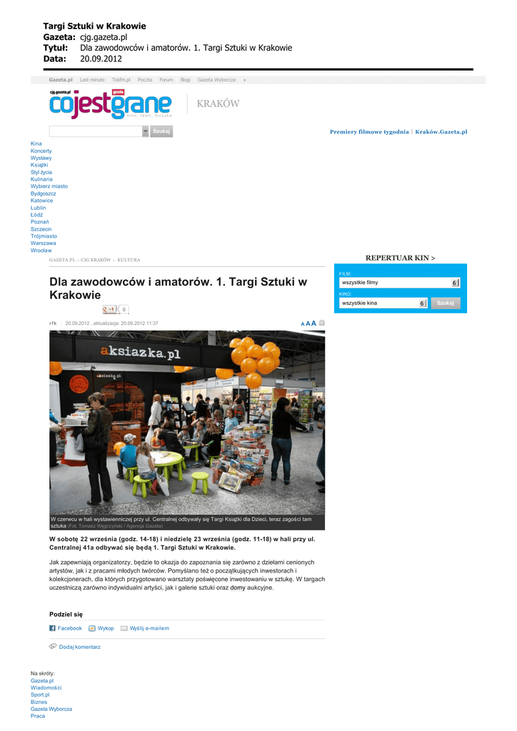 Targi Sztuki w Krakowie Gazeta: cjg.gazeta.pl Tytu³: Dla zawodowców i amatorów. 1. Targi Sztuki w Krakowie Data: 20.09.2012 Gazeta.pl Last minute Tokfm.pl Poczta Forum Blogi Gazeta Wyborcza KRAKÓW kino, teatr, muzyka Szukaj Premiery filmowe tygodnia Kraków.Gazeta.pl Kina Koncerty Wystawy Książki Styl życia Kulinaria Wybierz miasto Bydgoszcz Katowice Lublin Łódź Poznań Szczecin Trójmiasto Warszawa Wrocław REPERTUAR KIN > GAZETA.PL > CJG KRAKÓW > KULTURA FILM: Dla zawodowców i amatorów. 1. Targi Sztuki w Krakowie 0 rfk 20.09.2012 , aktualizacja: 20.09.2012 11:37 A AA W czerwcu w hali wystawienniczej przy ul. Centralnej odbywały się Targi Książki dla Dzieci, teraz zagości tam sztuka (Fot. Tomasz Węgrzyński / Agencja Gazeta) W sobotę 22 września (godz. 14-18) i niedzielę 23 września (godz. 11-18) w hali przy ul. Centralnej 41a odbywać się będą 1. Targi Sztuki w Krakowie. Jak zapewniają organizatorzy, będzie to okazja do zapoznania się zarówno z dziełami cenionych artystów, jak i z pracami młodych twórców. Pomyślano też o początkujących inwestorach i kolekcjonerach, dla których przygotowano warsztaty poświęcone inwestowaniu w sztukę. W targach uczestniczą zarówno indywidualni artyści, jak i galerie sztuki oraz domy aukcyjne. Podziel się Facebook Wykop Dodaj komentarz Na skróty: Gazeta.pl Wiadomości Sport.pl Biznes Gazeta Wyborcza Praca Wyślij e-mailem 6 wszystkie filmy KINO: wszystkie kina 6 Szukaj Targi Sztuki w Krakowie Gazeta: cjg.gazeta.pl Tytu³: Dla zawodowców i amatorów. 1. Targi Sztuki w Krakowie Data: 20.09.2012 Program TV Polecamy: Kobieta Dzieci Wysokie Obcasy Moda Zakupy Poradnik Domowy Przepisy Ubrania Diety Newsletter RSS Poczta Copyright (c) Agora SA O nas Staże u nas Reklama Prywatność Licencje Poleć stronę Zgłoś błąd