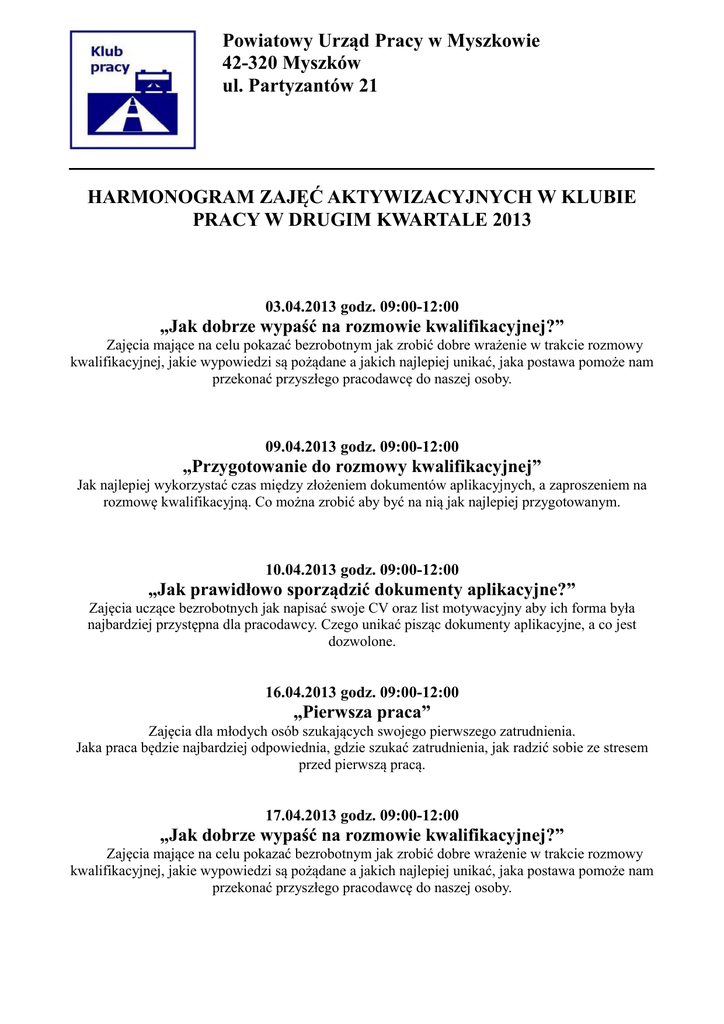 Powiatowy Urząd Pracy w Myszkowie 42-320 Myszków ul. Partyzantów 21 HARMONOGRAM ZAJĘĆ AKTYWIZACYJNYCH W KLUBIE PRACY W DRUGIM KWARTALE 2013 03.04.2013 godz. 09:00-12:00 „Jak dobrze wypaść na rozmowie kwalifikacyjnej?” Zajęcia mające na celu pokazać bezrobotnym jak zrobić dobre wrażenie w trakcie rozmowy kwalifikacyjnej, jakie wypowiedzi są pożądane a jakich najlepiej unikać, jaka postawa pomoże nam przekonać przyszłego pracodawcę do naszej osoby. 09.04.2013 godz. 09:00-12:00 „Przygotowanie do rozmowy kwalifikacyjnej” Jak najlepiej wykorzystać czas między złożeniem dokumentów aplikacyjnych, a zaproszeniem na rozmowę kwalifikacyjną. Co można zrobić aby być na nią jak najlepiej przygotowanym. 10.04.2013 godz. 09:00-12:00 „Jak prawidłowo sporządzić dokumenty aplikacyjne?” Zajęcia uczące bezrobotnych jak napisać swoje CV oraz list motywacyjny aby ich forma była najbardziej przystępna dla pracodawcy. Czego unikać pisząc dokumenty aplikacyjne, a co jest dozwolone. 16.04.2013 godz. 09:00-12:00 „Pierwsza praca” Zajęcia dla młodych osób szukających swojego pierwszego zatrudnienia. Jaka praca będzie najbardziej odpowiednia, gdzie szukać zatrudnienia, jak radzić sobie ze stresem przed pierwszą pracą. 17.04.2013 godz. 09:00-12:00 „Jak dobrze wypaść na rozmowie kwalifikacyjnej?” Zajęcia mające na celu pokazać bezrobotnym jak zrobić dobre wrażenie w trakcie rozmowy kwalifikacyjnej, jakie wypowiedzi są pożądane a jakich najlepiej unikać, jaka postawa pomoże nam przekonać przyszłego pracodawcę do naszej osoby. 23.04.2013 godz. 09:00-12:00 „Jak prawidłowo sporządzić dokumenty aplikacyjne?” Zajęcia uczące bezrobotnych jak napisać swoje CV oraz list motywacyjny aby ich forma była najbardziej przystępna dla pracodawcy. Czego unikać pisząc dokumenty aplikacyjne, a co jest dozwolone. 24.04.2013 godz. 09:00-12:00 „Pierwsza praca” Zajęcia dla młodych osób szukających swojego pierwszego zatrudnienia. Jaka praca będzie najbardziej odpowiednia, gdzie szukać zatrudnienia, jak radzić sobie ze stresem przed pierwszą pracą. 07.05.2013 godz. 09:00-12:00 „Przygotowanie do rozmowy kwalifikacyjnej” Jak najlepiej wykorzystać czas między złożeniem dokumentów aplikacyjnych, a zaproszeniem na rozmowę kwalifikacyjną. Co można zrobić aby być na nią jak najlepiej przygotowanym. 08.05.2013 godz. 09:00-12:00 „Jak dobrze wypaść na rozmowie kwalifikacyjnej?” Zajęcia mające na celu pokazać bezrobotnym jak zrobić dobre wrażenie w trakcie rozmowy kwalifikacyjnej, jakie wypowiedzi są pożądane a jakich najlepiej unikać, jaka postawa pomoże nam przekonać przyszłego pracodawcę do naszej osoby. 14.05.2013 godz. 09:00-12:00 „Jak prawidłowo sporządzić dokumenty aplikacyjne?” Zajęcia uczące bezrobotnych jak napisać swoje CV oraz list motywacyjny aby ich forma była najbardziej przystępna dla pracodawcy. Czego unikać pisząc dokumenty aplikacyjne, a co jest dozwolone. 15.05.2013 godz. 09:00-12:00 „Przygotowanie do rozmowy kwalifikacyjnej” Jak najlepiej wykorzystać czas między złożeniem dokumentów aplikacyjnych, a zaproszeniem na rozmowę kwalifikacyjną. Co można zrobić aby być na nią jak najlepiej przygotowanym. 21.05.2013 godz. 09:00-12:00 „Jak dobrze wypaść na rozmowie kwalifikacyjnej?” Zajęcia mające na celu pokazać bezrobotnym jak zrobić dobre wrażenie w trakcie rozmowy kwalifikacyjnej, jakie wypowiedzi są pożądane a jakich najlepiej unikać, jaka postawa pomoże nam przekonać przyszłego pracodawcę do naszej osoby. 22.05.2013 godz. 09:00-12:00 „Jak prawidłowo sporządzić dokumenty aplikacyjne?” Zajęcia uczące bezrobotnych jak napisać swoje CV oraz list motywacyjny aby ich forma była najbardziej przystępna dla pracodawcy. Czego unikać pisząc dokumenty aplikacyjne, a co jest dozwolone. 28.05.2013 godz. 09:00-12:00 „Przygotowanie do rozmowy kwalifikacyjnej” Jak najlepiej wykorzystać czas między złożeniem dokumentów aplikacyjnych, a zaproszeniem na rozmowę kwalifikacyjną. Co można zrobić aby być na nią jak najlepiej przygotowanym. 04.06.2013 godz. 09:00-12:00 „Pierwsza praca” Zajęcia dla młodych osób szukających swojego pierwszego zatrudnienia. Jaka praca będzie najbardziej odpowiednia, gdzie szukać zatrudnienia, jak radzić sobie ze stresem przed pierwszą pracą. 05.06.2013 godz. 09:00-12:00 „Jak dobrze wypaść na rozmowie kwalifikacyjnej?” Zajęcia mające na celu pokazać bezrobotnym jak zrobić dobre wrażenie w trakcie rozmowy kwalifikacyjnej, jakie wypowiedzi są pożądane a jakich najlepiej unikać, jaka postawa pomoże nam przekonać przyszłego pracodawcę do naszej osoby. 11.06.2013 godz. 09:00-12:00 „Jak prawidłowo sporządzić dokumenty aplikacyjne?” Zajęcia uczące bezrobotnych jak napisać swoje CV oraz list motywacyjny aby ich forma była najbardziej przystępna dla pracodawcy. Czego unikać pisząc dokumenty aplikacyjne, a co jest dozwolone. 12.06.2013 godz. 09:00-12:00 „Przygotowanie do rozmowy kwalifikacyjnej” Jak najlepiej wykorzystać czas między złożeniem dokumentów aplikacyjnych, a zaproszeniem na rozmowę kwalifikacyjną. Co można zrobić aby być na nią jak najlepiej przygotowanym. 18.06.2013 godz. 09:00-12:00 „Pierwsza praca” Zajęcia dla młodych osób szukających swojego pierwszego zatrudnienia. Jaka praca będzie najbardziej odpowiednia, gdzie szukać zatrudnienia, jak radzić sobie ze stresem przed pierwszą pracą. W pozostałe dni w tygodniu sala czynna w godzinach od 08:00 do 15:00