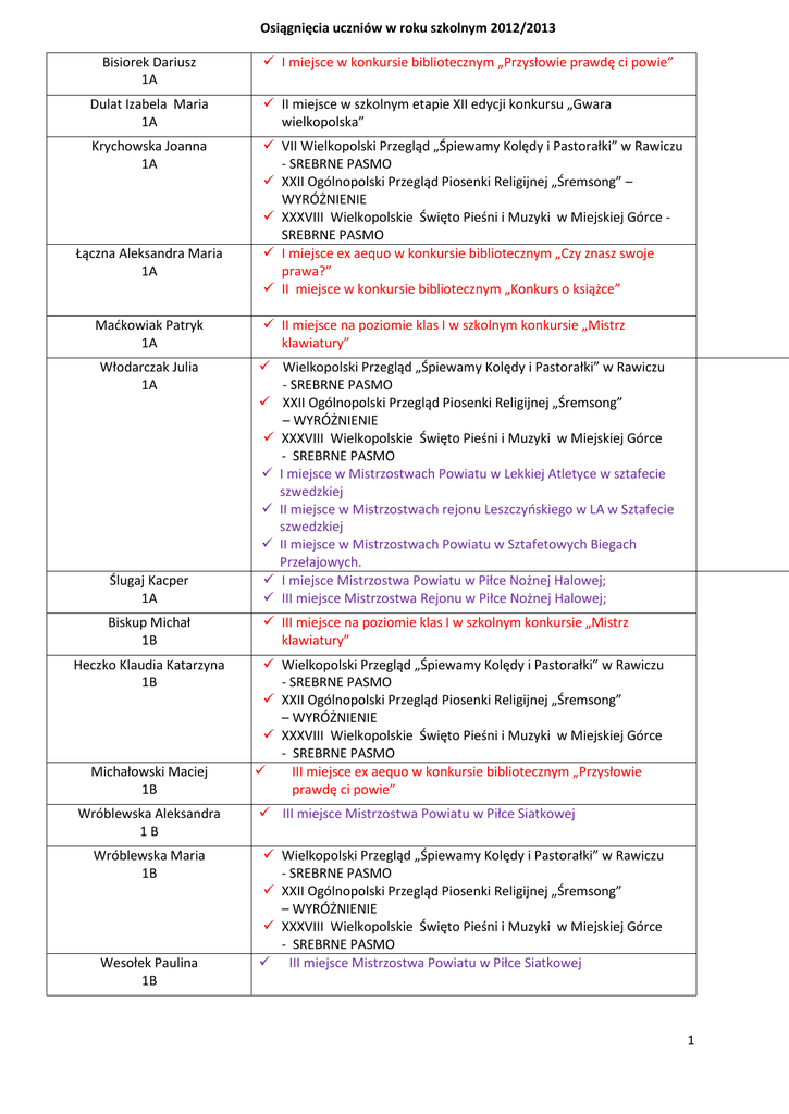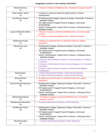 Osiągnięcia uczniów w roku szkolnym 2012/2013 Bisiorek Dariusz 1A I miejsce w konkursie bibliotecznym „Przysłowie prawdę ci powie” Dulat Izabela Maria 1A II miejsce w szkolnym etapie XII edycji konkursu „Gwara wielkopolska” Krychowska Joanna 1A VII Wielkopolski Przegląd „Śpiewamy Kolędy i Pastorałki” w Rawiczu - SREBRNE PASMO XXII Ogólnopolski Przegląd Piosenki Religijnej „Śremsong” – WYRÓŻNIENIE XXXVIII Wielkopolskie Święto Pieśni i Muzyki w Miejskiej Górce SREBRNE PASMO I miejsce ex aequo w konkursie bibliotecznym „Czy znasz swoje prawa?” II miejsce w konkursie bibliotecznym „Konkurs o książce” Łączna Aleksandra Maria 1A Maćkowiak Patryk 1A II miejsce na poziomie klas I w szkolnym konkursie „Mistrz klawiatury” Ślugaj Kacper 1A Wielkopolski Przegląd „Śpiewamy Kolędy i Pastorałki” w Rawiczu - SREBRNE PASMO XXII Ogólnopolski Przegląd Piosenki Religijnej „Śremsong” – WYRÓŻNIENIE XXXVIII Wielkopolskie Święto Pieśni i Muzyki w Miejskiej Górce - SREBRNE PASMO I miejsce w Mistrzostwach Powiatu w Lekkiej Atletyce w sztafecie szwedzkiej II miejsce w Mistrzostwach rejonu Leszczyńskiego w LA w Sztafecie szwedzkiej II miejsce w Mistrzostwach Powiatu w Sztafetowych Biegach Przełajowych. I miejsce Mistrzostwa Powiatu w Piłce Nożnej Halowej; III miejsce Mistrzostwa Rejonu w Piłce Nożnej Halowej; Biskup Michał 1B III miejsce na poziomie klas I w szkolnym konkursie „Mistrz klawiatury” Włodarczak Julia 1A Heczko Klaudia Katarzyna 1B Michałowski Maciej 1B Wróblewska Aleksandra 1B Wróblewska Maria 1B Wesołek Paulina 1B Wielkopolski Przegląd „Śpiewamy Kolędy i Pastorałki” w Rawiczu - SREBRNE PASMO XXII Ogólnopolski Przegląd Piosenki Religijnej „Śremsong” – WYRÓŻNIENIE XXXVIII Wielkopolskie Święto Pieśni i Muzyki w Miejskiej Górce - SREBRNE PASMO III miejsce ex aequo w konkursie bibliotecznym „Przysłowie prawdę ci powie” III miejsce Mistrzostwa Powiatu w Piłce Siatkowej Wielkopolski Przegląd „Śpiewamy Kolędy i Pastorałki” w Rawiczu - SREBRNE PASMO XXII Ogólnopolski Przegląd Piosenki Religijnej „Śremsong” – WYRÓŻNIENIE XXXVIII Wielkopolskie Święto Pieśni i Muzyki w Miejskiej Górce - SREBRNE PASMO III miejsce Mistrzostwa Powiatu w Piłce Siatkowej 1 Szymańska Marta 1C III miejsce w Mistrzostwach Powiatu w Lekkiej Atletyce w biegu na 300 m Udział w Mistrzostwach Rejonu Leszczyńskiego w Lekkiej Atletyce w biegu na 300 m Wielkopolski Przegląd „Śpiewamy Kolędy i Pastorałki” w Rawiczu - SREBRNE PASMO XXII Ogólnopolski Przegląd Piosenki Religijnej „Śremsong” – WYRÓŻNIENIE XXXVIII Wielkopolskie Święto Pieśni i Muzyki w Miejskiej Górce - SREBRNE PASMO III miejsce ex aequo w konkursie bibliotecznym „Przysłowie prawdę ci powie” Wielkopolski Przegląd „Śpiewamy Kolędy i Pastorałki” w Rawiczu - SREBRNE PASMO XXII Ogólnopolski Przegląd Piosenki Religijnej „Śremsong” – WYRÓŻNIENIE XXXVIII Wielkopolskie Święto Pieśni i Muzyki w Miejskiej Górce - SREBRNE PASMO Wielkopolski Przegląd „Śpiewamy Kolędy i Pastorałki” w Rawiczu - SREBRNE PASMO XXII Ogólnopolski Przegląd Piosenki Religijnej „Śremsong” – WYRÓŻNIENIE XXXVIII Wielkopolskie Święto Pieśni i Muzyki w Miejskiej Górce - SREBRNE PASMO II miejsce w konkursie bibliotecznym „Przysłowie prawdę ci powie” Wielkopolski Przegląd „Śpiewamy Kolędy i Pastorałki” w Rawiczu - SREBRNE PASMO XXII Ogólnopolski Przegląd Piosenki Religijnej „Śremsong” – WYRÓŻNIENIE XXXVIII Wielkopolskie Święto Pieśni i Muzyki w Miejskiej Górce - SREBRNE PASMO Wielkopolski Przegląd „Śpiewamy Kolędy i Pastorałki” w Rawiczu - SREBRNE PASMO XXII Ogólnopolski Przegląd Piosenki Religijnej „Śremsong” – WYRÓŻNIENIE XXXVIII Wielkopolskie Święto Pieśni i Muzyki w Miejskiej Górce - SREBRNE PASMO I miejsce w szkolnym konkursie na „Najaktywniejszego czytelnika biblioteki szkolnej” wśród uczniów klas I-II Grześkowiak Szymon Piotr 1D I miejsce drużynowo na poziomie klas I w konkursie bibliotecznym „Wokół filmu” Krawczyk Krzysztof Michał 1D I miejsce drużynowo na poziomie klas I w konkursie bibliotecznym „Wokół filmu” Wyróżnienie w szkolnym konkursie na „Najaktywniejszego czytelnika biblioteki szkolnej” wśród uczniów klas I-II I miejsce na poziomie klas I w szkolnym konkursie „Mistrz klawiatury” Katarzyna Adamska 1C Bucher Michalina 1C Haremza Weronika 1C Ratajszczak Julia 1C Ratajszczak Zuzanna 1C Sobiesińska Aleksandra 1C Nowacka Aleksandra 1D Orłowska Paula 1D Pokrzywniak Adrianna 1D Finalistka IV Ogólnopolskiego Konkursu Gramatyczno - Ortograficznego im. ks. Onufrego Kopczyńskiego w kat. szkół gimnazjalnych II miejsce w szkolnym konkursie „Mistrz ortografii” I miejsce w Mistrzostwach Powiatu w Lekkiej Atletyce w sztafecie 4 x 100 m Udział w Mistrzostwach Rejonu Leszczyńskiego w Lekkiej Atletyce 2 Skrzypczak Norbert Korbik Natalia Agnieszka 2A Łączna Daria 2A Łączna Urszula 2A Wyróżnienie w szkolnym konkursie na „Najaktywniejszego czytelnika biblioteki szkolnej” wśród uczniów klas I-II I miejsce ex aequo w konkursie bibliotecznym „Konkurs o książce” II miejsce zespołowo w XII Powiatowym Konkursie Igrzyska Olimpijskie z Matematyki (Racot) II miejsce w Konkursie Biblijnym Ligii Międzygimnazjalnej w Mosinie III miejsce w XII edycji Konkursu „ Generał Dezydery Chłapowski – życie i dzieło” organizowanym przez Stację badawczą Instytutu Środowiska Rolniczego i Leśnego Polskiej Akademii Nauk w Turwi oraz Stowarzyszenie Oświatowe im. Dezyderego Chłapowskiego II miejsce Mistrzostwa Powiatu w Indywidualnych Biegach Przełajowych. Finalistka Mistrzostw Wielkopolski w Biegach Przełajowych. II miejsce w Mistrzostwach Powiatu w Sztafetowych biegach Przełajowych. I miejsce w Mistrzostwach Powiatu w Lekkiej Atletyce w Biegu na 300 m I miejsce Mistrzostwach Powiatu w Lekkiej Atletyce 