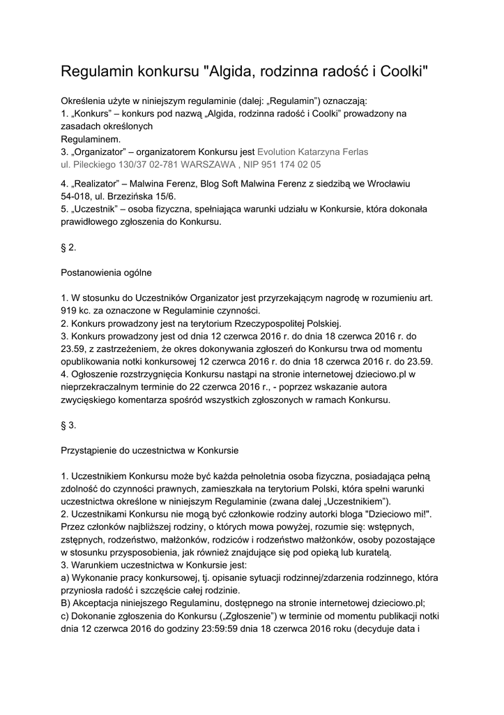 Regulamin konkursu "Algida, rodzinna radość i Coolki" Określenia użyte w niniejszym regulaminie (dalej: „Regulamin”) oznaczają: 1. „Konkurs” – konkurs pod nazwą „Algida, rodzinna radość i Coolki” prowadzony na zasadach określonych Regulaminem. 3. „Organizator” – organizatorem Konkursu jest Evolution Katarzyna Ferlas ul. Pileckiego 130/37 02781 WARSZAWA , NIP 951 174 02 05 4. „Realizator” – Malwina Ferenz, Blog Soft Malwina Ferenz z siedzibą we Wrocławiu 54018, ul. Brzezińska 15/6. 5. „Uczestnik” – osoba fizyczna, spełniająca warunki udziału w Konkursie, która dokonała prawidłowego zgłoszenia do Konkursu. § 2. Postanowienia ogólne 1. W stosunku do Uczestników Organizator jest przyrzekającym nagrodę w rozumieniu art. 919 kc. za oznaczone w Regulaminie czynności. 2. Konkurs prowadzony jest na terytorium Rzeczypospolitej Polskiej. 3. Konkurs prowadzony jest od dnia 12 czerwca 2016 r. do dnia 18 czerwca 2016 r. do 23.59, z zastrzeżeniem, że okres dokonywania zgłoszeń do Konkursu trwa od momentu opublikowania notki konkursowej 12 czerwca 2016 r. do dnia 18 czerwca 2016 r. do 23.59. 4. Ogłoszenie rozstrzygnięcia Konkursu nastąpi na stronie internetowej dzieciowo.pl w nieprzekraczalnym terminie do 22 czerwca 2016 r., poprzez wskazanie autora zwycięskiego komentarza spośród wszystkich zgłoszonych w ramach Konkursu. § 3. Przystąpienie do uczestnictwa w Konkursie 1. Uczestnikiem Konkursu może być każda pełnoletnia osoba fizyczna, posiadająca pełną zdolność do czynności prawnych, zamieszkała na terytorium Polski, która spełni warunki uczestnictwa określone w niniejszym Regulaminie (zwana dalej „Uczestnikiem”). 2. Uczestnikami Konkursu nie mogą być członkowie rodziny autorki bloga "Dzieciowo mi!". Przez członków najbliższej rodziny, o których mowa powyżej, rozumie się: wstępnych, zstępnych, rodzeństwo, małżonków, rodziców i rodzeństwo małżonków, osoby pozostające w stosunku przysposobienia, jak również znajdujące się pod opieką lub kuratelą. 3. Warunkiem uczestnictwa w Konkursie jest: a) Wykonanie pracy konkursowej, tj. opisanie sytuacji rodzinnej/zdarzenia rodzinnego, która przyniosła radość i szczęście całej rodzinie. B) Akceptacja niniejszego Regulaminu, dostępnego na stronie internetowej dzieciowo.pl; c) Dokonanie zgłoszenia do Konkursu („Zgłoszenie”) w terminie od momentu publikacji notki dnia 12 czerwca 2016 do godziny 23:59:59 dnia 18 czerwca 2016 roku (decyduje data i godzina otrzymania Zgłoszenia) publikacji komentarza zawierającego pracę konkursową. Komentarz zostanie opublikowany pod notką konkursową. 4. Uczestnik może zgłosić do Konkursu tylko taką pracę konkursową, co do której posiada pełnię praw autorskich w zakresie, w jakim stanowi ona utwór w rozumieniu ustawy z dnia 4 lutego 1994 r. o prawie autorskim i prawach pokrewnych (Dz.U. 2006 Nr 90, poz. 631 z późn. zm.) oraz praca ta nie może zagrażać ani naruszać praw osób trzecich, w szczególności nie naruszać ich majątkowych i osobistych praw autorskich. 5. Zabronione jest przesyłanie Zgłoszeń, które zawierają wulgaryzmy, słowa powszechnie uważane za obraźliwe, inne opisy powszechnie uważane za obraźliwe lub które mogą być uznane za naruszające prawo lub dobre obyczaje, bądź dobra osobiste lub uczucia osób trzecich, w szczególności treści wulgarne, propagujące przemoc, dyskryminację. Zgłoszenie zawierające wskazane wyżej treści nie będzie brać udziału w Konkursie. 6. Każdy z Uczestników może stworzyć jedną pracę konkursową i zamieścić jeden komentarz zawierający tę pracę. § 4. Rozstrzygnięcie Konkursu 1. Zwycięzcami Konkursu zostaną: a. dwaj Uczestnicy, którzy stworzą najciekawszą pracę konkursową wybrane przez autorkę bloga "Dzieciowo mi!" wyłonioną przez autorkę bloga "Dzieciowo mi!" zgodnie z ust. 2 punkt poniżej, 2. W terminie od dnia 19 czerwca 2016 r. do 22 czerwca 2016 r. autorka bloga "Dzieciowo mi!" wybierze 2 najciekawsze prace konkursowe, których autorzy otrzymają po 1 nagrodzie głównej. 3. Przy wyborze najciekawszych prac konkursowych autorka bloga "Dzieciowo mi!" będzie kierować się kryterium kreatywności, pomysłowości oraz stylu wykonania zadania konkursowego przez Uczestników. § 5. Wykluczenie z uczestnictwa w Konkursie W przypadkach wykrycia działań niezgodnych z Regulaminem, próby wpływania na wyłonienie zwycięzcy Konkursu w sposób niedozwolony, działań sprzecznych z ideą i celem Konkursu, dany Uczestnik Konkursu zostanie wykluczony z Konkursu. Organizator poinformuje Uczestnika o wykluczeniu z Konkursu. § 6. Nagrody oraz ich wydanie 1. W Konkursie przewidziana jest następująca Nagroda: a) 2 nagrody główne w postaci kompletu czterech maskotek Coolki Algida. 2. Zwycięzcy nie przysługuje prawo żądania wymiany nagrody na inną nagrodę lub na ekwiwalent pieniężny, jak również nie przysługuje prawo przeniesienia na osobę trzecią roszczenia o wydanie nagrody. 3. Najpóźniej dnia 24.06.2016r. zwycięzca zostanie powiadomiony przez autorkę bloga "Dzieciowo mi!" o przyznaniu mu nagrody poprzez wiadomość wysłaną na adres email podany przez Uczestnika przy zamieszczaniu komentarza. 4. Zwycięzca nagrody, o którym mowa w ust. 1 punkt a) zostanie poproszeni o przekazanie adresu do wysłania nagrody i udzielenie zgody na przetwarzanie takiego adresu na cel związany z wydaniem nagrody w Konkursie. 5. Nagrody zostaną wysłane do dnia 10 czerwca 2016 r. za pośrednictwem Poczty Polskiej albo kuriera na adres podany przez zwycięzców Konkursu – koszty przesyłki pokrywa Organizator. 6. Nagrody, która nie zostanie wydana z przyczyn niezależnych od Organizatora, pozostaje do jego dyspozycji. 7. Organizator zastrzega sobie prawo do zmiany nagrody na inną o tej samej wartości. 8. Przy odbiorze (wydaniu) nagrody Uczestnik jest zobowiązany pisemnie potwierdzić odbiór nagrody w Ko