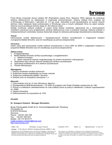 Firma Brose Corporate Group oddzial GD (Poprzednia nazwa firmy: Siemens VDO) zajmuje sie produkcja silnikow elektrycznych do zastosowan w przemysle samochodowym. Glowny oddzial firmy znajduje sie w Würzburgu w Niemczech i zatrudnia ok. 4.5 tys osob. Jednostka ta jest dpowiedzialna za rozwoj nowych silnikow, ktore nastepnie beda produkowane w Würzburgu oraz w innych oddzialach firmy na calym swiecie. Obecna roczna produkcja silnikow siega ok. 60 milionow sztuk. Istnieje mozliwosc odbycia praktyki, w czasie ktorej bedzie mozliwosc zapoznania sie z nowoczesnymi metodami uzywanymi przy projektowaniu silnikow elektrycznych oraz w produkcji masowej. Odbycie praktyki w miedzynarodowym srodowisku stwarza doskonala okazje do zdobycia pierwszego doswiadczenia zawodowego. Temat: Opracowanie modeli elektrycznych i temperaturowych silnikow szczotkowych z magnesami trwalymi w programie Matlab Simulink, oraz ich weryfikacjia za pomoca eksperymentu Cel pracy: Celem pracy jest opracowanie modeli silnikow szczotkowych o mocy 20W do 200W z magnesami trwalymi w programie Matlab Simulink oraz ich weryfikacja za pomoca eksperymentu. Zakres pracy: 1. Przeglad literatury 2. Model (Matlab Simulink) silnika szczotkowego z uwzglednieniem a) efektow komutacji b) wplyw nasycenia obwodu magnetycznego na zmiane strumienia i indukcyjnosci 3. Wykonianie bazy danych obecnie istniejacych silnikow szczotkowych 4. Symulacja podstawowch ch-k silnikow szczotkowych 5. Pomiar laboratoryjny Wymagania: 1. Dotyczy studentow studiow dziennych 2. Znajomosc jezyka angielskiego (w mowie i pismie) 3. Znajomosc podstawowa Matlab i Simulink 4. Srednia ocen ze wszystkich semestrow > 4 Warunki: 1. Czas praktyki od 6 do 12 msc (Würzburg, Niemcy) 2. Wynagrodzenie 600€ Brutto/miesiac + 2x 200€ na przejazd z/do Polski (Podatek miesiecznie do 14€) 3. Pomoc w znalezieniu zakwaterowania na czas praktyki (cena za pokoj w akademiku z pelnym wyposazeniem ok. 200€) 4. Opieka zdrowotna 5. Dofinansowanie do wyzywienia ok. 40% Kontakt: Dr. Grzegorz Ombach, Manager Simulation Brose Fahrzeugteile GmbH & Co. Kommanditgesellschaft, Würzburg Ohmstraße 2a D-97076 Würzburg Germany Phone: +49 931 202 706 Fax: +49 931 202 303 Mobile: +49 173 3015177 mailto:[email protected] http://www.brose.com Index: 100 Verfasser: Grzegorz Ombach Funktion: DVE Seite: 1/2 Speicher-Dat.: 12. Dec. 08 Ablage: D:\02_Base\16_RD5\05_Praktikum\Praktyka 2009 v1.doc Weitergabe sowie Vervielfältigung dieser vertraulichen Unterlage(n), Verwertung und Mitteilung ihres Inhaltes ist nicht ohne unsere vorherige schriftliche Genehmigung gestattet. Zuwiderhandlungen verpflichten zu Schadensersatz. Alle Rechte für den Fall der Patenterteilung oder Gebrauchsmuster-Eintragung vorbehalten. The copying, use, distribution or disclosure of the confidential and proprietary information contained in this document(s) is strictly prohibited without prior written consent. Any breach shall subject the infringing party to remedies. The owner reserves all rights in the event of the grant of a patent or the registration of a utility model or design. Firma Brose Corporate Group oddzial GD (Poprzednia nazwa firmy: Siemens VDO) zajmuje sie produkcja silnikow elektrycznych do zastosowan w przemysle samochodowym. Glowny oddzial firmy znajduje sie w Würzburgu w Niemczech i zatrudnia ok. 4.5 tys osob. Jednostka ta jest dpowiedzialna za rozwoj nowych silnikow, ktore nastepnie beda produkowane w Würzburgu oraz w innych oddzialach firmy na calym swiecie. Obecna roczna produkcja silnikow siega ok. 60 milionow sztuk. Istnieje mozliwosc odbycia praktyki, w czasie ktorej bedzie mozliwosc zapoznania sie z nowoczesnymi metodami uzywanymi przy projektowaniu silnikow elektrycznych oraz w produkcji masowej. Odbycie praktyki w miedzynarodowym srodowisku stwarza doskonala okazje do zdobycia pierwszego doswiadczenia zawodowego. Temat: Opracowanie modeli elektrycznych i temperaturowach silnikow do napedow hybrydowych i elektrycznych z magnesami trwalymi w programie Speed i MotorCad, oraz ich weryfikacjia za pomoca eksperymentu Cel pracy: Celem pracy jest opracowanie modeli silnikow do napedow hybrydowych z magnesami trwalymi w programie Speed i MotorCad oraz ich weryfikacja za pomoca eksperymentu. Zakres pracy: 3. Przeglad literatury odnosnie silnikow hybrydowych i do napedow elektrycznych 4. Model silnikow z uwzglednieniem a) wplyw nasycenia obwodu magnetycznego na zmiane strumienia i indukcyjnosci b) strat w zelazie c) strat od pradow wirowych w magnesach d) wplyw nasycenia obwodu magnetycznego na zmiane strumienia i indukcyjnosci 3. Wykonianie bazy danych porownanych silnikow 4. Pomiar laboratoryjny Wymagania: 1. Dotyczy studentow studiow dziennych 2. Znajomosc jezyka angielskiego (w mowie i pismie) 3. Znajomosc podstawowa Matlab i Simulink 4. Srednia ocen ze wszystkich semestrow > 4 Warunki: 1. Czas praktyki od 6 do 12 msc (Würzburg, Niemcy) 2. Wynagrodzenie 600€ Brutto/miesiac + 2x 200€ na przejazd z/do Polski (Podatek miesiecznie do 14€) 3. Pomoc w znalezieniu zakwaterowania na czas praktyki (cena za pokoj w akademiku z pelnym wyposazeniem ok. 200€) 4. Opieka zdrowotna 5. Dofinansowanie do wyzywienia ok. 40% Kontakt: Dr. Grzegorz Ombach, Manager Simulation Brose Fahrzeugteile GmbH & Co. Kommanditgesellschaft, Würzburg Ohmstraße 2a D-97076 Würzburg Germany Phone: +49 931 202 706 Fax: +49 931 202 303 Mobile: +49 173 3015177 mailto:[email protected] http://www.brose.com Index: 100 Verfasser: Grzegorz Ombach Funktion: DVE Seite: 2/2 Speicher-Dat.: 12. Dec. 08 Ablage: D:\02_Base\16_RD5\05_Praktikum\Praktyka 2009 v1.doc Weitergabe sowie Vervielfältigung dieser vertraulichen Unterlage(n), Verwertung und Mitteilung ihres Inhaltes ist nicht ohne unsere vorherige schriftliche Genehmigung gestattet. Zuwiderhandlungen verpflichten zu Schadensersatz. Alle Rechte für den Fall der Patenterteilung oder Gebrauchsmuster-Eintragung vorbehalten. The copying, use, distribution or disclosure of the confidential and pr
