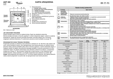 AKP 400 KARTA URZĄDZENIA GB PL 1. Panel sterowania 1.1. 1.2. 1.3. 1.4. Ostatni poziom Pierwszy poziom Pokrętło wyboru funkcji Programator czasu trwania pieczenia Pokrętło termostatu Czerwona kontrolka termostatu 2. Wentylator chłodzący (niewidoczny) 3. Grzałka górna 4. Element grzewczy grilla/Element grzewczy grilla (regulowany) 5. Tylna żarówka piekarnika 6. Wentylator 7. Grzałka dolna (niewidoczna) 8. Zimne drzwiczki piekarnika Funkcja 0 Opis funkcji PIEKARNIK WYŁĄCZONY OŚWIETLENIE PIEKARNIKA FUNKCJA STATYCZNA • Włączenie wewnętrznej żarówki piekarnika. • • • Do gotowania mięsa, ryb i drobiu na półce. Podgrzać piekarnik do żądanej temperatury i, po zgaśnięciu czerwonej kontrolki termostatu, włożyć potrawę do piekarnika. Zaleca się używanie półek na drugim lub trzecim poziomie. Do pieczenia na maks. 2 półkach. W razie potrzeby, zaleca się zmieniać pozycję potrawy, co zapewni jej równomierne pieczenie. Nie trzeba podgrzewać piekarnika (z wyjątkiem pizzy i słonych ciast). Do pieczenia kawałków mięsa, szaszłyków, kiełbasek oraz na rożnie, do zapiekania warzyw oraz do przyrumieniania chleba. Podgrzewać piekarnik przez 3-5 min. Podczas pieczenia, drzwi piekarnika muszą być zamknięte. Podczas pieczenia mięsa, dolać nieco wody do tacki na pierwszej półce, co zmniejszy ilość dymu i rozpryskiwanie się tłuszczu. Zaleca się obracać potrawę w czasie gotowania. Do grillowania dużych kawałków mięsa (rostbef, pieczenie). Podczas pieczenia, drzwi piekarnika muszą być zamknięte. Podczas pieczenia mięsa, dolać nieco wody do tacki na pierwszej półce, co zmniejszy ilość dymu i rozpryskiwanie się tłuszczu. Obracać mięso w czasie pieczenia. • • Do rozmrażania żywności w temperaturze otoczenia. Pozostawić potrawę w opakowaniu, aby uniknąć wysuszenia. TERMOOBIEG • • • • • GRILL • • • TURBOGRILL ROZMRAŻANIE • • • • Półka od dołu Temperatura (°C) Czas pieczenia min. Baranina/cielęcina/wołowina/wieprzowina 2 190-210 90-110 Kurczak/królik/kaczka 2 190-200 65-85 Indyk/gęś 2 190-200 140-180 POTRAWY PROGRAMATOR CZASU TRWANIA PIECZENIA Programator pozwala na ustawienie czasu pieczenia w zakresie od 1 do 120 minut, (aby ustawić 120 minut, obrócić pokrętło do oporu). Aby zaprogramować czas trwania pieczenia, po wybraniu funkcji pieczenia należy wykonać pokrętłem pełny obrót w kierunku zgodnym z ruchem wskazówek zegara, a następnie ustawić na żądany czas pieczenia obracając pokrętłem w kierunku przeciwnym do ruchu wskazówek zegara. Po upływie ustawionego czasu pieczenia, piekarnik się wyłącza, a programator znajduje się w pozycji "0". Aby korzystać z piekarnika w trybie ręcznym, tj. bez ustawiania czasu trwania pieczenia, należy sprawdzić, czy pokrętło programatora jest ustawione na symbolu . Uwaga: Jeśli programator jest ustawiony na “0”, nie można włączyć piekarnika. Aby włączyć piekarnik, należy ustawić programator na symbol lub zaprogramować czas trwania pieczenia. Funkcja Ryby 2 180-200 50-60 Faszerowane pomidory i papryki/pieczone ziemniaki 2 180-200 50-60 Ciasta drożdżowe 2 170-180 45-55 Ciasta z nadzieniem 2 180-200 60-90 Biszkopty 2 170-180 35-45 Lasagna 2 190-200 45-55 Chleb/pizza 2 200-225 40-50/15-18 Tosty 3/4 250 1,5-2,5 Kotlety/kiełbaski/szaszłyki 3/4 250 35-45 Zapiekane warzywa 3 250 5-8 1/2 kurczaka 3 250 40-50 Kurczak w całości 2/3 200-225 55-65 Rostbef 2 200-250 35-45 Pieczeń 2/3 200-225 60-70 Ryby (w całości) 3 190-200 40-50 Uwaga: temperatura i czas pieczenia są podane orientacyjnie dla 4 porcji. 5019 310 01094 PL Tabela funkcji piekarnika AKCESORIA Grill - Blacha do ciast JAK URUCHOMIĆ PIEKARNIK Ustawić pokrętło wyboru funkcji na żądaną funkcję. Zapali się oświetlenie piekarnika. Obrócić pokrętło termostatu w kierunku zgodnym z ruchem wskazówek zegara i ustawić na żądanej temperaturze. Zapala się czerwona kontrolka termostatu: kontrolka wyłączy się w momencie osiągnięcia wybranej temperatury. Po zakończeniu pieczenia obrócić pokrętła na pozycję “0”. IT
