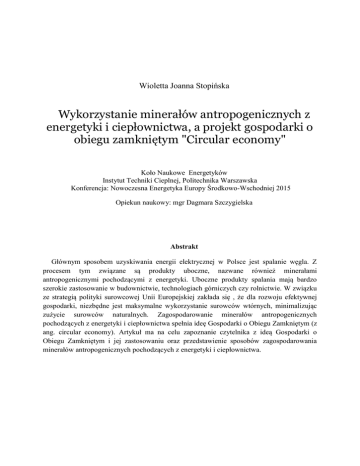 Wioletta Joanna Stopińska Wykorzystanie minerałów antropogenicznych z energetyki i ciepłownictwa, a projekt gospodarki o obiegu zamkniętym "Circular economy" Koło Naukowe Energetyków Instytut Techniki Cieplnej, Politechnika Warszawska Konferencja: Nowoczesna Energetyka Europy Środkowo-Wschodniej 2015 Opiekun naukowy: mgr Dagmara Szczygielska Abstrakt Głównym sposobem uzyskiwania energii elektrycznej w Polsce jest spalanie węgla. Z procesem tym związane są produkty uboczne, nazwane również minerałami antropogenicznymi pochodzącymi z energetyki. Uboczne produkty spalania mają bardzo szerokie zastosowanie w budownictwie, technologiach górniczych czy rolnictwie. W związku ze strategią polityki surowcowej Unii Europejskiej zakłada się , że dla rozwoju efektywnej gospodarki, niezbędne jest maksymalne wykorzystanie surowców wtórnych, minimalizując zużycie surowców naturalnych. Zagospodarowanie minerałów antropogenicznych pochodzących z energetyki i ciepłownictwa spełnia ideę Gospodarki o Obiegu Zamkniętym (z ang. circular economy). Artykuł ma na celu zapoznanie czytelnika z ideą Gospodarki o Obiegu Zamkniętym i jej zastosowaniu oraz przedstawienie sposobów zagospodarowania minerałów antropogenicznych pochodzących z energetyki i ciepłownictwa. Nowoczesna Energetyka Europy Środkowo-Wschodniej 2015 Minerały antropogeniczne (MA) pochodzą z energetyki lub ciepłownictwa, tradycyjnie nazywamy je produktami ubocznymi powstałymi w procesie energetycznego spalania węgla. Do tego rodzaju minerałów, zwanych także ubocznymi produktami spalania (UPS), zaliczamy: żużel i popioły lotne z węgla, popioły paleniskowe, popioły lotne i denne z kotłów fluidalnych, mieszanki popiołowo – żużlowe, pyły z kotłów oraz produkty odsiarczania spalin. Minerał antropogeniczny jest cennym produktem ze względu na swoje właściwości, dzięki temu jest on wykorzystywany w gospodarce do realizacji projektów budowlanych. UPS , zgodnie z Rozporządzeniem Ministra Środowiska z dnia 27 września 2001 roku w sprawie Katalogu Odpadów, są zaliczane do odpadów grupy 10 – „Odpady z procesów termicznych”. Uboczne Produkty Spalania nie są jednak uznawane jako odpady, jeżeli nie zostaną składowane. Status odpadu nie mają produkty, które mogą być wykorzystywane bezpośrednio bez dalszego przetwarzania a jeżeli są poddawane procesowi odzysku, muszą one spełniać następujące warunki: po recyklingu stanowią materiał powszechnie stosowany, na który istnieje popyt, spełniają normy i wymagania techniczne właściwej sobie kategorii produktów oraz nie mają negatywnego wpływu na środowisko oraz życie i zdrowie ludzi. Koszty składowania ubocznych produktów spalania są stosunkowo wysokie i szacuje się je na około 50zł za tonę. W wyniku spalenia jednej tony węgla powstaje około 250 kg popiołów i żużli, szacuje się iż rocznie w Polsce powstaje 20 ton, a w krajach członkowskich Unii Europejskiej 150 ton. Tak duży udział w produkcji ubocznych produktów spalania Polski wiążę się ze strukturą polskiej energetyki, w której to około 80% wyprodukowanej energii pochodzi z węgla. W związku ze znacznymi kosztami składowania oraz negatywnymi skutkami w środowisku naturalnym, zaczęto prowadzić politykę ekologiczną mającą na celu jak najbardziej efektywne zagospodarowanie odpadów. Polityka surowcowa zakłada najefektywniejszy sposób wykorzystania surowców wtórnych. W związku z programem Unii Europejskiej „Europa 2020”, którego celem jest wzrost gospodarczy uzyskany poprzez edukację i badania, a także świadome dążenie do rozwoju. W związku z tym powstały liczne prace pozwalające na lepsze wykorzystanie zasobów. Strategia polityki surowcowej Unii Europejskiej przewiduje, że dla rozwoju innowacyjnej i efektywnej gospodarki, niezbędne jest maksymalne wykorzystanie w pierwszej kolejności surowców wtórnych, minimalizując zużycie surowców naturalnych. Taką oto koncepcję wykorzystywania zasobów ma pojęcie „circular economy”. Idea Gospodarki o Obiegu Zamkniętym to koncepcja zakładająca minimalizację wpływu na środowisko tworzonych produktów poprzez taki wybór składników i projektowanie, który umożliwi powtórne ich wykorzystanie. Z gospodarką o Obiegu zamkniętym związane jest także pojęcie cradle-to-cradle. Jest to sposób projektowania i produkcji przedmiotów zgodnie z koncepcją zrównoważonego rozwoju tak, by po zakończeniu ich użytkowania, można je było włączyć do ponownego obiegu. Wpisując się w ten model gospodarowania zasobami trzeba inteligentne i jak najlepiej wykorzystać minerały antropogeniczne, za pomocą różnych procesów, w których mamy możliwość wielokrotne użycie surowca. 2 Nowoczesna Energetyka Europy Środkowo-Wschodniej 2015 Gospodarka o obiegu zamkniętym stawia przed sektorem energetycznym ogromne wyzwanie, żeby móc w pełni wykorzystać potencjał jak mają w sobie uboczne produkty spalania trzeba zapewnić odpowiednie warunki gospodarcze. Po pierwsze, należy wykonać szczegółowy spis zasobów surowców antropogenicznych Polski, jest to bowiem konieczne do właściwego określenia możliwości tego sektora. Uzyskanie pełnych danych o ilości wytwarzanego w Polsce UPS oraz tego ile zalega na składowiskach, jaka jest ich lokalizacja i ich jakość jest potrzebne do optymalizacji możliwości wykorzystania minerałów antropogenicznych. Kolejnym zadaniem jest określenie oraz opracowanie obszarów, w których możliwe jest zastąpienie surowców naturalny przez minerały antropogeniczne. W celu osiągniecia założeń „circular economy” potrzeba współpracy pomiędzy rządem a sektorem energetycznym. Konieczne jest wdrażanie nowych pomysłów i zmiana sposobu opracowywania wymogów, które muszą spełniać przedsiębiorcy wykorzystujący surowce wtórne. Bez prowadzenia badań i opracowania nowych technologii produkcji materiałó