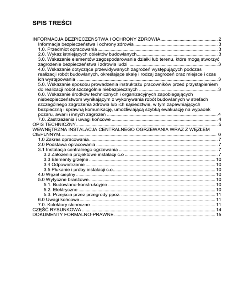 SPIS TREŚCI INFORMACJA BEZPIECZEŃSTWA I OCHRONY ZDROWIA ................................................ 2 Informacja bezpieczeństwa i ochrony zdrowia ...................................................................... 3 1.0. Przedmiot opracowania ..................................................................................................... 3 2.0. Wykaz istniejących obiektów budowlanych.................................................................... 3 3.0. Wskazanie elementów zagospodarowania działki lub terenu, które mogą stworzyć zagrożenie bezpieczeństwa i zdrowia ludzi .......................................................................... 3 4.0. Wskazanie dotyczące przewidywanych zagrożeń występujących podczas realizacji robót budowlanych, określające skalę i rodzaj zagrożeń oraz miejsce i czas ich występowania ...................................................................................................................... 3 5.0. Wskazanie sposobu prowadzenia instruktażu pracowników przed przystąpieniem do realizacji robót szczególnie niebezpiecznych .................................................................. 3 6.0. Wskazanie środków technicznych i organizacyjnych zapobiegających niebezpieczeństwom wynikającym z wykonywania robót budowlanych w strefach szczególnego zagrożenia zdrowia lub ich sąsiedztwie, w tym zapewniających bezpieczną i sprawną komunikację, umożliwiającą szybką ewakuację na wypadek pożaru, awarii i innych zagrożeń ............................................................................................. 4 7.0. Zastrzeżenia i uwagi końcowe ......................................................................................... 4 OPIS TECHNICZNY ....................................................................................................................... 5 WEWNĘTRZNA INSTALACJA CENTRALNEGO OGRZEWANIA WRAZ Z WĘZŁEM CIEPLNNYM. .................................................................................................................................. 6 1.0 Zakres opracowania ............................................................................................................ 7 2.0 Podstawa opracowania ...................................................................................................... 7 3.1 Instalacja centralnego ogrzewania ................................................................................... 7 3.2 Założenia projektowe instalacji c.o .............................................................................. 7 3.3 Elementy grzejne .......................................................................................................... 10 3.4 Odpowietrzenie ............................................................................................................. 10 3.5 Płukanie i próby instalacji c.o ...................................................................................... 10 4.0 Węzeł cieplny ..................................................................................................................... 10 5.0 Wytyczne branżowe .......................................................................................................... 10 5.1. Budowlano-konstrukcyjne .......................................................................................... 10 5.2. Elektryczne ................................................................................................................... 10 5.3. Przejścia przez przegrody ppoż. ............................................................................... 11 6.0 Uwagi końcowe .................................................................................................................. 11 7.0. Kolektory słoneczne ......................................................................................................... 11 CZĘŚĆ RYSUNKOWA ................................................................................................................ 14 DOKUMENTY FORMALNO-PRAWNE ..................................................................................... 15 INFORMACJA BEZPIECZEŃSTWA I OCHRONY ZDROWIA projektant instalacje sanitarne: mgr inż. Daniel Wiśniewski upr.nr KUP/0152/PWOS/13 w specjalności instalacje sanitarne bez ograniczeń INFORMACJA BEZPIECZEŃSTWA I OCHRONY ZDROWIA. 1.0. 1.0. PRZEDMIOT OPRACOWANIA. Przedmiotem niniejszego opracowania jest informacja BIOZ remontowanej instalacji centralnego ogrzewania w istniejącym budynku. Opracowanie sporządzone na podstawie rozporządzenie ministra infrastruktury z dnia 23 czerwca 2003 r. w sprawie informacji dotyczącej bezpieczeństwa i ochrony zdrowia oraz planu bezpieczeństwa i ochrony zdrowia (Dz. U. Nr 120, poz. 1126). 2.0. WYKAZ ISTNIEJĄCYCH OBIEKTÓW BUDOWLANYCH. Istniejący budynek w którym projektuje się remont instalacji centralnego ogrzewania. 3.0. WSKAZANIE ELEMENTÓW ZAGOSPODAROWANIA DZIAŁKI LUB TERENU, KTÓRE MOGĄ STWORZYĆ ZAGROŻENIE BEZPIECZEŃSTWA I ZDROWIA LUDZI. Brak. 4.0. WSKAZANIE DOTYCZĄCE PRZEWIDYWANYCH ZAGROŻEŃ WYSTĘPUJĄCYCH PODCZAS REALIZACJI ROBÓT BUDOWLANYCH, OKREŚLAJĄCE SKALĘ I RODZAJ ZAGROŻEŃ ORAZ MIEJSCE I CZAS ICH WYSTĘPOWANIA. Przy realizacji zadania inwestycyjnego przewiduje się następujące zagrożenia: -upadek materiału budowlanego lub sprzętu z wyższych kondygnacji; -upadek pracowników z wysokości; -pożar, zalanie, itp.; -niewłaściwy sposób magazynowania materiałów skutkujący katastrofą budowlaną; -nieodpowiednia jakość użytych materiałów skutkująca katastrofą budowlaną; -błędy wykonawcze (w tym w odczycie projektu) skutkujące katastrofą budowlaną; -awarie sprzętu skutkujące katastrofą budowlaną, zranieniem pracowników, porażeniem prądem, itp.; -kolizje środków transportu na placu budowy; -przebywanie osób postronnych, niezwiązanych z przedsięwzięciem budowlanym, na terenie budowy. 5.0