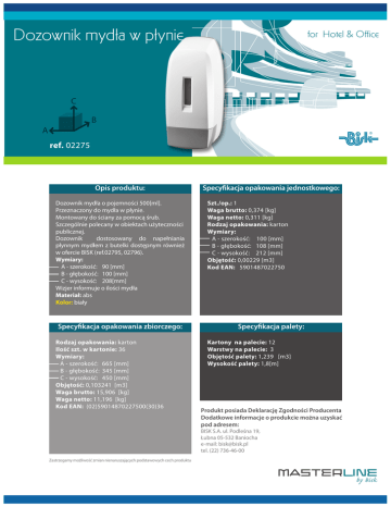 Dozownik mydła w płynie ref. 02275 Opis produktu: Dozownik mydła o pojemności 500[ml]. Przeznaczony do mydła w płynie. Montowany do ściany za pomocą śrub. Szczególnie polecany w obiektach użyteczności publicznej. Dozownik dostosowany do napełniania płynnym mydłem z butelki dostępnym również w ofercie BISK (ref.02795, 02796). Wymiary: A - szerokość: 90 [mm] B - głębokość: 100 [mm] C - wysokość: 208[mm] Wizjer informuje o ilości mydła Materiał: abs Kolor: biały Specyfikacja opakowania zbiorczego: Rodzaj opakowania: karton Ilość szt. w kartonie: 36 Wymiary: A - szerokość: 665 [mm] B - głębokość: 345 [mm] C - wysokość: 450 [mm] Objętość: 0,103241 [m3] Waga brutto: 15,906 [kg] Waga netto: 11,196 [kg] Kod EAN: (02)59014870227500(30)36 Specyfikacja opakowania jednostkowego: Szt./op.: 1 Waga brutto: 0,374 [kg] Waga netto: 0,311 [kg] Rodzaj opakowania: karton Wymiary: A - szerokość: 100 [mm] B - głębokość: 108 [mm] C - wysokość: 212 [mm] Objętość: 0,00229 [m3] Kod EAN: 5901487022750 Specyfikacja palety: Kartony na palecie: 12 Warstwy na palecie: 3 Objętość palety: 1,239 [m3] Wysokość palety: 1,8[m] Produkt posiada Deklarację Zgodności Producenta Dodatkowe informacje o produkcie można uzyskać pod adresem: BISK S.A. ul. Podleśna 19, Łubna 05-532 Baniocha e-mail: [email protected] tel. (22) 736-46-00 Zastrzegamy możliwość zmian nienaruszających podstawowych cech produktu