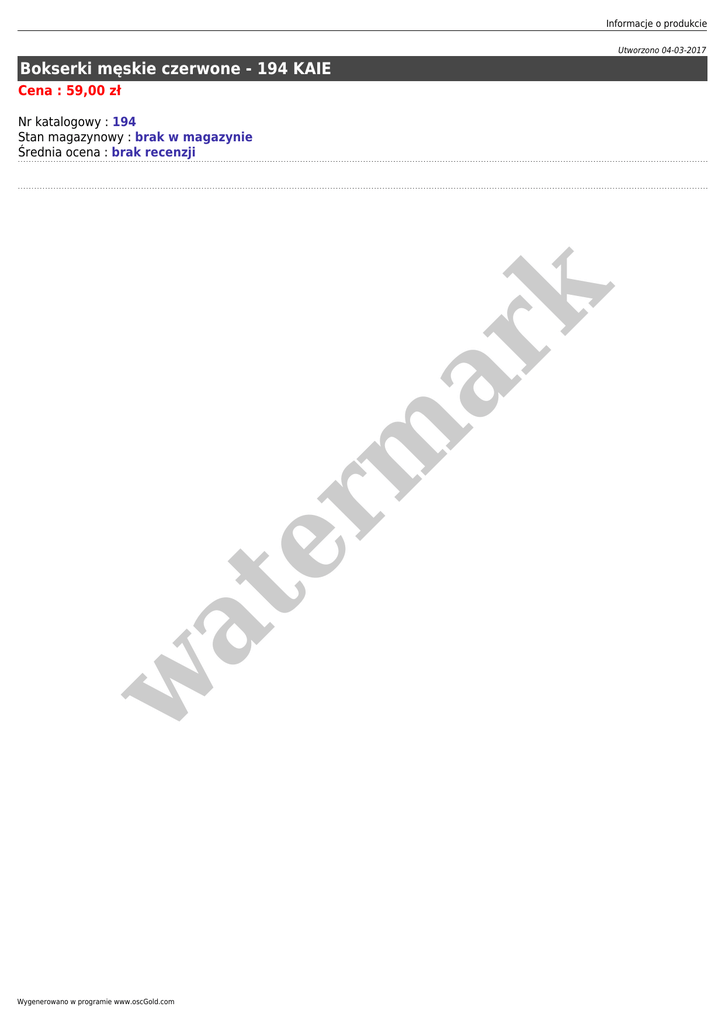 Informacje o produkcie Utworzono 04-03-2017 Bokserki męskie czerwone - 194 KAIE Cena : 59,00 zł w at er m ar k Nr katalogowy : 194 Stan magazynowy : brak w magazynie Średnia ocena : brak recenzji Wygenerowano w programie www.oscGold.com