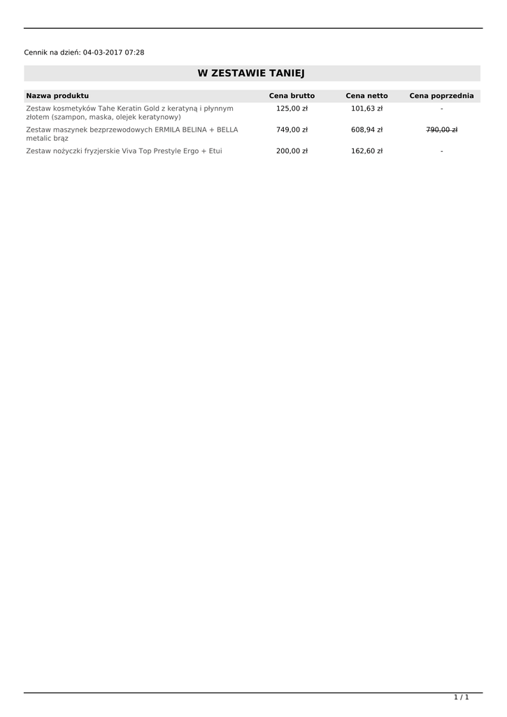 Cennik na dzień: 04-03-2017 07:28 W ZESTAWIE TANIEJ Nazwa produktu Cena brutto Cena netto Cena poprzednia Zestaw kosmetyków Tahe Keratin Gold z keratyną i płynnym złotem (szampon, maska, olejek keratynowy) 125,00 zł 101,63 zł - Zestaw maszynek bezprzewodowych ERMILA BELINA + BELLA metalic brąz 749,00 zł 608,94 zł 790,00 zł Zestaw nożyczki fryzjerskie Viva Top Prestyle Ergo + Etui 200,00 zł 162,60 zł - 1/1 Powered by TCPDF (www.tcpdf.org)