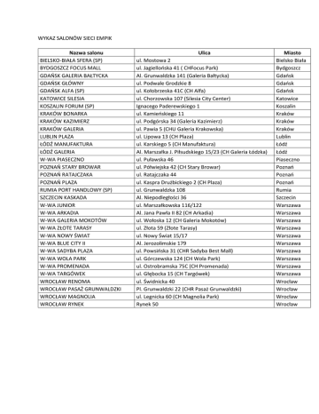 WYKAZ SALONÓW SIECI EMPIK Nazwa salonu BIELSKO-BIAŁA SFERA (SP) BYDGOSZCZ FOCUS MALL GDAŃSK GALERIA BAŁTYCKA GDAŃSK GŁÓWNY GDAŃSK ALFA (SP) KATOWICE SILESIA KOSZALIN FORUM (SP) KRAKÓW BONARKA KRAKÓW KAZIMIERZ KRAKÓW GALERIA LUBLIN PLAZA ŁÓDŹ MANUFAKTURA ŁÓDŹ GALERIA W-WA PIASECZNO POZNAŃ STARY BROWAR POZNAŃ RATAJCZAKA POZNAŃ PLAZA RUMIA PORT HANDLOWY (SP) SZCZECIN KASKADA W-WA JUNIOR W-WA ARKADIA W-WA GALERIA MOKOTÓW W-WA ZŁOTE TARASY W-WA NOWY ŚWIAT W-WA BLUE CITY II W-WA SADYBA PLAZA W-WA WOLA PARK W-WA PROMENADA W-WA TARGÓWEK WROCŁAW RENOMA WROCŁAW PASAŻ GRUNWALDZKI WROCŁAW MAGNOLIA WROCŁAW RYNEK Ulica ul. Mostowa 2 ul. Jagiellońska 41 ( CHFocus Park) Al. Grunwaldzka 141 (Galeria Bałtycka) ul. Podwale Grodzkie 8 ul. Kołobrzeska 41C (CH Alfa) ul. Chorzowska 107 (Silesia City Center) Ignacego Paderewskiego 1 ul. Kamieńskiego 11 ul. Podgórska 34 (Galeria Kazimierz) ul. Pawia 5 (CHU Galeria Krakowska) ul. Lipowa 13 (CH Plaza) ul. Karskiego 5 (CH Manufaktura) Al. Marszałka J. Piłsudskiego 15/23 (CH Galeria Łódzka) ul. Puławska 46 ul. Półwiejska 42 (CH Stary Browar) ul. Ratajczaka 44 ul. Kaspra Drużbickiego 2 (CH Plaza) ul. Grunwaldzka 108 Al. Niepodległości 36 ul. Marszałkowska 116/122 Al. Jana Pawła II 82 (CH Arkadia) ul. Wołoska 12 (CH Galeria Mokotów) ul. Złota 59 (Złote Tarasy) ul. Nowy Świat 15/17 Al. Jerozolimskie 179 ul. Powsińska 31 (CHR Sadyba Best Mall) ul. Górczewska 124 (CH Wola Park) ul. Ostrobramska 75C (CH Promenada) ul. Głębocka 15 (CH Targówek) ul. Świdnicka 40 Pl. Grunwaldzki 22 (CHR Pasaż Grunwaldzki) ul. Legnicka 60 (CH Magnolia Park) Rynek 50 Miasto Bielsko Biała Bydgoszcz Gdańsk Gdańsk Gdańsk Katowice Koszalin Kraków Kraków Kraków Lublin Łódź Łódź Piaseczno Poznań Poznań Poznań Rumia Szczecin Warszawa Warszawa Warszawa Warszawa Warszawa Warszawa Warszawa Warszawa Warszawa Warszawa Wrocław Wrocław Wrocław Wrocław