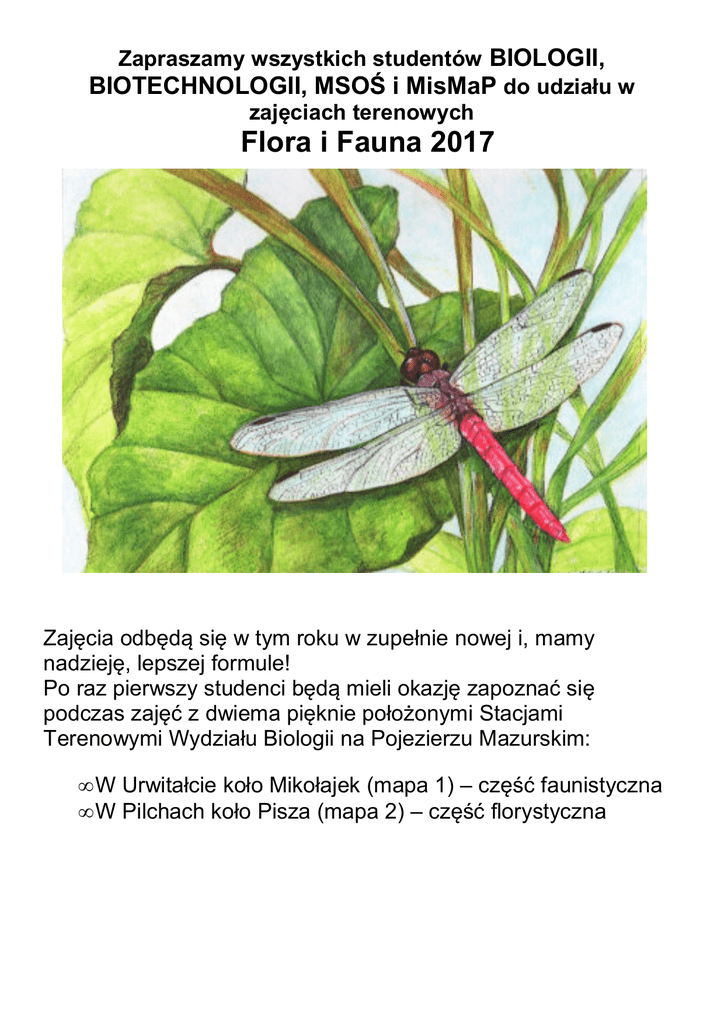 Zapraszamy wszystkich studentów BIOLOGII, BIOTECHNOLOGII, MSOŚ i MisMaP do udziału w zajęciach terenowych Flora i Fauna 2017 Zajęcia odbędą się w tym roku w zupełnie nowej i, mamy nadzieję, lepszej formule! Po raz pierwszy studenci będą mieli okazję zapoznać się podczas zajęć z dwiema pięknie położonymi Stacjami Terenowymi Wydziału Biologii na Pojezierzu Mazurskim: • W Urwitałcie koło Mikołajek (mapa 1) – część faunistyczna • W Pilchach koło Pisza (mapa 2) – część florystyczna Do Pilch Do Warszawy Do Urwitałtu Do Warszawy Zorganizowane zostaną trzy grupy, limit liczebności na każdej to 24 osoby: 1. Flora w Pilchach 12.06-17.06 a potem Fauna w Urwitałcie (19.06-24.06) 2. Fauna w Urwitałcie 12.06-17.06 a potem Flora w Pilchach (19.06-24.06) 3. Flora w Pilchach 26.06-1.07 a potem Fauna w Urwitałcie (3.07-8.07) Wszystkie zajęcia rozpoczynają się od obowiązkowego zebrania w niedzielę poprzedzającą rozpoczęcie zajęć ok. 1900 . Niedziela kończąca zajęcia jest dniem wolnym od zajęć dla studentów, którzy zaliczyli sprawdzian w sobotę. Studenci powinni we własnym zakresie dotrzeć do Mikołajek (Urwitałt) lub Pisza (Pilchy), pociągiem lub autobusem i zachować bilet (Wydział pokrywa koszty przejazdu w obie strony na podstawie biletu II klasy) można także przyjechać taksówka lub własnym samochodem ale wtedy na własny koszt. W niedzielę kończącą pierwszy tydzień zajęć należy przenieść się z jednej stacji do drugiej (ok. 60 km.). Transport dla studentów na trasie Mikołajki-UrwitałtPichy-Pisz i z powrotem zapewni Wydział wynajętym autobusem. • Ocena końcowa z zajęć jest oceną egzaminacyjną. • Wydział pokrywa koszty noclegów na stacji • Na miejscu można wykupić niedrogie obiady - bardzo do tego zachęcamy bo w znacznym stopniu usprawni to pracę. • W zajęciach mogą uczestniczyć studenci, którzy potwierdzą swój udział w nich do 14 maja (studenci Wydziału Biologii osobiście lub mailowo, studenci MISMAP i MSOŚ wyłącznie osobiście – poniedziałki i wtorki 10.00-12.00, CNBCh, Żwirki i Wigury 101, pokój 5.17). • Uczestnicy, którym zależy na konkretnym terminie wyjazdu proszeni są o zgłoszenie tego osobiście w dniach 20,21 lutego w godzinach 9.00-11.00, CNBCh, Żwirki i Wigury 101, pokój 5.17. • Ewentualna rezygnacja z udziału w zajęciach powinna zostać zgłoszona organizatorom najpóźniej na dwa tygodnie przed rozpoczęciem zajęć a więc do 25 maja. Nie zgłoszenie się na zajęcia lub rezygnacja po tym terminie skutkuje automatycznym wnioskiem koordynatora zajęć o wpisanie „dwui dziekańskiej” z tego przedmiotu, ponadto grożą konsekwencje opisane w regulaminie studiów. Przypominam o konieczności wzięcia ze sobą na ćwiczenia: śpiwora, kaloszy i ubrań przeciwdeszczowych. Podręczniki i sprzęt terenowy zapewniane są przez prowadzących. Mile widziane będzie zabranie na zajęcia lornetki oraz przewodników i atlasów do oznaczania roślin i zwierząt. dr hab. Paweł Koperski 5526538, [email protected] Tematyka zajęć Flora i Fauna obejmuje: Podstawy biologii, ekologii, systematyki i oznaczania: • • • • • Lądowych bezkręgowców: owadów, pajęczaków i ślimaków Wodnych bezkręgowców Kręgowców: ptaków, ryb i płazów Roślin łąk, lasów i torfowisk Roślin wodnych i synantropijnych Studenci mieszkają w pokojach o różnym standardzie i „pojemności” na terenie stacji. W trakcie zajęć studenci uczestniczą w wycieczkach terenowych i wykładach, zbierają i hodują materiał na ćwiczenia, uczą się pracy w terenie a także korzystania z piśmiennictwa i programów komputerowych. Poszczególne części zajęć kończą się sprawdzianami. W trakcie zajęć faunistycznych, o ile nie jest to absolutnie konieczne, zwierzęta nie są uśmiercane. Prowadzący i organizatorzy ćwiczeń to pracownicy Instytutu Botaniki i Instytutu Zoologii: • • • • Zakład Filogenetyki Molekularnej i Ewolucji Zakładu Ekologii Roślin i Ochrony Środowiska Zakładu Ekologii Zakładu Hydrobiologii