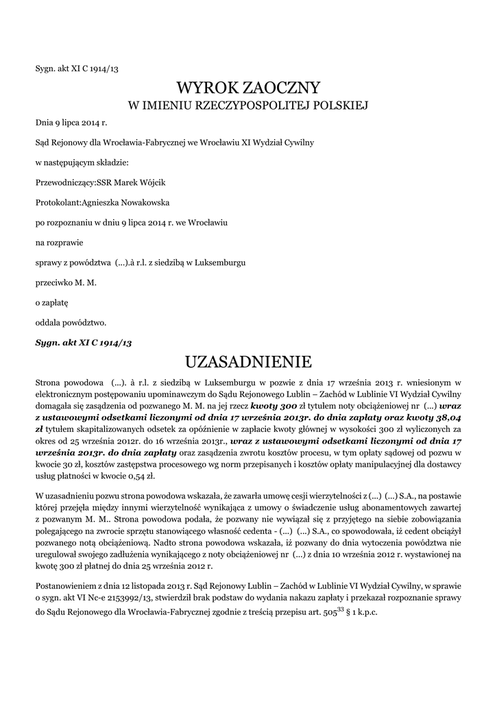 Sygn. akt XI C 1914/13 WYROK ZAOCZNY W IMIENIU RZECZYPOSPOLITEJ POLSKIEJ Dnia 9 lipca 2014 r. Sąd Rejonowy dla Wrocławia-Fabrycznej we Wrocławiu XI Wydział Cywilny w następującym składzie: Przewodniczący:SSR Marek Wójcik Protokolant:Agnieszka Nowakowska po rozpoznaniu w dniu 9 lipca 2014 r. we Wrocławiu na rozprawie sprawy z powództwa (...).à r.l. z siedzibą w Luksemburgu przeciwko M. M. o zapłatę oddala powództwo. Sygn. akt XI C 1914/13 UZASADNIENIE Strona powodowa (...). à r.l. z siedzibą w Luksemburgu w pozwie z dnia 17 września 2013 r. wniesionym w elektronicznym postępowaniu upominawczym do Sądu Rejonowego Lublin – Zachód w Lublinie VI Wydział Cywilny domagała się zasądzenia od pozwanego M. M. na jej rzecz kwoty 300 zł tytułem noty obciążeniowej nr (...) wraz z ustawowymi odsetkami liczonymi od dnia 17 września 2013r. do dnia zapłaty oraz kwoty 38,04 zł tytułem skapitalizowanych odsetek za opóźnienie w zapłacie kwoty głównej w wysokości 300 zł wyliczonych za okres od 25 września 2012r. do 16 września 2013r., wraz z ustawowymi odsetkami liczonymi od dnia 17 września 2013r. do dnia zapłaty oraz zasądzenia zwrotu kosztów procesu, w tym opłaty sądowej od pozwu w kwocie 30 zł, kosztów zastępstwa procesowego wg norm przepisanych i kosztów opłaty manipulacyjnej dla dostawcy usług płatności w kwocie 0,54 zł. W uzasadnieniu pozwu strona powodowa wskazała, że zawarła umowę cesji wierzytelności z (...) (...) S.A., na postawie której przejęła między innymi wierzytelność wynikająca z umowy o świadczenie usług abonamentowych zawartej z pozwanym M. M.. Strona powodowa podała, że pozwany nie wywiązał się z przyjętego na siebie zobowiązania polegającego na zwrocie sprzętu stanowiącego własność cedenta - (...) (...) S.A., co spowodowała, iż cedent obciążył pozwanego notą obciążeniową. Nadto strona powodowa wskazała, iż pozwany do dnia wytoczenia powództwa nie uregulował swojego zadłużenia wynikającego z noty obciążeniowej nr (...) z dnia 10 września 2012 r. wystawionej na kwotę 300 zł płatnej do dnia 25 września 2012 r. Postanowieniem z dnia 12 listopada 2013 r. Sąd Rejonowy Lublin – Zachód w Lublinie VI Wydział Cywilny, w sprawie o sygn. akt VI Nc-e 2153992/13, stwierdził brak podstaw do wydania nakazu zapłaty i przekazał rozpoznanie sprawy do Sądu Rejonowego dla Wrocławia-Fabrycznej zgodnie z treścią przepisu art. 50533 § 1 k.p.c. Po przekazaniu sprawy do rozpoznania sądowi właściwości ogólnej, w uzupełnieniu braków formalnych pozwu strona powodowa złożyła pozew na urzędowym formularzu oznaczonym symbolem ,,P. W pozwie wniesionym na urzędowym formularzu strona powodowa rozszerzyła żądanie w zakresie ustawowych odsetek liczonych od kwoty 300 zł wnosząc o ich zasądzenie od tej kwoty od dnia 26 września 2012r. do dnia zapłaty. Sąd jednak uznał za niedopuszczalne rozszerzenie powództwa dokonane pozwem wniesionym na urzędowym formularzu oznaczonym symbolem ,,P w zakresie ustawowych odsetek liczonych od kwoty 300 zł od dnia 26 września 2012r. do dnia 16 września 2013r., albowiem w postępowaniu uproszczonym zmiana powództwa jest niedopuszczalna ( art. 5054 § 1 k.p.c.). Pozwany M. M. mimo prawidłowego wezwania nie stawił się na pierwszą rozprawę, nie żądał przeprowadzenia rozprawy w swojej nieobecności ani też nie składał w sprawie wyjaśnienia ustnie lub na piśmie (nie złożył odpowiedzi na pozew). Sąd ustalił następujący stan faktyczny: W dniu 10 września 2012 r.(...) (...) S.A. w W. wystawił notę księgową nr (...) wobec pozwanego M. M. na kwotę 300 zł tytułem odszkodowania za niezwrócony sprzęt: karta cyfrowa i terminal cyfrowy SD. (dowód: - kopia noty obciążeniowej nr (...), k.21) W dniu 28 września 2012 r. (...) (...) S.A. w W. (cedent) zawarła ze strona powodową (...).à r.l. z siedzibą w Luksemburgu (cesjonariusz) umowę szczegółową. Zgodnie z art.1 ust.1 powyższej umowy strony ustaliły, że na podstawie Umowy sprzedaży wierzytelności z dnia 18 grudnia 2009r. i prowadzonych negocjacji, postanowieniami niniejszej umowy objęte zostały wierzytelności wskazane w Liście Wierzytelności stanowiącej załącznik nr 1 do umowy, które są bezoporne i wymagalne ( art.1 ust.2). Spółka (...) + (...) S.A. w W. zobowiązała się do dostarczenia stronie powodowej not obciążeniowych we wskazanym w umowie terminie ( art.2 ust.3), natomiast strona powodowa do zawiadamiania dłużników o nabyciu wierzytelności względem nich od Spółki (...) + (...) S.A. ( art.5 ust.2). Ponadto w art. 6 przedmiotowej umowy ustalono, że w zakresie nią nieuregulowanym zastosowanie znajdują postanowienia Umowy sprzedaży wierzytelności z dnia 18 grudnia 2009r. ( dowód: - umowa szczegółowa z dnia 28.09.2012 r., k. 14 verte) (...).à r.l. z siedzibą w Luksemburgu sporządziło zawiadomienie o cesji wierzytelności skierowane do M. M., w którym poinformowano go o przelaniu wierzytelności przysługujących wobec niego z tytułu nieuregulowanych należności w wysokości 300 zł wraz z wszelkimi związanymi z nią prawami na rzecz strony powodowej (...).à r.l. z siedzibą w Luksemburgu. ( dowód: - zawiadomienie, k. 19 verte) Sporządzony został częściowy wykaz wierzytelności do Umowy o przelew wierzytelności z dnia 28 września 2012r. pomiędzy(...) (...) S.A. z siedzibą w W. oraz (...). à r.l. z siedzibą w Luksemburgu, gdzie wskazano m. in. numer konta, imię i nazwisko pozwanego, jego adres zamieszkania, wysokość zadłużenia, numer oraz datę noty obciążeniowej, a także datę płatności. ( dowód: - częściowy wykaz wierzytelności do Umowy o przelew wierzytelności z dnia 28 września 2012r., k. 20) Strona powodowa (...).à r.l. z siedzibą w Luksemburgu jest zagraniczną osobą prawną wpisaną od dnia 22 lutego 2007r. do Rejestru Handlowego i Spółek w Luksemburgu pod numerem (...), która działa w form