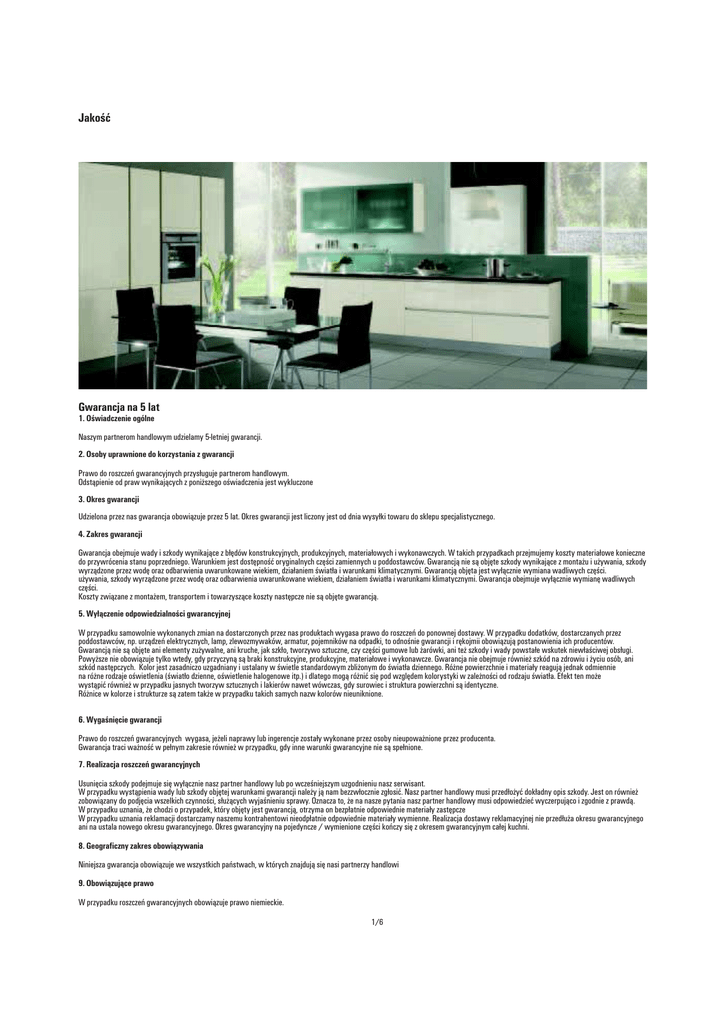 Jakość Gwarancja na 5 lat 1. Oświadczenie ogólne Naszym partnerom handlowym udzielamy 5-letniej gwarancji. 2. Osoby uprawnione do korzystania z gwarancji Prawo do roszczeń gwarancyjnych przysługuje partnerom handlowym. Odstąpienie od praw wynikających z poniższego oświadczenia jest wykluczone 3. Okres gwarancji Udzielona przez nas gwarancja obowiązuje przez 5 lat. Okres gwarancji jest liczony jest od dnia wysyłki towaru do sklepu specjalistycznego. 4. Zakres gwarancji Gwarancja obejmuje wady i szkody wynikające z błędów konstrukcyjnych, produkcyjnych, materiałowych i wykonawczych. W takich przypadkach przejmujemy koszty materiałowe konieczne do przywrócenia stanu poprzedniego. Warunkiem jest dostępność oryginalnych części zamiennych u poddostawców. Gwarancją nie są objęte szkody wynikające z montażu i używania, szkody wyrządzone przez wodę oraz odbarwienia uwarunkowane wiekiem, działaniem światła i warunkami klimatycznymi. Gwarancją objęta jest wyłącznie wymiana wadliwych części. używania, szkody wyrządzone przez wodę oraz odbarwienia uwarunkowane wiekiem, działaniem światła i warunkami klimatycznymi. Gwarancja obejmuje wyłącznie wymianę wadliwych części. Koszty związane z montażem, transportem i towarzyszące koszty następcze nie są objęte gwarancją. 5. Wyłączenie odpowiedzialności gwarancyjnej W przypadku samowolnie wykonanych zmian na dostarczonych przez nas produktach wygasa prawo do roszczeń do ponownej dostawy. W przypadku dodatków, dostarczanych przez poddostawców, np. urządzeń elektrycznych, lamp, zlewozmywaków, armatur, pojemników na odpadki, to odnośnie gwarancji i rękojmii obowiązują postanowienia ich producentów. Gwarancją nie są objęte ani elementy zużywalne, ani kruche, jak szkło, tworzywo sztuczne, czy części gumowe lub żarówki, ani też szkody i wady powstałe wskutek niewłaściwej obsługi. Powyższe nie obowiązuje tylko wtedy, gdy przyczyną są braki konstrukcyjne, produkcyjne, materiałowe i wykonawcze. Gwarancja nie obejmuje również szkód na zdrowiu i życiu osób, ani szkód następczych. Kolor jest zasadniczo uzgadniany i ustalany w świetle standardowym zbliżonym do światła dziennego. Różne powierzchnie i materiały reagują jednak odmiennie na różne rodzaje oświetlenia (światło dzienne, oświetlenie halogenowe itp.) i dlatego mogą różnić się pod względem kolorystyki w zależności od rodzaju światła. Efekt ten może wystąpić również w przypadku jasnych tworzyw sztucznych i lakierów nawet wówczas, gdy surowiec i struktura powierzchni są identyczne. Różnice w kolorze i strukturze są zatem także w przypadku takich samych nazw kolorów nieuniknione. 6. Wygaśnięcie gwarancji Prawo do roszczeń gwarancyjnych wygasa, jeżeli naprawy lub ingerencje zostały wykonane przez osoby nieupoważnione przez producenta. Gwarancja traci ważność w pełnym zakresie również w przypadku, gdy inne warunki gwarancyjne nie są spełnione. 7. Realizacja roszczeń gwarancyjnych Usunięcia szkody podejmuje się wyłącznie nasz partner handlowy lub po wcześniejszym uzgodnieniu nasz serwisant. W przypadku wystąpienia wady lub szkody objętej warunkami gwarancji należy ją nam bezzwłocznie zgłosić. Nasz partner handlowy musi przedłożyć dokładny opis szkody. Jest on również zobowiązany do podjęcia wszelkich czynności, służących wyjaśnieniu sprawy. Oznacza to, że na nasze pytania nasz partner handlowy musi odpowiedzieć wyczerpująco i zgodnie z prawdą. W przypadku uznania, że chodzi o przypadek, który objęty jest gwarancją, otrzyma on bezpłatnie odpowiednie materiały zastępcze W przypadku uznania reklamacji dostarczamy naszemu kontrahentowi nieodpłatnie odpowiednie materiały wymienne. Realizacja dostawy reklamacyjnej nie przedłuża okresu gwarancyjnego ani na ustala nowego okresu gwarancyjnego. Okres gwarancyjny na pojedyncze / wymienione części kończy się z okresem gwarancyjnym całej kuchni. 8. Geograficzny zakres obowiązywania Niniejsza gwarancja obowiązuje we wszystkich państwach, w których znajdują się nasi partnerzy handlowi 9. Obowiązujące prawo W przypadku roszczeń gwarancyjnych obowiązuje prawo niemieckie. 1/6 Jakość Fronty drewniane Drewno jest materiałem żywym, więc nie może być poddawane działaniu nadmiernie wilgotnego lub suchego powietrza. W przeciwnym razie drewno zacznie się odkształcać, czyli kurczyć lub pęcznieć. Obrobione drewno jest dostosowane do przeciętnej wilgotności powietrza od 45 do 70 procent (mierzonej higrometrem). Zbyt dużą wilgotność można zmniejszyć przez polepszenie izolacji i odpowiednie wietrzenie pomieszczenia. Zbyt suche powietrze można nawilżać np. przez zawieszenie nawilżaczy na grzejnikach. Drewno jest materiałem naturalnym. Występują w nim naturalne zróżnicowania barwy i faktury. Nawet inny kąt padania światła może wywołać pozorne zmiany w wyglądzie drewna. Z biegiem lat zróżnicowane oddziaływanie światła i promieni słonecznych może spowodować długotrwałe zmiany wybarwienia. Instrukcja pielęgnacji Nasze powierzchnie z tworzyw sztucznych, fronty i płyty robocze można wygodnie utrzymać w czystości stosując powszechnie dostępne w handlu środki czyszczące. Najszybciej czyści się przy użyciu letniej wody i dodatku niewielkiej ilości płynu do mycia naczyń lub spirytusu. Zalecamy czyszczenie frontów drewnianych i innych materiałów z litego drewna (np. listwy wieńczące i oświetleniowe, obrzeża płyt roboczych itp.) tylko letnią wodą i irchą do szyb. W trudniejszych przypadkach, np. przy usuwaniu plam z tłuszczu, kremu lub flamastrów itp. dobrze jest użyć spirytusu albo benzyny ekstrakcyjnej rozcieńczonej z wodą w stosunku 1:1. Do pielęgnacji litego drewna nie zaleca się używania politur meblowych ani past woskowych. Ważne jest, aby ochronny lakier bezbarwny na materiałach z litego drewna nie został uszkodzony l