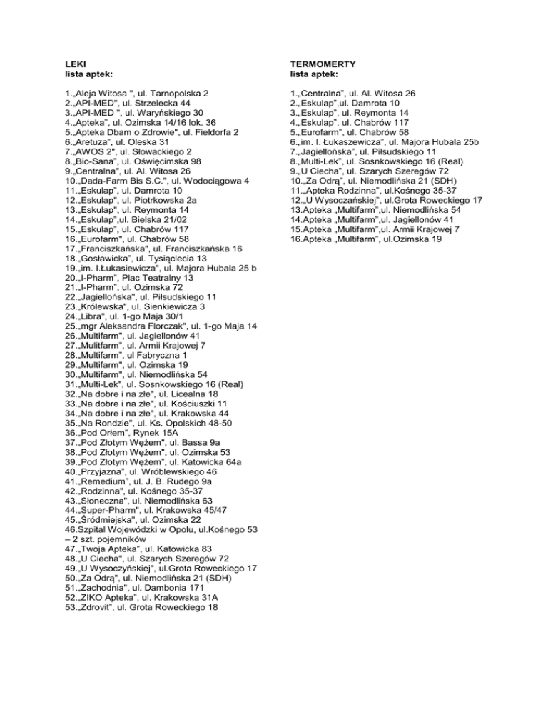 LEKI lista aptek: TERMOMERTY lista aptek: 1.„Aleja Witosa ", ul. Tarnopolska 2 2.„API-MED", ul. Strzelecka 44 3.„API-MED ", ul. Waryńskiego 30 4.„Apteka”, ul. Ozimska 14/16 lok. 36 5.„Apteka Dbam o Zdrowie", ul. Fieldorfa 2 6.„Aretuza”, ul. Oleska 31 7.„AWOS 2", ul. Słowackiego 2 8.„Bio-Sana”, ul. Oświęcimska 98 9.„Centralna", ul. Al. Witosa 26 10.„Dada-Farm Bis S.C.", ul. Wodociągowa 4 11.„Eskulap”, ul. Damrota 10 12.„Eskulap", ul. Piotrkowska 2a 13.„Eskulap", ul. Reymonta 14 14.„Eskulap”,ul. Bielska 21/02 15.„Eskulap”, ul. Chabrów 117 16.„Eurofarm", ul. Chabrów 58 17.„Franciszkańska", ul. Franciszkańska 16 18.„Gosławicka”, ul. Tysiąclecia 13 19.„im. I.Łukasiewicza", ul. Majora Hubala 25 b 20.„I-Pharm”, Plac Teatralny 13 21.„I-Pharm”, ul. Ozimska 72 22.„Jagiellońska", ul. Piłsudskiego 11 23.„Królewska", ul. Sienkiewicza 3 24.„Libra", ul. 1-go Maja 30/1 25.„mgr Aleksandra Florczak", ul. 1-go Maja 14 26.„Multifarm", ul. Jagiellonów 41 27.„Mulitfarm”, ul. Armii Krajowej 7 28.„Multifarm”, ul Fabryczna 1 29.„Multifarm", ul. Ozimska 19 30.„Multifarm", ul. Niemodlińska 54 31.„Multi-Lek", ul. Sosnkowskiego 16 (Real) 32.„Na dobre i na złe", ul. Licealna 18 33.„Na dobre i na złe", ul. Kościuszki 11 34.„Na dobre i na złe", ul. Krakowska 44 35.„Na Rondzie", ul. Ks. Opolskich 48-50 36.„Pod Orłem”, Rynek 15A 37.„Pod Złotym Wężem", ul. Bassa 9a 38.„Pod Złotym Wężem", ul. Ozimska 53 39.„Pod Złotym Wężem”, ul. Katowicka 64a 40.„Przyjazna”, ul. Wróblewskiego 46 41.„Remedium”, ul. J. B. Rudego 9a 42.„Rodzinna", ul. Kośnego 35-37 43.„Słoneczna", ul. Niemodlińska 63 44.„Super-Pharm", ul. Krakowska 45/47 45.„Śródmiejska", ul. Ozimska 22 46.Szpital Wojewódzki w Opolu, ul.Kośnego 53 – 2 szt. pojemników 47.„Twoja Apteka”, ul. Katowicka 83 48.„U Ciecha", ul. Szarych Szeregów 72 49.„U Wysoczyńskiej", ul.Grota Roweckiego 17 50.„Za Odrą", ul. Niemodlińska 21 (SDH) 51.„Zachodnia", ul. Dambonia 171 52.„ZIKO Apteka”, ul. Krakowska 31A 53.„Zdrovit”, ul. Grota Roweckiego 18 1.„Centralna”, ul. Al. Witosa 26 2.„Eskulap”,ul. Damrota 10 3.„Eskulap”, ul. Reymonta 14 4.„Eskulap”, ul. Chabrów 117 5.„Eurofarm”, ul. Chabrów 58 6.„im. I. Łukaszewicza”, ul. Majora Hubala 25b 7.„Jagiellońska”, ul. Piłsudskiego 11 8.„Multi-Lek”, ul. Sosnkowskiego 16 (Real) 9.„U Ciecha”, ul. Szarych Szeregów 72 10.„Za Odrą”, ul. Niemodlińska 21 (SDH) 11.„Apteka Rodzinna”, ul.Kośnego 35-37 12.„U Wysoczańskiej”, ul.Grota Roweckiego 17 13.Apteka „Multifarm”,ul. Niemodlińska 54 14.Apteka „Multifarm”,ul. Jagiellonów 41 15.Apteka „Multifarm”,ul. Armii Krajowej 7 16.Apteka „Multifarm”, ul.Ozimska 19