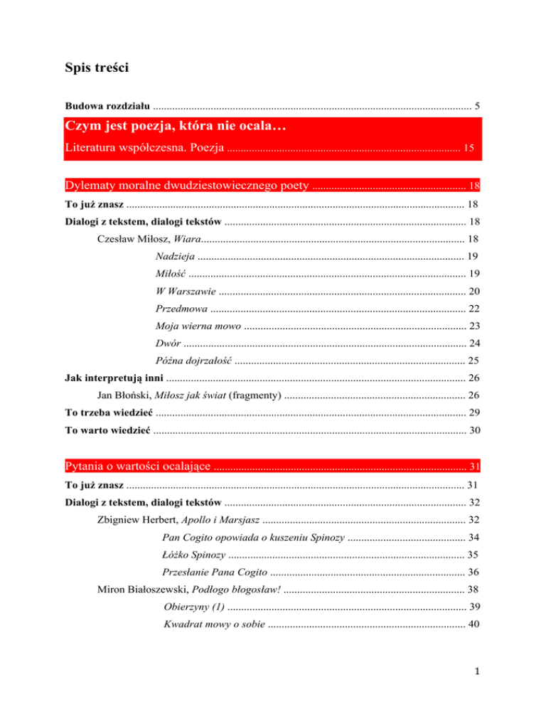 Spis treści Budowa rozdziału .................................................................................................................... 5 Czym jest poezja, która nie ocala… Literatura współczesna. Poezja ..................................................................................... 15 Dylematy moralne dwudziestowiecznego poety ........................................................ 18 To już znasz ........................................................................................................................... 18 Dialogi z tekstem, dialogi tekstów ........................................................................................ 18 Czesław Miłosz, Wiara................................................................................................ 18 Nadzieja ................................................................................................. 19 Miłość ..................................................................................................... 19 W Warszawie .......................................................................................... 20 Przedmowa ............................................................................................. 22 Moja wierna mowo ................................................................................. 23 Dwór ....................................................................................................... 24 Późna dojrzałość .................................................................................... 25 Jak interpretują inni ............................................................................................................. 26 Jan Błoński, Miłosz jak świat (fragmenty) .................................................................. 26 To trzeba wiedzieć ................................................................................................................. 29 To warto wiedzieć .................................................................................................................. 30 Pytania o wartości ocalające ............................................................................................ 31 To już znasz ........................................................................................................................... 31 Dialogi z tekstem, dialogi tekstów ........................................................................................ 32 Zbigniew Herbert, Apollo i Marsjasz .......................................................................... 32 Pan Cogito opowiada o kuszeniu Spinozy ........................................... 34 Łóżko Spinozy ...................................................................................... 35 Przesłanie Pana Cogito ....................................................................... 36 Miron Białoszewski, Podłogo błogosław! .................................................................. 38 Obierzyny (1) ....................................................................................... 39 Kwadrat mowy o sobie ........................................................................ 40 1 Wisława Szymborska, Schyłek wieku .......................................................................... 40 Żona Lota ............................................................................................ 41 Nic darowane ...................................................................................... 42 Jak interpretują inni ............................................................................................................. 43 Stanisław Barańczak, Uciekinier z Utopii. O poezji Zbigniewa Herberta (fragmenty)43 Anna Sobolewska, „Lepienie widoku z domysłu”. Percepcja świata (fragmenty) .... 44 Wojciech Ligęza, O poezji Wisławy Szymborskiej. Świat w stanie korekty (fragmenty) ...................................................................................................................................... 45 To trzeba wiedzieć ................................................................................................................. 50 Poezja i obrona sensu świata ........................................................................................... 52 To już znasz............................................................................................................................ 52 Dialogi z tekstem, dialogi tekstów......................................................................................... 52 Jan Paweł II, Tryptyk rzymski (fragmenty) ................................................................. 52 Homilia Jana Pawła II. 2 czerwca 1979 .............................................. 57 Jak interpretują inni ............................................................................................................. 58 Stefan Sawicki, Progi (fragmenty) ............................................................................. 58 Jerzy Szymik, Przekroczyć próg zadumania (fragmenty) .......................................... 59 To trzeba wiedzieć ................................................................................................................. 61 Język, polityka, manipulacja ........................................................................................... 62 To już znasz............................................................................................................................ 62 Dialogi z tekstem, dialogi tekstów......................................................................................... 62 Ewa Lipska, Egzamin .................................................................................................. 62 Kraj podobny do innych ...................................................................... 63 Stanisław Barańczak, Spójrzmy prawdzie w oczy .............................................