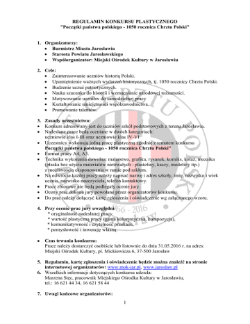 REGULAMIN KONKURSU PLASTYCZNEGO ”Początki państwa polskiego - 1050 rocznica Chrztu Polski” 1. Organizatorzy: Burmistrz Miasta Jarosławia Starosta Powiatu Jarosławskiego Współorganizator: Miejski Ośrodek Kultury w Jarosławiu 2. Cele: Zainteresowanie uczniów historią Polski. Upamiętnienie ważnych wydarzeń historycznych, tj. 1050 rocznicy Chrztu Polski. Budzenie uczuć patriotycznych. Nauka szacunku do historii i wzmacnianie narodowej tożsamości. Motywowanie uczniów do samodzielnej pracy Kształtowanie umiejętności współzawodnictwa. Promowanie talentów. 3. Zasady uczestnictwa: Konkurs adresowany jest do uczniów szkół podstawowych z terenu Jarosławia. Nadesłane prace będą oceniane w dwóch kategoriach: uczniowie klas I-III oraz uczniowie klas IV-VI Uczestnicy wykonują jedną pracę plastyczną zgodnie z tematem konkursu Początki państwa polskiego - 1050 rocznica Chrztu Polski” Format pracy A4, A3. Technika wykonania dowolna: malarstwo, grafika, rysunek, komiks, kolaż, mozaika (płaska bez użycia materiałów nietrwałych : plasteliny, kaszy, modeliny itp.) z możliwością eksponowania w ramie pod szkłem. Na odwrocie każdej pracy należy napisać nazwę i adres szkoły, imię, nazwisko i wiek ucznia, nazwisko nauczyciela, telefon kontaktowy. Prace zbiorowe nie będą podlegały ocenie jury. Oceny prac dokona jury powołane przez organizatorów konkursu. Do prac należy dołączyć kartę zgłoszenia i oświadczenie wg załączonego wzoru. 4. Przy ocenie prac jury uwzględni: * oryginalność nadesłanej pracy, * wartość plastyczną pracy (gama kolorystyczna, kompozycja), * komunikatywność i czytelność przekazu, * pomysłowość i inwencję własną. Czas trwania konkursu: Prace należy dostarczyć osobiście lub listownie do dnia 31.05.2016 r. na adres: Miejski Ośrodek Kultury, pl. Mickiewicza 6, 37-500 Jarosław 5. Regulamin, kartę zgłoszenia i oświadczenie będzie można znaleźć na stronie internetowej organizatorów: www.mok-jar.pl, www.jaroslaw.pl 6. Wszelkich informacji dotyczących konkursu udziela: Marzena Stęc, pracownik Miejskiego Ośrodka Kultury w Jarosławiu, tel.: 16 621 44 34, 16 621 58 44 7. Uwagi końcowe organizatorów: 1 Prace nadesłane na konkurs zostaną zaprezentowane społeczności lokalnej w GALERII w KORYTARZU Miejskiego Ośrodka Kultury w Jarosławiu. Autorzy najlepszych prac otrzymają dyplomy i upominki rzeczowe. Na stronie internetowej organizatorów: www.mok-jar.pl, www.plastyk.jaroslaw.art.pl oraz www.jaroslaw.pl zostaną opublikowane wyniki konkursu, imiona i nazwiska zwycięzców oraz nazwa szkoły. Prace zrolowane, zniszczone w wyniku złego opakowania lub niezgodne z regulaminem nie będą oceniane. Nadesłane prace konkursowe przechodzą na własność organizatora, który zastrzega sobie prawo do ich wystawiania i nieodpłatnego reprodukowania oraz prezentowania na wystawie, a także w celach promocyjnych w prasie i na stronie internetowej. Decyzje jury są ostateczne i wiążące dla wszystkich uczestników konkursu. Organizator zastrzega sobie prawo do uzupełnienia treści regulaminu. 2 KARTA ZGŁOSZENIA KONKURSU PLASTYCZNEGO ”Początki państwa polskiego – 1050 rocznica Chrztu Polski” Nazwa szkoły Imię i Nazwisko Uczestnika Pieczęć szkoły Wiek Klasa Nauczyciel prowadzący ……………………………………… …………………………………... Podpis rodzica lub opiekuna prawnego ……………………………………..….. 3 ZGODA NA PRZETWARZANIE DANYCH OSOBOWYCH ORAZ ZEZWOLENIE NA ROZPOWSZECHNIANIE WIZERUNKU I PRACY KONKURSOWEJ Zgodnie z ustawą z dnia 29 sierpnia 1997 o ochronie danych osobowych wyrażam zgodę na przetwarzanie danych osobowych mojego dziecka ………………………………………………………………………………………………….. ucznia …………………………………………………………………………………………... przez Miejski Ośrodek Kultury w Jarosławiu który jest ich administratorem. Dane wykorzystane będą do celów organizacyjnych konkursu plastycznego. Podanie danych jest dobrowolne, ale niezbędne do udziału w konkursie. Listy uczestników zawierające dane w zakresie <imię, nazwisko, kategoria wiekowa, szkoła, listy laureatów zawierające dane o podobnym zakresie oraz materiały zdjęciowe i filmowe związane z konkursem będą umieszczone na stronach internetowych Organizatorów, oraz w mediach. Inne udostępnianie danych nie jest przewidywane. Osobie, której dotyczą dane, przysługuje prawo dostępu do treści tych danych i ich poprawienia. Niniejszym zgadzam się na przetwarzanie danych osobowych oraz utrwalenie, przetwarzanie i rozpowszechnianie wizerunku we wskazanym powyżej zakresie i celu. ______________________________________________ Data i czytelny podpis rodzica bądź opiekuna prawnego 4