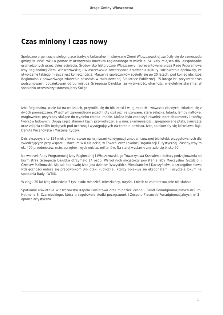 Urząd Gminy Włoszczowa Czas miniony i czas nowy Społeczne organizacje pielęgnujące tradycje kulturalne i historyczne Ziemi Włoszczowskiej zwróciły się do samorządu gminy w 1996 roku o pomoc w utworzeniu muzeum regionalnego w mieście. Szukały miejsca dla eksponatów gromadzonych przez dziesięciolecia. Środowisko historyczne Włoszczowy, reprezentowane przez Radę Programową Izby Regionalnej Ziemi Włoszczowskiej i Włoszczowskie Towarzystwo Krzewienia Kultury, wielokrotnie apelowały, że utworzenie takiego miejsca jest koniecznością. Marzenia społeczników spełniły się po 20 latach, pod koniec ubr. Izba Regionalna z prawdziwego zdarzenia powstała w rozbudowanej Bibliotece Publicznej. 15 lutego br. przyszedł czas podsumowań i podziękowań od burmistrza Grzegorza Dziubka za wytrwałość, ofiarność, wieloletnie starania. W spotkaniu uczestniczył starosta Jerzy Suliga. Izba Regionalna, wiele lat na walizkach, przytuliła się do biblioteki i w jej murach - wówczas ciasnych, składała się z dwóch pomieszczeń. W jednym zgromadzono przedmioty dziś już nie używane: stare żelazka, latarki, lampy naftowe, maglownice, przyrządy służące do wypieku chleba, meble. Można było zobaczyć również stare dokumenty i rzeźby twórców ludowych. Drugą część stanowił kącik przyrodniczy, a w nim: skamieniałości, spreparowane ptaki, zwierzęta oraz zdjęcia roślin będących pod ochroną i występujących na terenie powiatu. Izbą opiekowały się Mirosława Bąk, Danuta Pacanowska i Marzena Rydzyk. Dziś ekspozycja to 154 metry kwadratowe na najniższej kondygnacji zmodernizowanej biblioteki, przygotowanych dla zwiedzających przy wsparciu Muzeum Wsi Kieleckiej w Tokarni oraz Lokalnej Organizacji Turystycznej. Zasoby Izby to ok. 400 przedmiotów: m.in. sprzętów, wydawnictw, militariów. Na stałej wystawie znalazło się blisko 50. Na wniosek Rady Programowej Izby Regionalnej i Włoszczowskiego Towarzystwa Krzewienia Kultury podziękowania od burmistrza Grzegorza Dziubka otrzymało 14 osób. Wśród nich inicjatorzy powstania Izby Mieczysław Guździoł i Czesław Malinowski. Ala tak naprawdę Izba jest dziełem Wszystkich Mieszkańców i Darczyńców, a szczególne słowa wdzięczności należą się pracownikom Biblioteki Publicznej, którzy opiekują się eksponatami i użyczają lokum na spotkania Rady i WTKK. W ciągu 20 lat Izbę odwiedziło 7 tys. osób: młodzież, mieszkańcy, turyści. I niech to zainteresowanie nie słabnie. Spotkanie uświetniła Włoszczowska Kapela Powiatowa oraz młodzież Zespołu Szkół Ponadgimnazjalnych nr2 im. Hetmana S. Czarnieckiego, która przygotowała słodki poczęstunek i Zespołu Placówek Ponadgimnazjalnych nr 3 oprawa artystyczna. 1