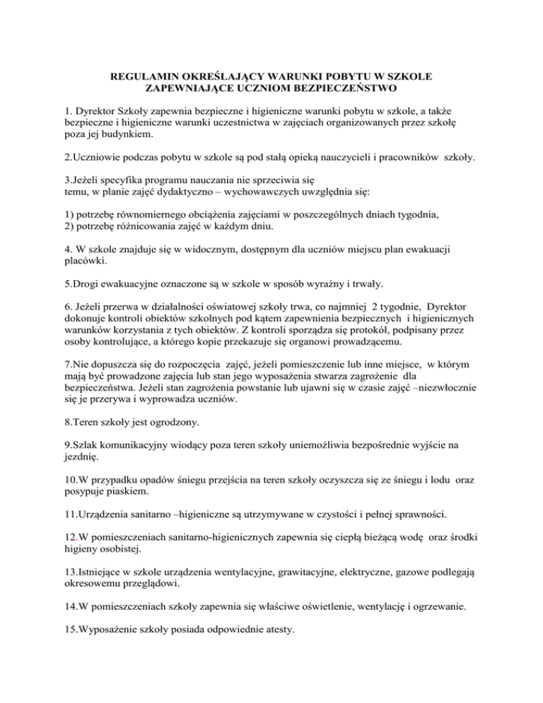 REGULAMIN OKREŚLAJĄCY WARUNKI POBYTU W SZKOLE ZAPEWNIAJĄCE UCZNIOM BEZPIECZEŃSTWO 1. Dyrektor Szkoły zapewnia bezpieczne i higieniczne warunki pobytu w szkole, a także bezpieczne i higieniczne warunki uczestnictwa w zajęciach organizowanych przez szkołę poza jej budynkiem. 2.Uczniowie podczas pobytu w szkole są pod stałą opieką nauczycieli i pracowników szkoły. 3.Jeżeli specyfika programu nauczania nie sprzeciwia się temu, w planie zajęć dydaktyczno – wychowawczych uwzględnia się: 1) potrzebę równomiernego obciążenia zajęciami w poszczególnych dniach tygodnia, 2) potrzebę różnicowania zajęć w każdym dniu. 4. W szkole znajduje się w widocznym, dostępnym dla uczniów miejscu plan ewakuacji placówki. 5.Drogi ewakuacyjne oznaczone są w szkole w sposób wyraźny i trwały. 6. Jeżeli przerwa w działalności oświatowej szkoły trwa, co najmniej 2 tygodnie, Dyrektor dokonuje kontroli obiektów szkolnych pod kątem zapewnienia bezpiecznych i higienicznych warunków korzystania z tych obiektów. Z kontroli sporządza się protokół, podpisany przez osoby kontrolujące, a którego kopie przekazuje się organowi prowadzącemu. 7.Nie dopuszcza się do rozpoczęcia zajęć, jeżeli pomieszczenie lub inne miejsce, w którym mają być prowadzone zajęcia lub stan jego wyposażenia stwarza zagrożenie dla bezpieczeństwa. Jeżeli stan zagrożenia powstanie lub ujawni się w czasie zajęć –niezwłocznie się je przerywa i wyprowadza uczniów. 8.Teren szkoły jest ogrodzony. 9.Szlak komunikacyjny wiodący poza teren szkoły uniemożliwia bezpośrednie wyjście na jezdnię. 10.W przypadku opadów śniegu przejścia na teren szkoły oczyszcza się ze śniegu i lodu oraz posypuje piaskiem. 11.Urządzenia sanitarno –higieniczne są utrzymywane w czystości i pełnej sprawności. 12.W pomieszczeniach sanitarno-higienicznych zapewnia się ciepłą bieżącą wodę oraz środki higieny osobistej. 13.Istniejące w szkole urządzenia wentylacyjne, grawitacyjne, elektryczne, gazowe podlegają okresowemu przeglądowi. 14.W pomieszczeniach szkoły zapewnia się właściwe oświetlenie, wentylację i ogrzewanie. 15.Wyposażenie szkoły posiada odpowiednie atesty. 16.Stołówkę utrzymuje się w czystości, a jej wyposażenie w stanie technicznym zapewniającym bezpieczne używanie. 17.Gorące posiłki są spożywane w stołówce. 18.Pokój nauczycielski, świetlicę, wyposaża się w apteczki zaopatrzone w środki niezbędne do udzielania pierwszej pomocy i instrukcję o zasadach udzielania tej pomocy. 19.Miejsca pracy oraz pomieszczenia, do których jest wzbroniony wstęp osobom nieupoważnionym, są odpowiednio oznakowane. 20.W pomieszczeniach gdzie odbywają się zajęcia temperatura powinna wynosić, co najmniej 18°C. Jeżeli nie jest to możliwe Dyrektor zawiesza zajęcia na czas oznaczony, powiadamiając o tym organ prowadzący. 21.Urządzenia niesprawne, uszkodzone, oznacza się w sposób wyraźny i zabezpiecza przed uruchomieniem. 22.Stoliki uczniowskie, krzesła i inne sprzęty szkolne dostosowane są do wzrostu uczniów i rodzaju pracy. 23.Udział uczniów w pracach na rzecz środowiska lub szkoły może mieć miejsce tylko po zaopatrzeniu ich w odpowiedni sprzęt lub środki ochrony indywidualnie do wykonywania tych prac oraz po zapewnieniu właściwego nadzoru i bezpiecznych warunków pracy. 24.Podczas zajęć na terenie szkoły: obowiązkowych, pozalekcyjnych i nadobowiązkowych opiekę nad uczniami sprawuje nauczyciel prowadzący. 25.Nauczyciele są przeszkoleni w zakresie bezpieczeństwa, postępowania p. poż. i higieny pracy a nauczyciele wychowania fizycznego w zakresie udzielania pierwszej pomocy). 26.Przerwy w zajęciach uczniowie spędzają pod nadzorem nauczycieli (według grafiku wywieszonego w pokoju nauczycielskim). 27.Jeżeli pozwalają na to warunki atmosferyczne, umożliwia się uczniom spędzanie przerw na świeżym powietrzu. 28.Na pierwszych zajęciach nauczyciele omawiają z uczniami regulaminy pracowni informatycznej i sali gimnastycznej. 29.Prowadzący zajęcia sportowe zapoznaje uczniów biorących w nich udział z zasadami bezpiecznego wykonywania ćwiczeń oraz uczestnictwa w grach i zabawach. 30.Przed dopuszczeniem uczniów do zajęć prowadzący je nauczyciel sprawdza czy warunki pracy nie stwarzają zagrożenia dla bezpieczeństwa uczniów. O wszystkich nieprawidłowościach nauczyciel zgłasza dyrektorowi. 31.Wychowawcy klas omawiają lub przypominają zasady bezpieczeństwa w szkole i poza nią (w pierwszym dniu nauki nowego roku szkolnego, przed feriami zimowymi i letnimi, przed każdym wyjazdem na wycieczkę). 32.Stopień trudności i intensywności ćwiczeń dostosowuje się do aktualnej sprawności fizycznej i wydolności ćwiczących. 33.Ćwiczenia nauczyciel wychowania fizycznego prowadzi z zastosowaniem metod i urządzeń zapewniających pełne bezpieczeństwo ćwiczących. 34.Podczasorganizowaniu zajęć, imprez i wycieczek poza teren szkoły liczbę opiekunów, sposób organizowania opieki oraz program ustala się, uwzględniając wiek, stopień rozwoju psychofizycznego, stan zdrowia uczniów, a także specyfikę zajęć, imprez i wycieczek oraz warunki, w jakich będą się one odbywać (jeden opiekun na 30 uczniów – jeżeli grupa nie wyjeżdża poza miasto i nie korzysta z przejazdów komunikacją miejską; jeden opiekun na 15 uczniów, jeżeli grupa porusza się w obrębie miasta, ale korzysta ze środków komunikacji lub wyjeżdża poza miasto; jeśli jest to impreza turystyki kwalifikowanej lub jeśli przepisy szczególne nie stanowią inaczej –jeden opiekun na 10 uczniów, grupa rowerowa wraz z dwoma opiekunami nie może przekraczać 10 osób), osobą odpowiedzialną za uczniów jest zawsze nauczyciel. 35.W szkole omawiane są z uczniami przepisy ruchu drogowego, prowadzi się kształcenie komunikacyjne, przeprowadzane są egzaminy na kartę rowerową. 36.Pracownik szkoły, który powziął wiadomość o wypa