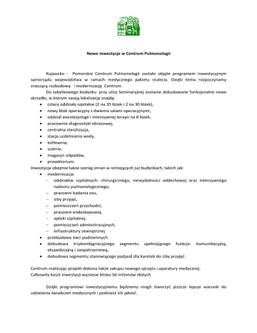 Nowe inwestycje w Centrum Pulmonologii Kujawsko - Pomorskie Centrum Pulmonologii zostało objęte programem inwestycyjnym samorządu województwa w ramach medycznego pakietu stulecia. Dzięki temu rozpoczynamy znaczącą rozbudowę i modernizację Centrum. Do zabytkowego budynku przy ulicy Seminaryjnej zostanie dobudowane funkcjonalne nowe skrzydło, w którym swoją lokalizację znajdą: cztery oddziały szpitalne (2 na 35 łóżek i 2 na 30 łóżek), nowy blok operacyjny z dwiema salami operacyjnymi, oddział anestezjologii i intensywnej terapii na 8 łóżek, pracownie diagnostyki obrazowej, centralna sterylizacja, stacja uzdatniania wody, kotłownia, szatnie, magazyn odpadów, prosektorium. Inwestycja obejmie także szereg zmian w istniejących już budynkach, takich jak: modernizacja: oddziałów szpitalnych: chirurgicznego, niewydolności oddechowej oraz intensywnego nadzoru pulmonologicznego, pracowni badania snu, izby przyjęć, pomieszczeń przychodni, pracowni endoskopowej, apteki szpitalnej, pomieszczeń administracyjnych, infrastruktury zewnętrznej przebudowa sieci podziemnych dobudowa trzykondygnacyjnego segmentu spełniającego funkcje: komunikacyjną, ekspedycyjną i zaopatrzeniową, dobudowa segmentu stanowiącego podjazd dla karetek do izby przyjęć. Centrum realizując projekt dokona także zakupu nowego sprzętu i aparatury medycznej. Całkowity koszt inwestycji wyniesie blisko 56 milionów złotych. Dzięki programowi inwestycyjnemu będziemy mogli stworzyć jeszcze lepsze warunki do udzielania świadczeń medycznych i podnieść ich jakość.