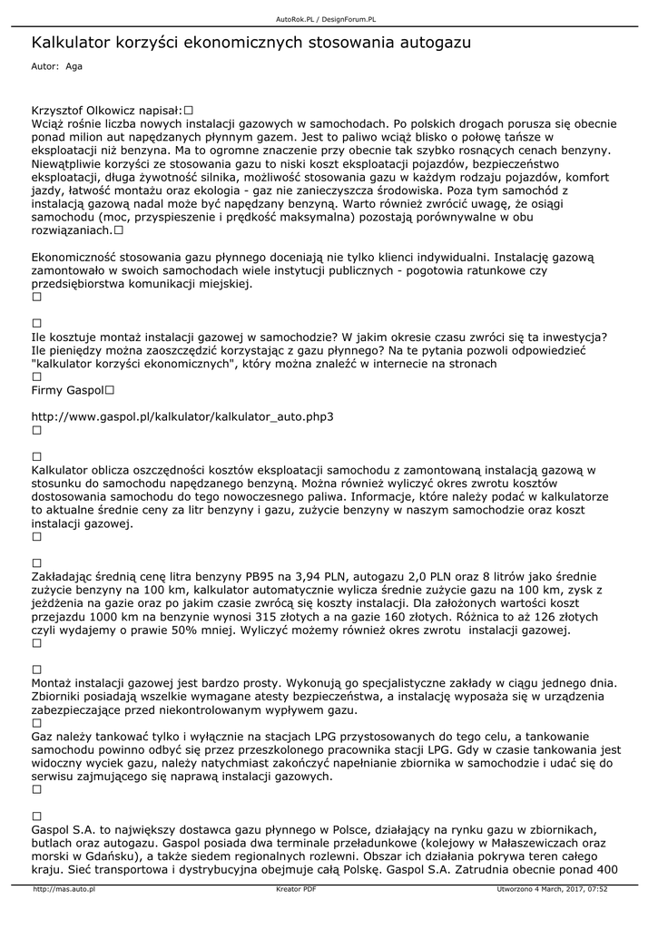 AutoRok.PL / DesignForum.PL Kalkulator korzyści ekonomicznych stosowania autogazu Autor: Aga Krzysztof Olkowicz napisał: Wciąż rośnie liczba nowych instalacji gazowych w samochodach. Po polskich drogach porusza się obecnie ponad milion aut napędzanych płynnym gazem. Jest to paliwo wciąż blisko o połowę tańsze w eksploatacji niż benzyna. Ma to ogromne znaczenie przy obecnie tak szybko rosnących cenach benzyny. Niewątpliwie korzyści ze stosowania gazu to niski koszt eksploatacji pojazdów, bezpieczeństwo eksploatacji, długa żywotność silnika, możliwość stosowania gazu w każdym rodzaju pojazdów, komfort jazdy, łatwość montażu oraz ekologia - gaz nie zanieczyszcza środowiska. Poza tym samochód z instalacją gazową nadal może być napędzany benzyną. Warto również zwrócić uwagę, że osiągi samochodu (moc, przyspieszenie i prędkość maksymalna) pozostają porównywalne w obu rozwiązaniach. Ekonomiczność stosowania gazu płynnego doceniają nie tylko klienci indywidualni. Instalację gazową zamontowało w swoich samochodach wiele instytucji publicznych - pogotowia ratunkowe czy przedsiębiorstwa komunikacji miejskiej. Ile kosztuje montaż instalacji gazowej w samochodzie? W jakim okresie czasu zwróci się ta inwestycja? Ile pieniędzy można zaoszczędzić korzystając z gazu płynnego? Na te pytania pozwoli odpowiedzieć "kalkulator korzyści ekonomicznych", który można znaleźć w internecie na stronach Firmy Gaspol http://www.gaspol.pl/kalkulator/kalkulator_auto.php3 Kalkulator oblicza oszczędności kosztów eksploatacji samochodu z zamontowaną instalacją gazową w stosunku do samochodu napędzanego benzyną. Można również wyliczyć okres zwrotu kosztów dostosowania samochodu do tego nowoczesnego paliwa. Informacje, które należy podać w kalkulatorze to aktualne średnie ceny za litr benzyny i gazu, zużycie benzyny w naszym samochodzie oraz koszt instalacji gazowej. Zakładając średnią cenę litra benzyny PB95 na 3,94 PLN, autogazu 2,0 PLN oraz 8 litrów jako średnie zużycie benzyny na 100 km, kalkulator automatycznie wylicza średnie zużycie gazu na 100 km, zysk z jeżdżenia na gazie oraz po jakim czasie zwrócą się koszty instalacji. Dla założonych wartości koszt przejazdu 1000 km na benzynie wynosi 315 złotych a na gazie 160 złotych. Różnica to aż 126 złotych czyli wydajemy o prawie 50% mniej. Wyliczyć możemy również okres zwrotu instalacji gazowej. Montaż instalacji gazowej jest bardzo prosty. Wykonują go specjalistyczne zakłady w ciągu jednego dnia. Zbiorniki posiadają wszelkie wymagane atesty bezpieczeństwa, a instalację wyposaża się w urządzenia zabezpieczające przed niekontrolowanym wypływem gazu. Gaz należy tankować tylko i wyłącznie na stacjach LPG przystosowanych do tego celu, a tankowanie samochodu powinno odbyć się przez przeszkolonego pracownika stacji LPG. Gdy w czasie tankowania jest widoczny wyciek gazu, należy natychmiast zakończyć napełnianie zbiornika w samochodzie i udać się do serwisu zajmującego się naprawą instalacji gazowych. Gaspol S.A. to największy dostawca gazu płynnego w Polsce, działający na rynku gazu w zbiornikach, butlach oraz autogazu. Gaspol posiada dwa terminale przeładunkowe (kolejowy w Małaszewiczach oraz morski w Gdańsku), a także siedem regionalnych rozlewni. Obszar ich działania pokrywa teren całego kraju. Sieć transportowa i dystrybucyjna obejmuje całą Polskę. Gaspol S.A. Zatrudnia obecnie ponad 400 http://mas.auto.pl Kreator PDF Utworzono 4 March, 2017, 07:52 AutoRok.PL / DesignForum.PL osób. Gaspol to również ponad 300 dealerów i 20000 punktów sprzedaży detalicznej w całym kraju. Gaspol jest dystrybutorem gazu płynnego, nie zajmuje się natomiast montażem instalacji w samochodach ani budową stacji. Więcej informacji: GASPOL S.A. Karolina Horoszczak (0-22) 530 00 00, [email protected] TRUST communication Krzysztof Olkowicz (0-22) 312 312 0, [email protected] Krzysztof Olkowicz TRUST communication Pl. Czerwca 1976 roku 1B lok. 127 02-495 Warszawa tel. (+48 22) 312 312 0; 312 312 1 wew. 103 fax (+48 22) 312 312 2 wew 105 e-mail: [email protected] http://mas.auto.pl Kreator PDF Utworzono 4 March, 2017, 07:52