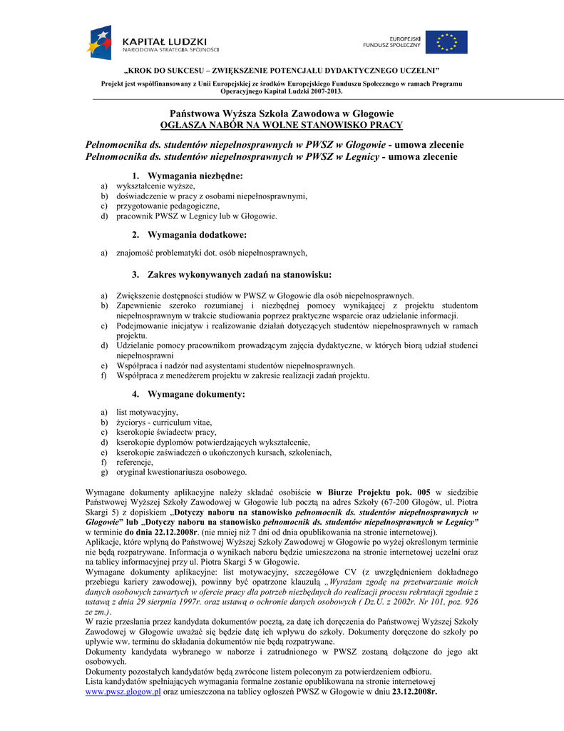 „KROK DO SUKCESU – ZWIĘKSZENIE POTENCJAŁU DYDAKTYCZNEGO UCZELNI” Projekt jest współfinansowany z Unii Europejskiej ze środków Europejskiego Funduszu Społecznego w ramach Programu Operacyjnego Kapitał Ludzki 2007-2013. Państwowa WyŜsza Szkoła Zawodowa w Głogowie OGŁASZA NABÓR NA WOLNE STANOWISKO PRACY Pełnomocnika ds. studentów niepełnosprawnych w PWSZ w Głogowie - umowa zlecenie Pełnomocnika ds. studentów niepełnosprawnych w PWSZ w Legnicy - umowa zlecenie 1. Wymagania niezbędne: a) b) c) d) wykształcenie wyŜsze, doświadczenie w pracy z osobami niepełnosprawnymi, przygotowanie pedagogiczne, pracownik PWSZ w Legnicy lub w Głogowie. 2. Wymagania dodatkowe: a) znajomość problematyki dot. osób niepełnosprawnych, 3. Zakres wykonywanych zadań na stanowisku: a) Zwiększenie dostępności studiów w PWSZ w Głogowie dla osób niepełnosprawnych. b) Zapewnienie szeroko rozumianej i niezbędnej pomocy wynikającej z projektu studentom niepełnosprawnym w trakcie studiowania poprzez praktyczne wsparcie oraz udzielanie informacji. c) Podejmowanie inicjatyw i realizowanie działań dotyczących studentów niepełnosprawnych w ramach projektu. d) Udzielanie pomocy pracownikom prowadzącym zajęcia dydaktyczne, w których biorą udział studenci niepełnosprawni e) Współpraca i nadzór nad asystentami studentów niepełnosprawnych. f) Współpraca z menedŜerem projektu w zakresie realizacji zadań projektu. 4. Wymagane dokumenty: a) b) c) d) e) f) g) list motywacyjny, Ŝyciorys - curriculum vitae, kserokopie świadectw pracy, kserokopie dyplomów potwierdzających wykształcenie, kserokopie zaświadczeń o ukończonych kursach, szkoleniach, referencje, oryginał kwestionariusza osobowego. Wymagane dokumenty aplikacyjne naleŜy składać osobiście w Biurze Projektu pok. 005 w siedzibie Państwowej WyŜszej Szkoły Zawodowej w Głogowie lub pocztą na adres Szkoły (67-200 Głogów, ul. Piotra Skargi 5) z dopiskiem „Dotyczy naboru na stanowisko pełnomocnik ds. studentów niepełnosprawnych w Głogowie” lub „Dotyczy naboru na stanowisko pełnomocnik ds. studentów niepełnosprawnych w Legnicy” w terminie do dnia 22.12.2008r. (nie mniej niŜ 7 dni od dnia opublikowania na stronie internetowej). Aplikacje, które wpłyną do Państwowej WyŜszej Szkoły Zawodowej w Głogowie po wyŜej określonym terminie nie będą rozpatrywane. Informacja o wynikach naboru będzie umieszczona na stronie internetowej uczelni oraz na tablicy informacyjnej przy ul. Piotra Skargi 5 w Głogowie. Wymagane dokumenty aplikacyjne: list motywacyjny, szczegółowe CV (z uwzględnieniem dokładnego przebiegu kariery zawodowej), powinny być opatrzone klauzulą „WyraŜam zgodę na przetwarzanie moich danych osobowych zawartych w ofercie pracy dla potrzeb niezbędnych do realizacji procesu rekrutacji zgodnie z ustawą z dnia 29 sierpnia 1997r. oraz ustawą o ochronie danych osobowych ( Dz.U. z 2002r. Nr 101, poz. 926 ze zm.). W razie przesłania przez kandydata dokumentów pocztą, za datę ich doręczenia do Państwowej WyŜszej Szkoły Zawodowej w Głogowie uwaŜać się będzie datę ich wpływu do szkoły. Dokumenty doręczone do szkoły po upływie ww. terminu do składania dokumentów nie będą rozpatrywane. Dokumenty kandydata wybranego w naborze i zatrudnionego w PWSZ zostaną dołączone do jego akt osobowych. Dokumenty pozostałych kandydatów będą zwrócone listem poleconym za potwierdzeniem odbioru. Lista kandydatów spełniających wymagania formalne zostanie opublikowana na stronie internetowej www.pwsz.glogow.pl oraz umieszczona na tablicy ogłoszeń PWSZ w Głogowie w dniu 23.12.2008r.