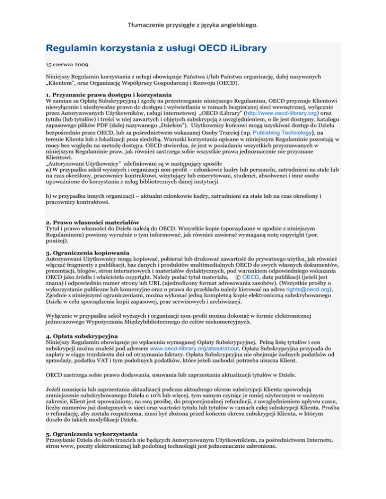 Tłumaczenie przysięgłe z języka angielskiego. Regulamin korzystania z usługi OECD iLibrary 15 czerwca 2009 Niniejszy Regulamin korzystania z usługi obowiązuje Państwa i/lub Państwa organizację, dalej nazywanych „Klientem”, oraz Organizację Współpracy Gospodarczej i Rozwoju (OECD). 1. Przyznanie prawa dostępu i korzystania W zamian za Opłatę Subskrypcyjną i zgodę na przestrzeganie niniejszego Regulaminu, OECD przyznaje Klientowi niewyłącznie i niezbywalne prawo do dostępu i wyświetlania w ramach bezpiecznej sieci wewnętrznej, wyłącznie przez Autoryzowanych Użytkowników, usługi internetowej „OECD iLibrary" (http://www.oecd-ilibrary.org) oraz tytułu (lub tytułów) i treści w niej zawartych i objętych subskrypcją z uwzględnieniem, o ile jest dostępny, katalogu zapasowego plików PDF (dalej nazywanego „Dziełem”). Użytkownicy końcowi mogą uzyskiwać dostęp do Dzieła bezpośrednio przez OECD, lub za pośrednictwem wskazanej Osoby Trzeciej (np. Publishing Technology), na terenie Klienta lub z lokalizacji poza siedzibą. Warunki korzystania opisane w niniejszym Regulaminie pozostają w mocy bez względu na metodę dostępu. OECD stwierdza, że jest w posiadaniu wszystkich przyznawanych w niniejszym Regulaminie praw, jak również zastrzega sobie wszystkie prawa jednoznacznie nie przyznane Klientowi. „Autoryzowani Użytkownicy” zdefiniowani są w następujący sposób: a) W przypadku szkół wyższych i organizacji non-profit – członkowie kadry lub personelu, zatrudnieni na stałe lub na czas określony, pracownicy kontraktowi, wizytujący lub emerytowani, studenci, absolwenci i inne osoby upoważnione do korzystania z usług bibliotecznych danej instytucji. b) w przypadku innych organizacji – aktualni członkowie kadry, zatrudnieni na stałe lub na czas określony i pracownicy kontraktowi. 2. Prawo własności materiałów Tytuł i prawo własności do Dzieła należą do OECD. Wszystkie kopie (sporządzone w zgodzie z niniejszym Regulaminem) powinny wyraźnie o tym informować, jak również zawierać wymaganą notę copyright (por. poniżej). 3. Ograniczenia kopiowania Autoryzowani Użytkownicy mogą kopiować, pobierać lub drukować zawartość do prywatnego użytku, jak również włączać fragmenty z publikacji, baz danych i produktów multimedialnych OECD do swych własnych dokumentów, prezentacji, blogów, stron internetowych i materiałów dydaktycznych, pod warunkiem odpowiedniego wskazania OECD jako źródła i właściciela copyright. Należy podać tytuł materiału, © OECD, datę publikacji (jeżeli jest znana) i odpowiednio numer strony lub URL (ujednolicony format adresowania zasobów). (Wszystkie prośby o wykorzystanie publiczne lub komercyjne oraz o prawa do przekładu należy kierować na adres [email protected]). Zgodnie z niniejszymi ograniczeniami, można wykonać jedną kompletną kopię elektroniczną subskrybowanego Dzieła w celu sporządzenia kopii zapasowej, prac serwisowych i archiwizacji. Wyłącznie w przypadku szkół wyższych i organizacji non-profit można dokonać w formie elektronicznej jednorazowego Wypożyczania Międzybibliotecznego do celów niekomercyjnych. 4. Opłata subskrypcyjna Niniejszy Regulamin obowiązuje po wpłaceniu wymaganej Opłaty Subskrypcyjnej. Pełną listę tytułów i cen subskrypcji można znaleźć pod adresem www.oecd-ilibrary.org/about/about. Opłata Subskrypcyjna przypada do zapłaty w ciągu trzydziestu dni od otrzymania faktury. Opłata Subskrypcyjna nie obejmuje żadnych podatków od sprzedaży, podatku VAT i tym podobnych podatków, które jeżeli zachodzi potrzeba uiszcza Klient. OECD zastrzega sobie prawo dodawania, usuwania lub zaprzestania aktualizacji tytułów w Dziele. Jeżeli usunięcia lub zaprzestania aktualizacji podczas aktualnego okresu subskrypcji Klienta spowodują zmniejszenie subskrybowanego Dzieła o 10% lub więcej, tym samym czyniąc je mniej użytecznym w ważnym zakresie, Klient jest upoważniony, na swą prośbę, do proporcjonalnej refundacji, z uwzględnieniem upływu czasu, liczby numerów już dostępnych w sieci oraz wartości tytułu lub tytułów w ramach całej subskrypcji Klienta. Prośba o refundację, aby została rozpatrzona, musi być złożona przed końcem okresu subskrypcji Klienta, w którym doszło do takich modyfikacji Dzieła. 5. Ograniczenia wykorzystania Przesyłanie Dzieła do osób trzecich nie będących Autoryzowanym Użytkownikiem, za pośrednictwem Internetu, stron www, poczty elektronicznej lub podobnej technologii jest jednoznacznie zabronione. Tłumaczenie przysięgłe z języka angielskiego. Nie zezwala się na wykorzystanie komercyjne lub redystrybucję. Klient może umożliwić jednoczesny dostęp do Dzieła wielu Autoryzowanym Użytkownikom tylko w jednym miejscu. Dostęp Autoryzowanych Użytkowników z wielu miejsc za pośrednictwem sieci Klienta może wymagać wniesienia dodatkowej opłaty – w sprawie szczegółów prosimy o kontakt z [email protected]. Użytkownicy z zewnątrz mogą uzyskiwać dostęp do Dzieła tylko na terenie Klienta, ale nie spoza siedziby. 6. Ograniczenia cesji Dostęp do Dzieła przyznaje się wyłącznie Klientowi i nie może on podlegać cesji bez uprzedniej pisemnej zgody OECD. Każdy autoryzowany nabywca w drodze cesji będzie związany niniejszym Regulaminem i ograniczoną gwarancją. W żadnym wypadku Dzieła nie można cedować, przekazywać, dzierżawić, wynajmować, sprzedawać lub w inny sposób nim dysponować w sposób okresowy lub trwały, za wyjątkiem przypadków wyraźnie opisanych w niniejszym Regulaminie. 7. Rozwiązanie umowy Po rozwiązaniu umowy, Klient może nadal korzystać z Dzieła dostępnego w formacie PDF, w tym z katalogu zapasowego, za który wniesiono pełną Opłatę Subskrypcyjną. W przypadku rozwiązania umowy dotyczącej statystycznej bazy danych, na prośbę przekazaną na trzy miesiące przez zakończeniem subskrypcji, OECD prześle CD-rom lu