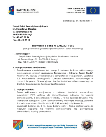 Białobrzegi, dn. 25.03.2011 r. Zespół Szkół Ponadgimnazjalnych im. Stanisława Staszica ul. śeromskiego 86 26-800 Białobrzegi Tel. 48 613 31 94 Fax. 48 613 27 10 Zapytanie o cenę nr 3/03/2011-ZSU (zakup i dostawa gadŜetów promocyjnych - balon reklamowy) I . Zamawiający: Zespół Szkół Ponadgimnazjalnych im. Stanisława Staszica ul. śeromskiego 86 26-800 Białobrzegi Nip: 798-116-82-79; REGON: 000198692 II. Opis przedmiotu zamówienia: 1. Przedmiotem zamówienia jest zakup i dostawa balonu reklamowego promującego projekt „Innowacja Edukacyjna – Zdrowie, Sport, Uroda” Priorytet IX. Rozwój wykształcenia i kompetencji w regionach, Działanie 9.2. Podniesienie atrakcyjności i jakości szkolnictwa zawodowego w ramach Programu Operacyjnego Kapitał Ludzki współfinansowanego ze środków Europejskiego Funduszu Społecznego. 2. Opis przedmiotu : Balon reklamowy stacjonarny z poliestru (materiał wzmocniony) powlekany PCV, gotowy do zamontowania, odporny na warunki atmosferyczne, z oświetleniem w środku . Pełne oprzyrządowanie typu wentylator zasilający ( 220V ) zamontowany wewnątrz, odciągi, pałatka, torba transportowa, śledzie lub haki, linki, instrukcja uŜytkowania. Wysokość balonu ok. 2 m., kolor balonu Ŝółty - farba zastosowana do nadruku odporna na warunki atmosferyczne nie powodująca stwardnienia tkaniny po nadruku. Na balonie mają być umieszczone logotypy Unii Europejskiej, Kapitału Ludzkiego z nazwą projektu z napisem współfinansowany przez Unię Europejską w ramach Europejskiego Funduszu Społecznego oraz logo patrona szkoły . III. Termin wykonania zamówienia: a) termin rozpoczęcia : 04.04.2011 r. b) termin zakończenia : 15.04.2011 r. IV. Opis sposobu przygotowania oferty: W ofercie naleŜy zawrzeć fotografię lub rysunek gadŜetu, cenę brutto, okres obowiązywania stałej ceny oraz informację o moŜliwości podpisania umowy. V. Miejsce oraz termin składania ofert: Oferta powinna być przesłana za pośrednictwem: poczty elektronicznej na adres : [email protected], faksem na nr 48 613 27 10 lub teŜ dostarczona osobiście do siedziby biura projektu 26-800 Białobrzegi ul. śeromskiego 86, pokój 22 do dnia 01.04.2011 r. do godz. 1200. VI. Ocena ofert: Zamawiający dokona oceny waŜnych ofert na podstawie następujących kryteriów: 1. najniŜsza cena, VII. Informacje dotyczące wyboru oferty: O wyborze najkorzystniejszej oferty Zamawiający zawiadomi oferentów za pośrednictwem strony internetowej znajdującej się pod adresem: www.zspbialobrzegi.edu.pl VIII. Dodatkowe informacje: Dodatkowe informacje udziela Pani Matysiak Iwona pod numerem telefonu 48 613 27 10 oraz adresem email: [email protected]. IX. Forma przetargu: Zapytanie o cenę. Dyrektor Szkoły Koordynator projektu „Innowacja Edukacyjna – Zdrowie, Sport, Uroda” Iwona Matysiak