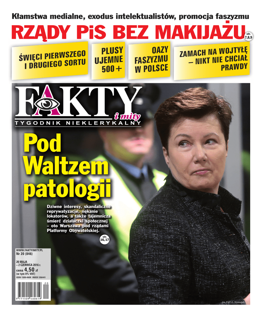 Kłamstwa medialne, exodus intelektualistów, promocja faszyzmu RZĄDY PiS BEZ MAKIJAŻU str. 7,8,9 SY U L P O G E Z S ŚWIĘCI PIERW E N M E J U U T R O S O I DRUGIEG 500+ OAZY FASZYZMU W POLSCE ŁĘ Y T J O W A N H C A ZAM Ł – NIKT NIE CHCIA PRAWDY Pod Waltzem patologii Dziwne interesy, skandaliczne reprywatyzacje, nękanie lokatorów, a także tajemnicza śmierć działaczki społecznej – oto Warszawa pod rządami Platformy Obywatelskiej. str. 16, 17 WWW.FAKTYIMITY.PL Nr 20 (846) 20 MAJA – 2 CZERWCA 2016 r. cena 4,50 zł (w tym 8% VAT) ISSN 1509-460X INDEX 356441 fot. PAP/ L. Szymański strona 2 KSIĄDZ NAWRÓCONY nr 20 (846) 20–26.05.2016 r. Fakty i Mity Komentarz naczelnego P Cuda na kiju olacy są nieufni. Plasujemy się na szarym końcu Europy w kategorii wzajemnego zaufania. To niestety przekłada się na permanentnie kiepski stan gospodarki. Dla porównania: w Danii, gdzie poziom zaufania jest najwyższy, szczytują także wskaźniki ekonomiczne. Z drugiej strony ostrożność z tyłu głowy uchroniła niejednego Polaka przed utratą dorobku życia. Ale to już temat na inną opowieść. Według sondaży wybitnie nie ufamy bogatym sąsiadom, teściowym, politykom i lekarzom – co jest odczuciem uzasadnionym, gdyż to na nich najczęściej się zawiedliśmy. Od czasu stosowania przez przestępców numeru „na wnuczka”, dziadkowie nie ufają wnukom. I nikomu innemu. Wierzymy wybitnie straży pożarnej, ale chyba tylko dlatego, że nasz dom jeszcze się nie spalił. Ci, którym się spalił (siłą rzeczy jest ich mniejszość) – już nie wierzą. Jednak taka zależność pomiędzy faktem dokonanym a wiarą, nie jest regułą. Otóż – jak zbadał CBOS – najwięcej Polaków wierzy w cuda. Aż 70 procent! Co ciekawe, w porównaniu z poprzednim badaniem z 1997 roku nastąpił tu przyrost o 10 procent. Tylko wiara w Boga jest u nas bardziej powszechna – 83 procent (przewyższa wiarę w strażaków o 14 procent). Z tego wynika, że 13 proc. (83–70=13) nie traktuje bóstwa w kategoriach nadprzyrodzonych. Cóż, faktem jest, że dla wielu wierzących rodaków Bogiem jest ksiądz Rydzyk albo Pan Prezes. Ciekawe jest i to, że z mniejszą wiarą podchodzimy do życia pozagrobowego (66 proc.), nieśmier telności duszy (a to jakaś różnica?) czy zmar twychwstania umarłych. Nie ludzie autorytety, nie nauka, nawet nie Kościół, lecz cuda są w Polsce najbardziej godne zaufania! A chodzi o fizyczne zjawiska paranormalne, dające się poznać mędrca „szkiełkiem i okiem”. Na przykład: przemiana opłatka w mięsień sercowy (ostatnio Sokółka i Legnica), wykwity obrazów Jezusa i Maryi na pniach drzew i na szybach wiejskich chat (czemu nie na nowoczesnych wieżowcach?), tudzież zjawy tychże, też głównie na drzewach i w grotach skalnych. Wynika z tego, że Święta Rodzina zdecydowanie preferuje środowisko naturalne, co nas powinno cieszyć. Niekościelni znawcy tematu twierdzą, że ufność w prawdziwość tego rodzaju zjawisk oznacza brak zaufania do nauki FAKTY PiS przedstawił tzw. audyt poprzedniego rządu. Były to wielogodzinne opowieści polityków Kaczyńskiego o poprzednikach bez przedstawienia niezbędnych dokumentów. Nie chodzi o to, że bronimy tak bardzo krytykowanych przez nas przez lata rządów POPSL. Chodzi o to, że ten żenujący „audyt” był tylko po to, aby zasłonić chaos dotychczasowych rządów PiS. Wszak obchodzimy właśnie ich półrocze. Lawinowo rośnie liczba emerytur niższych od minimalnej. To skutki 26 lat dzikiego kapitalizmu, który wypchnął z rynku pracy miliony ludzi. Część z nich nie wypracowała minimalnego wieku emerytalnego przy legalnym zatrudnieniu. Podobno najniższa emerytura wynosi... 45 groszy miesięcznie. W ciągu 3 lat liczba emerytów ze świadczeniem niższym od minimalnego wzrosła z 24 tysięcy do 61 tys. To prawdziwa katastrofa, bo tłumy ludzi zaczną przychodzić do pomocy społecznej z oczekiwaniem ratunku. i wiedzy. A także odreagowanie wobec laicyzacji i modernizacji społeczeństw. Ponoć jest to również przejaw buntu wiernych zawiedzionych instytucjami kościelnymi. To – wbrew pozorom – dość oczywiste. Ludzie są na ogół wzrokowcami. Wolą Jezusa i Maryję zobaczyć, a najlepiej jeszcze dotknąć, zamiast słuchać o nich na kazaniu czy w komunikacie Konferencji Episkopatu. O ile ta uzna, że nie ma aktualnie ważniejszych tematów. Czyli Polacy katolicy nie wierzą nauce, ale wierzą fizycznemu, tj. – jakkolwiek by patrzeć – naukowemu oglądowi. To w końcu wierzą czy nie wierzą własnym oczom? Oto wielka tajemnica wiary… Specjaliści zwracają uwagę na sezonowy charakter cudów. I tak w czasach ofensywy reformacji, kiedy protestanci głośno kwestionowali realną przemianę chleba i wina w ciało i krew Jezusa, nastąpił na całym świecie wysyp cudów eucharystycznych – głównie krwawiących hostii. Później zjawiska te ustały aż do naszych, bezbożnych czasów. W Polsce mieliśmy cuda antykomunistyczne, jako reakcję nieba na sekularyzację i ateizację. Najgłośniejszy był tzw. cud lubelski z 1949 r., kiedy Maryja płakała „rzewnymi łzami” nad zaprzaństwem komuchów. Chyba tylko zatwardziali aparatczycy par tyjni (a i to nie wszyscy) mieli wątpliwości, że jest to płacz o charakterze polityczno-reakcyjnym. No i że jest „rzewny”. Natomiast setki szeregowych działaczy PZPR aluzju paniały i zostawiły u stóp Matki Boskiej stos legitymacji członkowskich. Kilka lat później komuniści zaczęli wyrzucać katechetów ze szkół publicznych. I co? I Maryja pokazała się na szybie szkoły podstawowej w Chełmku i w kilku innych szkołach. Na szczęście Pan Bóg uwzględnia w swej polityce wobec ludzkości istnienie wolnej woli. Każdy więc ma prawo wierzyć w co tylko chce. Ale są też inne przejawy wiary w cuda, ani chybi o podwójnym dnie religijnym. Znałem kiedyś matkę wychowującą samotnie trzy dziewczynki, która jakąś po