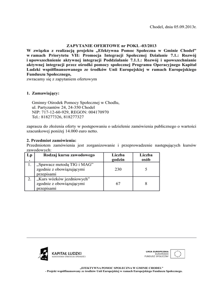 Chodel, dnia 05.09.2013r. ZAPYTANIE OFERTOWE nr POKL -03/2013 W związku z realizacją projektu „Efektywna Pomoc Społeczna w Gminie Chodel” w ramach Priorytetu VII: Promocja Integracji Społecznej Działanie 7.1.: Rozwój i upowszechnienie aktywnej integracji Poddziałanie 7.1.1.: Rozwój i upowszechnianie aktywnej integracji przez ośrodki pomocy społecznej Programu Operacyjnego Kapitał Ludzki współfinansowanego ze środków Unii Europejskiej w ramach Europejskiego Funduszu Społecznego, zwracamy się z zapytaniem ofertowym 1. Zamawiający: Gminny Ośrodek Pomocy Społecznej w Chodlu, ul. Partyzantów 24, 24-350 Chodel NIP: 717-12-60-929, REGON: 004170970 Tel.: 818277326, 818277327 zaprasza do złożenia oferty w postępowaniu o udzielenie zamówienia publicznego o wartości szacunkowej poniżej 14.000 euro netto. 2. Przedmiot zamówienia: Przedmiotem zamówienia jest zorganizowanie i przeprowadzenie następujących kursów zawodowych: Lp Rodzaj kursu zawodowego Liczba Liczba . godzin osób 1. „Spawacz metodą TIG i MAG” zgodnie z obowiązującymi 230 5 przepisami 2. „Kurs wózków jezdniowych” zgodnie z obowiązującymi 67 8 przepisami „EFEKTYWNA POMOC SPOŁECZNA W GMINIE CHODEL” - Projekt współfinansowany ze środków Unii Europejskiej w ramach Europejskiego Funduszu Społecznego. Jednakże Zamawiający zastrzega sobie prawo do zmniejszenie lub zwiększenia ilości osób na kursy zawodowe, jeżeli wystąpią przyczyny od niego niezależne, nieznane w chwili publikowania zapytania ofertowego. Minimalny zakres tematyczny do pkt 1: - zasady BHP - bezpieczna praca na hali produkcyjnej - zastosowanie elektryczności do spawania łukowego - oznaczanie i wymiarowanie spoin - metody przygotowania złączy do spawania - budowa i użytkowanie urządzeń do spawania MAG - charakterystyka spawania MAG - budowa i użytkowanie urządzeń do spawania TIG - charakterystyka spawania TIG - zajęcia praktyczne Minimalny zakres tematyczny do pkt 2: - podstawy wiedzy o wózkach widłowych - wyposażenie wózka widłowego - obsługa wózka widłowego - elektryczne wózki podnośnikowe - spalinowe wózki podnośnikowe - dozór techniczny i dodatkowe informacje - zajęcia praktyczne- nauka jazdy 3. Istotne warunki zamówienia: - celem kursów jest teoretyczne i praktyczne nabycie umiejętności i/lub uprawnień do wykonywania zawodu, - kurs zawodowy powinien zawierać minimum programowe określone dla każdego typu kursów, 3.1 Zamawiający nie dopuszcza możliwości składania ofert częściowych. 3.2 Zamawiający nie dopuszcza możliwości składania ofert wariantowych. 3.3 Zamawiający zastrzega sobie możliwość prowadzenia bieżącego nadzoru nad procesem szkolenia kursantów – na każdym jego etapie. 3.5 Oznaczenie wg Wspólnego Słownika Zamówień (CPV) 80-500000-9 Usługi szkoleniowe „EFEKTYWNA POMOC SPOŁECZNA W GMINIE CHODEL” - Projekt współfinansowany ze środków Unii Europejskiej w ramach Europejskiego Funduszu Społecznego. 4. Informacje dotyczące kursów: - kursy zawodowe powinny zakończyć się wydaniem odpowiedniego dokumentu potwierdzającego ukończenie zajęć w postaci zaświadczenia/ certyfikatu/ świadectwa. - w czasie zajęć powinna zostać zapewniona usługa cateringowa obejmująca ciepły posiłek dla każdego uczestnika kursu zawodowego oraz serwis kawowy: napój np. kawa, herbata, woda, kruche ciastka itp., - zajęcia powinny odbywać się zgodnie z harmonogramem zajęć opracowanym przez Wykonawcę, - miejsce realizacji: Chodel lub w miejscowości położonej w odległości nie większej niż 15 km od Chodla - metody szkoleniowe: prezentacje, wykłady, zajęcia praktyczne, ćwiczenia. 4.2 Wykonawca odpowiedzialny będzie za: - realizację programu merytorycznego, - prowadzenie dzienników zajęć, list obecności, list potwierdzających odbiór materiałów szkoleniowych, list potwierdzających skorzystanie z usługi cateringowej przez uczestników kursów zawodowych oraz innych dokumentów wg zaleceń Zamawiającego, - zapewnienie materiałów biurowych i dydaktycznych dla każdego uczestnika, - zapewnienie odpowiednich warunków lokalowych- sale szkoleniowe przystosowane pod względem sanitarnym, przeciwpożarowym i BHP, dostosowane do liczby uczestników z odpowiednią liczbą miejsc i krzeseł tj. stolików i krzeseł, z urządzeniami projekcyjnymi typu projektor, ekran projekcyjny lub tablica i interaktywna, flipchart, inne sprzęty niezbędne do realizacji programu szkolenia - zapewnienie w czasie zajęć usługi cateringowej, - oznaczenie materiałów szkoleniowych, dydaktycznych, sal szkoleniowych, zaświadczeń lub certyfikatów zgodnie z wytycznymi dotyczącymi oznaczeń projektów w ramach Programu Operacyjnego Kapitał Ludzki, - przekazanie każdemu uczestnikowi zaświadczeń lub certyfikatów ukończenia kursu zawodowego, - przeprowadzenie niezbędnych badań lekarskich - zapewnienie dojazdu każdemu uczestnikowi kursu lub zapewnienie zwrotu kosztów dojazdu na kursy zawodowe, - ubezpieczenia uczestników kursu na czas trwania szkolenia. Wykonawca ponosi pełną odpowiedzialność wobec Zamawiającego za wszelkie szkody powstałe w trakcie realizacji umowy, jak również za roszczenia cywilno-prawne osób trzecich spowodowane działalnością lub brakiem działania Wykonawcy/lub Podwykonawcy przy realizacji przedmiotu umowy 4. Cena jest jedynym kryterium oceny: tak W cenę należy wliczyć wszystkie elementy potrzebne do zorganizowania i przeprowadzenia kursów zawodowych np. przeprowadzenie badań lekarskich, koszt materiałów szkoleniowych, materiałów dydaktycznych, (które przechodzą na własność uczestnika) koszt wydanego zaświadczenia/certyfikatu o ukończeniu kursu /świadectwo egzaminu itp. Kryteria oceny: „EFEKTYWNA POMOC SPOŁECZNA W GMINIE CHODEL” - Projekt współfinansowany ze środków Unii Europejskiej w ramach Europejskiego Funduszu Społecznego. cena: 100%. 5. Wymagania wobec Wykonawcy: - Wykonawca musi p