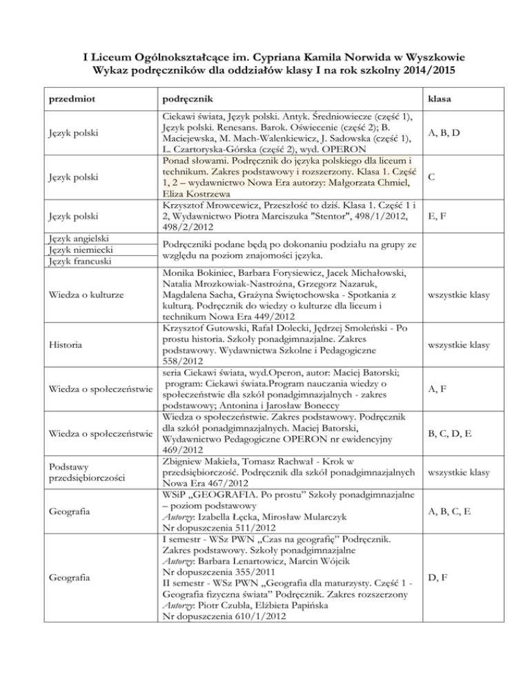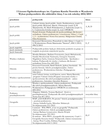 I Liceum Ogólnokształcące im. Cypriana Kamila Norwida w Wyszkowie Wykaz podręczników dla oddziałów klasy I na rok szkolny 2014/2015 przedmiot Język polski Język polski Język polski Język angielski Język niemiecki Język francuski podręcznik Ciekawi świata, Język polski. Antyk. Średniowiecze (część 1), Język polski. Renesans. Barok. Oświecenie (część 2); B. Maciejewska, M. Mach-Walenkiewicz, J. Sadowska (część 1), L. Czartoryska-Górska (część 2), wyd. OPERON Ponad słowami. Podręcznik do języka polskiego dla liceum i technikum. Zakres podstawowy i rozszerzony. Klasa 1. Część 1, 2 – wydawnictwo Nowa Era autorzy: Małgorzata Chmiel, Eliza Kostrzewa Krzysztof Mrowcewicz, Przeszłość to dziś. Klasa 1. Część 1 i 2, Wydawnictwo Piotra Marciszuka "Stentor", 498/1/2012, 498/2/2012 klasa A, B, D C E, F Podręczniki podane będą po dokonaniu podziału na grupy ze względu na poziom znajomości języka. Monika Bokiniec, Barbara Forysiewicz, Jacek Michałowski, Natalia Mrozkowiak-Nastrożna, Grzegorz Nazaruk, Wiedza o kulturze Magdalena Sacha, Grażyna Świętochowska - Spotkania z kulturą. Podręcznik do wiedzy o kulturze dla liceum i technikum Nowa Era 449/2012 Krzysztof Gutowski, Rafał Dolecki, Jędrzej Smoleński - Po prostu historia. Szkoły ponadgimnazjalne. Zakres Historia podstawowy. Wydawnictwa Szkolne i Pedagogiczne 558/2012 seria Ciekawi świata, wyd.Operon, autor: Maciej Batorski; program: Ciekawi świata.Program nauczania wiedzy o Wiedza o społeczeństwie społeczeństwie dla szkół ponadgimnazjalnych - zakres podstawowy; Antonina i Jarosław Boneccy Wiedza o społeczeństwie. Zakres podstawowy. Podręcznik dla szkół ponadgimnazjalnych. Maciej Batorski, Wiedza o społeczeństwie Wydawnictwo Pedagogiczne OPERON nr ewidencyjny 469/2012 Zbigniew Makieła, Tomasz Rachwał - Krok w Podstawy przedsiębiorczość. Podręcznik dla szkół ponadgimnazjalnych przedsiębiorczości Nowa Era 467/2012 WSiP „GEOGRAFIA. Po prostu” Szkoły ponadgimnazjalne – poziom podstawowy Geografia Autorzy: Izabella Łęcka, Mirosław Mularczyk Nr dopuszczenia 511/2012 I semestr - WSz PWN „Czas na geografię” Podręcznik. Zakres podstawowy. Szkoły ponadgimnazjalne Autorzy: Barbara Lenartowicz, Marcin Wójcik Nr dopuszczenia 355/2011 Geografia II semestr - WSz PWN „Geografia dla maturzysty. Część 1 Geografia fizyczna świata” Podręcznik. Zakres rozszerzony Autorzy: Piotr Czubla, Elżbieta Papińska Nr dopuszczenia 610/1/2012 wszystkie klasy wszystkie klasy A, F B, C, D, E wszystkie klasy A, B, C, E D, F Biologia Chemia Fizyka Fizyka Matematyka Matematyka Informatyka Edukacja dla bezpieczeństwa Karolina Archacka, Rafał Archacki, Krzysztof Spalik, Joanna Stocka Biologia. Po prostu. Zakres podstawowy. Podręcznik dla szkół ponadgimnazjalnych Wydawnictwa Szkolne i Pedagogiczne 532/2012 Romuald Hass, Aleksandra Mrzigod, Janusz Mrzigod - To jest chemia. Podręcznik dla szkół ponadgimnazjalnych. Zakres podstawowy Nowa Era 438/2012 Marcin Braun, Weronika Śliwa, Odkryć fizykę. Podręcznik dla szkół ponadgimnazjalnych. Kształcenie ogólne w zakresie podstawowym. Nowa Era Spółka z o.o. 447/2012 pod redakcją Marii Fiałkowskiej; Świat fizyki. Podręcznik dla uczniów szkół ponadgimnazjalnych. Poziom podstawowy.; Wydawnictwo ZamKor P. Sagnowski i Wspólnicy Sp. j.; 394/2011 Marcin Kurczab, Elżbieta Kurczab, Elżbieta Świda Matematyka. Podręcznik do liceów i techników. Zakres podstawowy. Klasa 1 Oficyna Edukacyjna Krzysztof Pazdro 412/1/2012 Marcin Kurczab, Elżbieta Kurczab, Elżbieta Świda Matematyka. Podręcznik do liceów i techników. Zakres podstawowy i rozszerzony. Klasa 1 Oficyna Edukacyjna Krzysztof Pazdro Sp. z o.o. 563/1/2012 E. Krawczyński, Z. Talaga, M.Wilk, Informatyka nie tylko dla uczniów. Podręcznik. Zakres podstawowy. Wydawnictwo Szkolne PWN, nr 414/2012 Barbara Boniek, Andrzej Kruczyński, Łukasz WryczRekowski - Edukacja dla bezpieczeństwa. Podręcznik dla szkół ponadgimnazjalnych Wydawnictwo Pedagogiczne OPERON 409/2012 wszystkie klasy wszystkie klasy B A, C, D, E, F A, C, F B, D, E wszystkie klasy wszystkie klasy