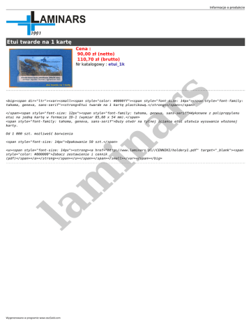 Informacje o produkcie Etui twarde na 1 kartę Cena : 90,00 zł (netto) 110,70 zł (brutto) in ar s Nr katalogowy : etui_1k <big><span dir="ltr"><var><small><span style="color: #0000ff"><span style="font-size: 14px"><span style="font-family: tahoma, geneva, sans-serif"><strong>Etui twarde na 1 kartę plastikową.</strong></span></span> </span><span style="font-size: 12px"><span style="font-family: tahoma, geneva, sans-serif">Wykonane z polipropylenu etui na jedną kartę w formacie ID-1 (wymiar 85,60 x 54 mm).</span> <span style="font-family: tahoma, geneva, sans-serif">Duży otwór na tylnej ściance etui ułatwia wysuwanie włożonej karty. Od 1 000 szt. możliwość barwienia <span style="font-size: 14px">Opakowanie 50 szt.</span> la m <u><span style="font-size: 14px"><strong><a href="http://www.laminars.pl//CENNIKI/holdery1.pdf" target="_blank"><span style="color: #800000">Zobacz zestawienie i cennik (pdf)</span></a></strong></span></u></span></span></small></var></span></big> Wygenerowano w programie www.oscGold.com