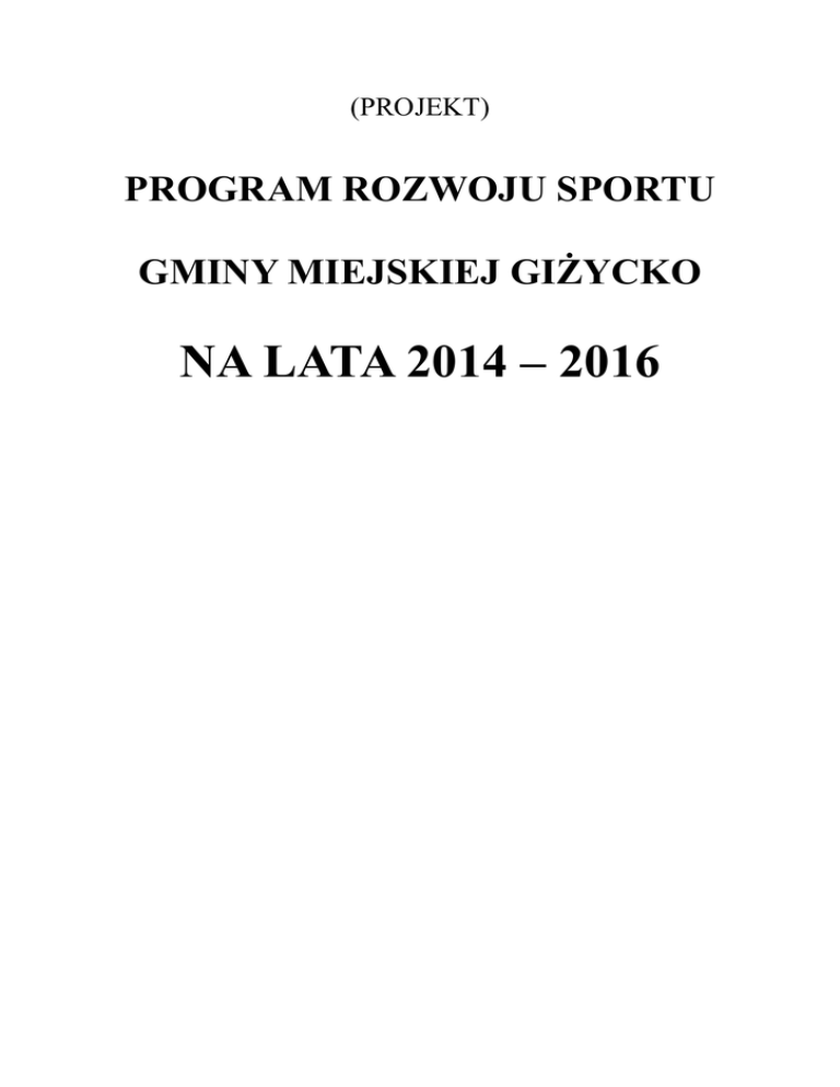 (PROJEKT) PROGRAM ROZWOJU SPORTU GMINY MIEJSKIEJ GIŻYCKO NA LATA 2014 – 2016 I. Przesłanki powstania programu Ustawa o sporcie z 25 czerwca 2010 r. (Dz.U. z 2010 r. nr 127 poz. 857) zastąpiła dwa akty prawne, które do tej pory w tym obszarze funkcjonowały: ustawę o sporcie kwalifikowanym i ustawę o kulturze fizycznej. Zgodnie z w/w ustawą doprecyzowano pojęcie „sport”, określając je jako wszelkie formy aktywności fizycznej, które przez uczestnictwo doraźne lub zorganizowane wpływają na wypracowanie lub poprawienie kondycji fizycznej i psychicznej. Formy te wpływają na rozwój stosunków społecznych lub na osiągnięcie wyników sportowych na wszelkich poziomach. Sport wraz z wychowaniem fizycznym i rehabilitacją ruchową określono mianem kultury fizycznej. Nowa ustawa precyzuje również warunki wspierania sportu przez organy władzy publicznej, określając je jako zadanie własne jednostek samorządu terytorialnego. Dlatego też w trosce o rozwój kultury fizycznej mieszkańców został opracowany nowy Program Rozwoju Sportu na terenie Gminy Miejskiej Giżycko na lata 2014-2016. Jest on zgodny z ogólnopolską strategią rozwoju sportu do 2016 roku. Giżycki Program swym zasięgiem obejmuje szkoły podstawowe i gimnazja, Miejski Ośrodek Sportu i Rekreacji, Centrum Profilaktyki Uzależnień i Integracji Społecznej, Giżyckie Centrum Kultury oraz kluby sportowe i stowarzyszenia funkcjonujące na terenie Gminy Miejskiej Giżycko. Nikt już nie wątpi, że kultura fizyczna jest bardzo ważną domeną życia, która ma olbrzymie znaczenie w rozwoju jakości życia mieszkańców Giżycka. Mieszkańcy Giżycka pod względem demograficznym nie odbiegają od innych tej wielkości miast w Polsce. Są wśród nas ludzie o różnym statusie materialnym, społecznym i o różnych predyspozycjach psychofizycznych. Stąd Program Rozwoju Sportu musi choć w minimalnym stopniu uwzględniać wszystkie te aspekty. Konsekwentna realizacja poprzedniego Programu Rozwoju Sportu na terenie Gminy Miejskiej w Giżycku na lata 2006-2012 pozwoliła samorządowi na realizację większości celów w nim zawartych, szczególnie tych związanych z rozbudową infrastruktury sportowej oraz tych, które rozszerzyły ofertę aktywnego spędzania czasu wolnego. Mając powyższe na uwadze, tym bardziej należy dążyć do sprawnego wdrożenia nowego programu w życie oraz powiązać go z bardziej racjonalnym i realnym wydatkowaniem środków finansowych. Obecnie funkcjonujące prawo nadal nie przewiduje większych ulg dla firm, które chciałyby sponsorować zajęcia sportowo-rekreacyjne. Dlatego też, w dobie kryzysu, finansowanie sportu w znaczącej mierze będzie się opierać na funduszach samorządowych, na wszelkich możliwych dotacjach oraz dobrowolnych wpłatach rodziców i osób biorących udział w zajęciach. Proponowany Program Rozwoju Sportu wynika z analizy aktualnego stanu sportu, zasobów ludzkich i bazy sportowo - rekreacyjnej w Giżycku. Powstał w oparciu o konsultacje ze Społeczną Radą Sportu, ze środowiskiem sportowym, organizacjami pozarządowymi, przedstawicielami różnych dyscyplin. Program określa najważniejsze cele społeczne i wskazuje, jakie należy podjąć niezbędne działania, aby osiągnąć poziom kultury fizycznej na miarę możliwości i standardów innych tej wielkości miast w Polsce i Europie, w perspektywie 2016 roku. II. Diagnoza istniejącego stanu w sporcie giżyckim a) Analiza aktualnej sytuacji w sporcie oraz zestawienie nakładów finansowych poniesionych przez Gminę w trakcie realizacji Programu Rozwoju Sportu na lata 2006-2012 Na podstawie szeregu opinii oraz wywiadów przeprowadzonych zarówno z działaczami sportowymi, nauczycielami wf trenerami, osobami wyczynowo jak i rekreacyjnie uprawiającymi daną dyscyplinę sportową określono mocne i słabe strony sportu w naszym mieście. Do mocnych należy zaliczyć min.: rozbudowę infrastruktury sportowej w minionych czterech latach, aktywność mieszkańców, lokalizację miasta sprzyjającą rozwojowi aktywności fizycznej oraz sporą liczbę klubów i stowarzyszeń kultury fizycznej aktywnie działających w naszym mieście, których wychowankowie są rozpoznawalni w całym kraju. Nasze słabe strony to m.in. konieczność ponoszenia dużych nakładów finansowych na utrzymanie infrastruktury sportowej wprost z budżetu miasta, słaby przepływ informacji o imprezach sportowych odbywających się na terenie naszego miasta, brak sponsorów imprez sportowych. Realizacja Programu Rozwoju Sportu w Gminie Miejskiej Giżycko na lata 2006-2012 w znacznym stopniu wpłynęła na osiągnięcia sportowe naszych mieszkańców. Najbardziej widoczne jest to w szkolnej rywalizacji sportowej. Szkoła Podstawowa nr 7 w roku szkolnym 2011/2012, na 227 szkół podstawowych biorących udział w współzawodnictwie sportowym województwa warmińsko mazurskiego zajęła pierwsze miejsce. Szkoła Podstawowa nr 4 jest na III miejscu. Szkoła podstawowa z Zespołu Szkół nr 1 była 45, a Szkoła Podstawowa nr 6 została sklasyfikowana na 56 pozycji. W tym samym roku szkolnym nasze trzy gimnazja (na 149 szkół) uplasowały się w pierwszej dziesiątce. Gimnazjum nr 2 zajęło pierwsze miejsce, trzecie miejsce przypadło Gimnazjum z Zespołu Szkół nr 1, a ósme miejsce przypadło Gimnazjum nr 1. Podobnie wygląda klasyfikacja szkół ponadgimnazjalnych gdzie II LO zajęło trzecie miejsce, I LO było piąte, a ZSKŚiA przypadło siódme miejsce. Ranking ten dotyczy 102 szkół ponadgimnazjalnych. Jest to niewątpliwie sukces kadry nauczycielskiej i dyrekcji tych szkół. Praktycznie ze wszystkich wypowiedzi nauczycieli wf wynika, że uczniowie, którzy biorą udział w zawodach sportowych, osiągają dobre i bardzo dobre wyniki w nauce. Duże znaczenie ma także polityka samorządu i tworzenie warunków do rozwoju sportu szkolnego, powszechnego oraz kwalifikowanego (wyczynowego). Nie sposób też nie zauważy