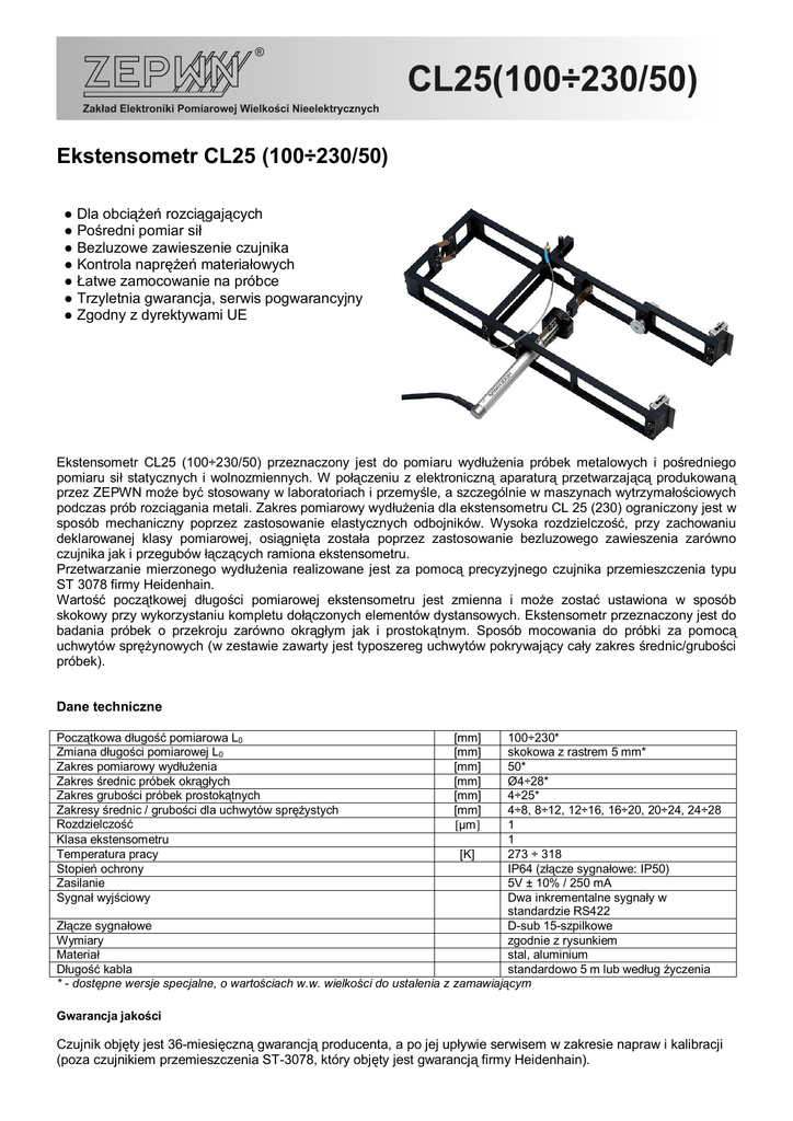 Ekstensometr CL25 (100÷230/50) ● Dla obciążeń rozciągających ● Pośredni pomiar sił ● Bezluzowe zawieszenie czujnika ● Kontrola naprężeń materiałowych ● Łatwe zamocowanie na próbce ● Trzyletnia gwarancja, serwis pogwarancyjny ● Zgodny z dyrektywami UE Ekstensometr CL25 (100÷230/50) przeznaczony jest do pomiaru wydłużenia próbek metalowych i pośredniego pomiaru sił statycznych i wolnozmiennych. W połączeniu z elektroniczną aparaturą przetwarzającą produkowaną przez ZEPWN może być stosowany w laboratoriach i przemyśle, a szczególnie w maszynach wytrzymałościowych podczas prób rozciągania metali. Zakres pomiarowy wydłużenia dla ekstensometru CL 25 (230) ograniczony jest w sposób mechaniczny poprzez zastosowanie elastycznych odbojników. Wysoka rozdzielczość, przy zachowaniu deklarowanej klasy pomiarowej, osiągnięta została poprzez zastosowanie bezluzowego zawieszenia zarówno czujnika jak i przegubów łączących ramiona ekstensometru. Przetwarzanie mierzonego wydłużenia realizowane jest za pomocą precyzyjnego czujnika przemieszczenia typu ST 3078 firmy Heidenhain. Wartość początkowej długości pomiarowej ekstensometru jest zmienna i może zostać ustawiona w sposób skokowy przy wykorzystaniu kompletu dołączonych elementów dystansowych. Ekstensometr przeznaczony jest do badania próbek o przekroju zarówno okrągłym jak i prostokątnym. Sposób mocowania do próbki za pomocą uchwytów sprężynowych (w zestawie zawarty jest typoszereg uchwytów pokrywający cały zakres średnic/grubości próbek). Dane techniczne Początkowa długość pomiarowa L0 Zmiana długości pomiarowej L0 Zakres pomiarowy wydłużenia Zakres średnic próbek okrągłych Zakres grubości próbek prostokątnych Zakresy średnic / grubości dla uchwytów sprężystych Rozdzielczość Klasa ekstensometru Temperatura pracy Stopień ochrony Zasilanie Sygnał wyjściowy [mm] [mm] [mm] [mm] [mm] [mm] [µm] 100÷230* skokowa z rastrem 5 mm* 50* Ø4÷28* 4÷25* 4÷8, 8÷12, 12÷16, 16÷20, 20÷24, 24÷28 1 1 [K] 273 ÷ 318 IP64 (złącze sygnałowe: IP50) 5V ± 10% / 250 mA Dwa inkrementalne sygnały w standardzie RS422 Złącze sygnałowe D-sub 15-szpilkowe Wymiary zgodnie z rysunkiem Materiał stal, aluminium Długość kabla standardowo 5 m lub według życzenia * - dostępne wersje specjalne, o wartościach w.w. wielkości do ustalenia z zamawiającym Gwarancja jakości Czujnik objęty jest 36-miesięczną gwarancją producenta, a po jej upływie serwisem w zakresie napraw i kalibracji (poza czujnikiem przemieszczenia ST-3078, który objęty jest gwarancją firmy Heidenhain). Ekstensometr CL25(100÷230/50)_____________________________________ Rys. 1 Elementy składowe ekstensometru z zaznaczeniem gabarytów i wymiarów istotnych z punktu widzenia własności użytkowych (przedstawiona konfiguracja bez płytek dystansowych w wartości początkowej długości pomiarowej L0=100mm). Rys. 2 Przykład zamocowania ekstensometru do próbki o przekroju okrągłym przy użyciu uchwytu sprężynowego. Producent i dystrybutor________________________________________________________ ZEPWN J. Czerwiński i Wspólnicy – sp.j., 05-270 Marki, ul. Kołłątaja 8 tel./fax: (022) 7812169, 7712411, e-mail: [email protected], http://www.zepwn.com.pl
