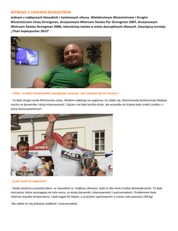 WYWIAD Z VIDASEM BLEKAITISEM Jednym z najlepszych litewskich i światowych siłaczy. Wielokrotnym Wicemistrzem i Drugim Wicemistrzem Litwy Strongman, drużynowym Mistrzem Świata Par Strongman 2007, drużynowym Mistrzem Świata Strongman 2008, rekordzistą świata w wielu dyscyplinach siłowych. Zwycięzcą turnieju „Titan Superpuchar 2013”. - Vidas , to było niesamowite zwycięstwo wczoraj. Jak nazywał się ten turniej ? - To była druga runda Mistrzostw Litwy. Miałem nadzieję na wygraną i to udało się. Dominowały konkurencje kładące nacisk na dynamikę i dużą intensywność. Ciężary nie były bardzo duże, ale wszystko to trzeba było zrobić szybko i z dużą ilością powtórzeń . - A jak znosił to organizm? - Kiedy ostatnio uczestniczyłem w zawodach w trójboju siłowym, było to dla mnie trudne doświadczenie. To były ćwiczenia, które wymagają nie tyle mocy, co dużej dynamiki, intensywności i wytrzymałości. Problemem była również wysoka temperatura. Upał sięgał 30 stopni, a ja jestem sportowcem o masie ciała powyżej 150 kg! Ale udało mi się pokazać szybkość i wytrzymałość. - Rozumiem, że nie ma zbyt dużo czasu na dokonanie zmian w harmonogramie szkoleń pod kontem tego typu obciążeń ? - Zgadza się. Właściwie miałem tylko kilka treningów pod kontem przygotowań do tego turnieju. To tyle co nic, zwłaszcza, że w tym czasie miałem również opanować technikę poszczególnych konkurencji. - Myślę, że to kwestia przypadku i dziękujemy Bogu za to, ale tuż przed rozpoczęciem imprezy poznaliśmy lekarza Nikolaya Lyapko, który przygotował moje ciało do tego turnieju. Co on zrobił ? -Wieczór przed imprezą zastosował pewną procedurę zwaną Akupresurą. Ale nie w sposób tradycyjny, tylko z pomocą specjalnych aplikatorów igłowych, których jest wynalazcą i od wielu lat producentem. Są one od jego nazwiska zwane aplikatorami Lyapko. Doktor osobiście owinął moje ciało tymi pasami wykonanymi z gumy medycznej, w której zatopione było mnóstwo igieł. Musiałem leżeć w tej pozycji przez około godzinę . Jestem przekonany, że to pomogło i spowodowało że czułem się bardzo dobrze w całym turnieju. - Co czułeś, gdy twoje ciało było oplecione pasami pokrytymi igłami ? - To było dziwne uczucie, jakbyś był ubrany w garnitur do którego wnętrza dostały się pszczoły. Ale nie żądliły. Choć z początku było ciężko, jednak szybko przyzwyczaiłem się, a nawet spodobało mi się to co zacząłem odczuwać. Ponadto, dr Lyapko podczas owijania mnie pasami zalecił powolne oddychanie przez nos, co było dla mnie na początku dość trudne. Miałem również na głowie specjalne urządzenie w kształcie piramidy, ograniczające dopływ powietrza. Mimo, że nie było to łatwe starałem się przestrzegać zaleceń dr Lyapko. I to bardzo pomogło w trakcie zawodów. Moi przeciwnicy nie oczekiwali, że tak szybko zregeneruję się do ćwiczeń po trójboju siłowym. Zresztą ja sam byłem równie zaskoczony takim pozytywnym efektem. - I możesz opisać swoje uczucia , zaraz po ściągnięciu igieł ? - Ślady po igłach były na całym ciele, ale czułem się idealnie! Byłem zrelaksowany a całe moje ciało wypoczęte. Miałem dużo siły i energii następnego dnia. - A jak ci się spało po zabiegu ? - Oh spałem bardzo dobrze. Co było dość zaskakujące, jako, że często jestem bardzo zdenerwowany przed imprezą i wtedy nie sypiam dobrze. Ale nie tym razem ! - Czy chciało Ci się jeść i pić po zabiegu ? - Właściwie zawsze bym jadł i pił. - I co czułeś rano - Obudziłem się czując, że spałem bardzo dobrze. Czułem moc, pewność siebie i nie bałem się nikogo z konkurentów. I również czułem się rześki, że chciało mi się bardziej latać, niż chodzić. -Pierwszą konkurencją było log - lift. Trzeba było podnieść 135 kg ciężar tyle razy, ile to możliwe w 60 sekund. A twój wynik był genialny 9 razy. Czy spodziewałeś się tak dobrego wyniku? - Właściwie tak… , to nie był pierwszy raz, kiedy uzyskałem taki wynik. Myślę, że mógłbym podnieść więcej, ale moje obliczenia taktyczne sugerowały, że to było wystarczające dla całkowitej wygranej. Zatem udało mi się zaoszczędzić trochę energii tak potrzebnej w następnych konkurencjach. - Vidas , wszyscy Twoi konkurenci a chyba najbardziej Manhudstone byli pod wrażeniem tego w jaki sposób wykonywałeś swoje próby. Mam na myśli twoje tempo i wynik końcowy. W jednej z konkurencji trzeba było wrzucić 170 kg kamień nad 125 cm pasku tyle razy, ile to możliwe także w ciągu 60 sekund. Zrobiłeś to siedem razy i niewiele zabrakło, żeby Ci się udało zrobić ósmy raz. - To jedno z moich ulubionych ćwiczeń. Zawsze jestem w tym dobry. 170 kg to nie jest dla mnie dużo. Wcześniej podnosiłem 7 razy w ciągu minuty przy wadze kamienia 185 kg.. Muszę jednak podkreślić, że było bardzo gorąco, ponad 30 stopni, więc ręce i piłka były śliskie. I z tego powodu niektórym zawodnikom nie udało się podnieść jej kilka razy więcej. Może, jeśli temperatura były normalna mógłbym zrobić 8 lub 9 powtórzeń. Czułem się dobrze, moje plecy i nogi działały idealnie. To było bardzo niezwykłe wrażenie, że mięśnie pleców nie były zmęczone po takim wysiłku . - To było bardzo widoczne wczoraj , jak szybko regenerowałeś się po każdym ćwiczeniu. Twój oddech też szybko wracał do normy i prawie się nie pociłeś. - Tak, to prawda. Mnie to również zaskoczyło. Myślę, że to było po raz pierwszy w życiu. I teraz mogę powiedzieć, ze 100% pewnością, pomogły igły. Czułem się bardzo dobrze przed imprezą. Regeneracja organizmu po każdym ćwiczeniu była niesamowita ! - Myślę, że Mikołaj Lyapko i jego aplikatory pomogły Ci odkryć swój potencjał, poczuć mięśnie, siłę, swoje tempo i wytrzymałość . - Tak to prawda . To rzeczywiście pomogło ! Doktor Lyapko dał