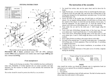 FITTING INSTRUCTION Clamp mark in acc. with ISO PN 1 L 2 + 3 31 4 R 5 58R 6 54 7 58L The instruction of the assembly Cables joining 13 Left directional lights Rear fog lights Ground Right directional lights Right side parking lights Stoplights Left side parking lights D 9 E 7 4 13 B 10 D 10 E C 13 5 13 1 B A 6 A 8 C 18 11 7 9 10 A 13 3 6 2 The towbar can be used in the following car: PEUGEOT 405, 4 doors, produced since 1987 till 1995, catalogue number F05A and is prepared to tow trailers max total weight 1200 kg and max vertical load 65 kg. From manufacturer Thank you for buying our product. Their reliability has been confirmed in many tests. Reliability of towbar depends also on correct assembly and right operation. For this reasons we kindly ask to read carefully this instruction and apply to hints. The towbar should be install in points described by a car producer. 1. For install the towbar, take out the spare wheel and let down the fix basket. 2. Apply the bar (pos. 1) to the chassis of the car and through the holes (pos. A) placed in the left and right side, and across the existing holes in the towing grip designed by the manufacturer and plates (pos. 6) twist bolts M10x30mm (pos. 10). 3. Across the holes in the towbar (pos. B) drill holes to ø10,5mm in the chassis. Use an angular drilling machine, for drill holes to ø21mm, from the outside of the chassis. In each hole put the distance sleeves (pos. 7) from the equipment. Use the washers pos. 13. From the outside of the chassis twist with screws M10x80mm (pos. 9) - look at the drawing. 4. From under the car and by the holes pos. C drill trough using bit ø10,5mm. 5. Twist with bolts M10x30mm through holes of the boot (pos. D) and cover plates (pos. 4 and 5) and holes pos. C. Use the added washers. 6. Twist with screws M10x30mm through holes of the boot (pos. E) and cover plates (pos. 4 and 5). Drill trough the holes to ø10,5 mm. Use the washers. 7. Screw tight all bolts according to the torque shown in the table. 8. Fix body of the automat (pos. 11) and the socket plate (pos. 3) using bolts M12x25mm (pos. 8) from equipment. Place tow-ball (pos. 2) according to supplied instruction. 9. Connect the kit wires to the electric installation, in accordance of the instructions of the car. 10. Complete the possible decreases of the paint cover of towbar, originate during the mounting. Torque settings for nuts and bolts (8,8): M6 - 11 Nm M8 - 25 Nm M10 - 50 Nm M12 - 87 Nm M14 - 138 Nm M16 - 210 Nm NOTE After install the towbar you should get adequate note in registration book (at authorised service station).The car should be equipped with: • Indicators • Tow mirrors After 1000km of exploitation check all bolts and nuts. The ball of towbar must be always kept clear and conserve with a grease. PPUH AUTO-HAK S.J. Towbar equipment: Produkcja Zaczepów Kulowych Henryk & Zbigniew Nejman 76-200 SŁUPSK ul. Słoneczna 16K tel/fax (059) 8-414-414; 8-414-413 E-mail: [email protected] www.autohak.com.pl Towing hitch (without electrical set) Class: A50-X Cat. no. F05A Technical data: D-value: 6,83 kN maximum trailer weight: 1200 kg maximum vertical cup load: 65 kg Designed for: Manufacturer: PEUGEOT Model: 405 Type: 4 doors produced since 1987 till 1995 Approval number according to Directive 94/20/EC: e20*94/20*1090*00 Foreword This towbar is designed according to rules of safety traffic regulations. The towing hitch is a safety component and can be install only by qualified personnel. Any alteration or conversion of the towing hitch is prohibited and would lead to cancellation of design certification. Remove insulating compound and underseal from vehicle (if present) in the area of the matting surfaces of the towing hitch. The vehicle manufacturer’s specifications regarding trailer load and max. vertical cup load are decisive for driving, and values for the towing hitch cannot be exceeded. D-value formula: Max trailer weight [kg] x Max trailer weight [kg] + Max vehicle weight [kg] Max vehicle weight [kg] X 9,81 = 1000 D [kN] INSTRUKCJA montaŜu i eksploatacji zaczepu kulowego Oznaczenie zacisku wg ISO PN 1 L 2 + 3 31 4 R 5 58R 6 54 7 58L 13 Łączenie przewodów Kolejność czynności przy montaŜu: D 9 E 7 Kierunkowskazy lewe Tylne światła przeciwmgłowe Masa Kierunkowskazy prawe Światła pozycyjne prawe Światła hamowania Światła pozycyjne lewe 4 13 B 10 D 10 E C 13 5 13 1 B A 6 A 8 C 18 11 7 9 10 A 13 6 3 2 Zaczep kulowy przeznaczony jest do zamontowania w samochodzie: PEUGEOT 405 4drz., nr katalogowy F05A produkowany od 1987r. do 1995 r. i słuŜy do ciągnięcia przyczep o masie całkowitej do 1200 kg i nacisku na kulę max 65 kg. 1. W celu zamontowania zaczepu naleŜy wyjąć koło zapasowe oraz opuścić kosz mocujący. 2. PrzyłoŜyć belkę główną zaczepu (poz. 1.) do podwozia samochodu i przez otwory zaczepu (poz. A) po lewej i prawej stronie i poprzez istniejące otwory w uchu holowniczym oraz płytki (poz. 6) skręcić śrubami M10x30mm (poz. 10). 3. Poprzez otwory zaczepu (poz. B) przewiercić otwory wiertłem ø10,5mm w podłuŜnicy, a następnie wiertarką kątową od zewnętrznej strony podłuŜnicy rozwiercić otwór wiertłem ø21mm i w rozwiercony otwór włoŜyć tulejki (poz. 7) z wyposaŜenia, poprzez podkładkę (poz. 13) od zewnętrznej strony podłuŜnicy skręcić śrubami M10x80mm (poz. 9) - patrz rysunek. 4. Od spodu samochodu przez otwory zaczepu (poz. C) przewiercić otwory wiertłem ø10,5mm. 5. Od strony bagaŜnika przez otwory (poz. D) nakładki (poz. 3 i 4) oraz otwory zaczepu (poz. C) skręcić śrubami M10x30mm (poz. 10) wykorzystując podkładki. 6. Od strony bagaŜnika przez otwory (poz. E) nakładki (poz. 3 i 4) przewiercić otwory wiertłem 10,5mm a następnie skręcić śrubami M10x30mm (wykorzystując duŜe podkładki poz. 13). 7. Dokręcić śruby momentem jak pokazano w tabeli. 8. Przykręcić korpus automatu poz. 11 śrubami M12x25mm poz. 8 wraz z blachą pod gniazdo poz. 3. Zamocować kul