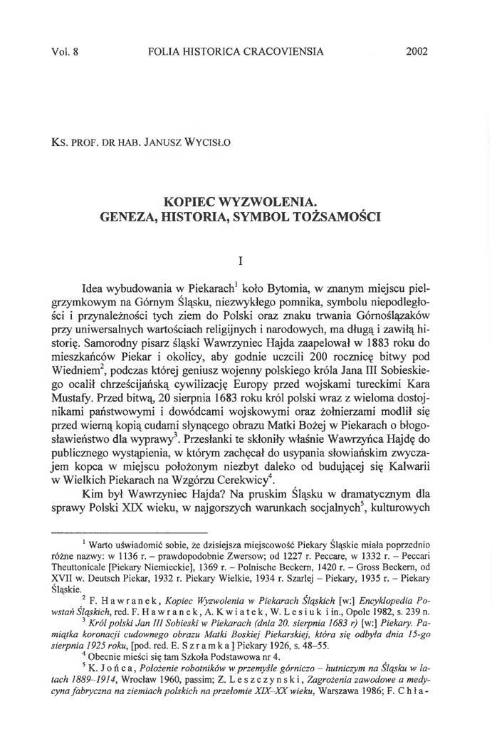 Yol. 8 FOLIA HISTORICA CRACOVIENSIA 2002 K S. PROF. DR HAB. JANUSZ WYCISŁO KOPIEC WYZWOLENIA. GENEZA, HISTORIA, SYMBOL TOŻSAMOŚCI I Idea wybudowania w Piekarach1 koło Bytomia, w znanym miejscu piel grzymkowym na Górnym Śląsku, niezwykłego pomnika, symbolu niepodległo ści i przynależności tych ziem do Polski oraz znaku trwania Górnoślązaków przy uniwersalnych wartościach religijnych i narodowych, ma długą i zawiłą hi storię. Samorodny pisarz śląski Wawrzyniec Hajda zaapelował w 1883 roku do mieszkańców Piekar i okolicy, aby godnie uczcili 200 rocznicę bitwy pod Wiedniem2, podczas której geniusz wojenny polskiego króla Jana III Sobieskie go ocalił chrześcijańską cywilizację Europy przed wojskami tureckimi Kara Mustafy. Przed bitwą, 20 sierpnia 1683 roku król polski wraz z wieloma dostoj nikami państwowymi i dowódcami wojskowymi oraz żołnierzami modlił się przed wierną kopią cudami słynącego obrazu Matki Bożej w Piekarach o błogo sławieństwo dla wyprawy3. Przesłanki te skłoniły właśnie Wawrzyńca Hajdę do publicznego wystąpienia, w którym zachęcał do usypania słowiańskim zwycza jem kopca w miejscu położonym niezbyt daleko od budującej się Kalwarii w Wielkich Piekarach na Wzgórzu Cerekwicy4. Kim był Wawrzyniec Hajda? Na pruskim Śląsku w dramatycznym dla sprawy Polski XIX wieku, w najgorszych warunkach socjalnych5, kulturowych 1 Warto uświadomić sobie, że dzisiejsza miejscowość Piekary Śląskie miała poprzednio różne nazwy: w 1136 r. - prawdopodobnie Zwersow; od 1227 r. Peccare, w 1332 r. - Peccari Theuttonicale [Piekary Niemieckie], 1369 r. - Polnische Beckem, 1420 r. - Gross Beckem, od XVII w. Deutsch Piekar, 1932 r. Piekary Wielkie, 1934 r. Szarlej - Piekary, 1935 r. - Piekary Śląskie. 2 F. H a w r a n e k , Kopiec Wyzwolenia w Piekarach Śląskich [w:] Encyklopedia Po wstań Śląskich, red. F. H a w r a n e k , A. K w i a t e k , W. L e s i u k i in., Opole 1982, s. 239 n. 3 Król polski Jan III Sobieski w Piekarach (dnia 20. sierpnia 1683 r) [w:] Piekary. Pa miątka koronacji cudownego obrazu Matki Boskiej Piekarskiej, która się odbyta dnia 15-go sierpnia 1925 roku, [pod. red. E. S z r a m k a ] Piekary 1926, s. 48-55. 4 Obecnie mieści się tam Szkoła Podstawowa nr 4. 5 K. J o ń c a , Położenie robotników w przemyśle górniczo - hutniczym na Śląsku w la tach 1889-1914, Wrocław 1960, passim; Z. L e s z c z y ń s k i , Zagrożenia zawodowe a medy cyna fabryczna na ziemiach polskich na przełomie XIX—X X wieku, Warszawa 1986; F. C h ł a - 150 K s. Ja n u s z W y c isł o i politycznych, a więc w nędzy i w pogardzie6 dojrzewały jednostki, samorodne, zdolne do wypracowania oryginalnych programów działali społeczno-religijnych i narodowych7. Wyrastały w środowisku ludzi ciężkiej pracy. Niespotyka ny w innych regionach Polski, a charakterystyczny dla Śląska nowoczesny ro botnik cechował się tym, że chociaż miał wykształcenie zawodowe i parał się pracą zarobkową z trudem utrzymując rodzinę8, był jednak świadomy swego miejsca w społeczeństwie. Mimo nie sprzyjających warunków, zmęczony nad ludzką pracą fizyczną, potrafił się nastawić na tworzenie dobra wspólnego, które polega na stworzeniu maksymalnych szans rozwojowych osobom przynależnym do różnych społeczności. Miało ono obejmować wszystkie warunki życia spo łecznego, w jakich można pełniej i szybciej osiągnąć własną doskonałość9. Typowym przedstawicielem wąskiej grypy ludzi pracy - samouków z Górnego Śląska, dążących do uświadomienia narodowego mieszkańców tego regionu i przyłączenia tego regionu do Polski, po prawie sześciu wiekach nie woli, po uprzednim odrodzeniu religijno-moralnym społeczeństwa jest Waw rzyniec Hajda10. Uosabiał on wszystko to, co faktycznie - przez 80 lat - składało się na niepowtarzalność Górnego Śląska na przełomie XIX i XX wieku; z tego też względu już za życia określano go mianem „śląskiego Wemyhory”11. Po dobnie bowiem, jak ów ukraiński Kozak, śpiewak ludowy i limik, przeciwnik hajdamaczyzny, a tym samym przemocy i rozlewu krwi, zwolennik dialogu i porozumienia z narodowymi sąsiadami przepowiadający przyszłe losy Polski na podstawie ówczesnych wydarzeń historycznych, zwiastun lepszej doli, szczególnie uwolnienia społeczeństwa z różnych zniewoleń12, wierzył - darząc ogromną miłością swą Ojczyznę - w „zmartwychwstanie Polski”13. Idee religij no - moralne i narodowe głoszone przez ociemniałego, charyzmatycznego działacza społeczno - religijnego Hajdę wśród prawie bezgranicznie oddanej mu młodzieży, wychowywanej w duchu surowych zasad etyczno-moralnych, miały przygotować młode pokolenie Polaków do stworzenia stosunków społecznych p o w s k i , Hygiena rzemiosł, czyli o szkodliwych wpływach każdemu zawodowi właściwych i sposobach zapobieżenia tymże, Bytom 1876. 6 E. K a c z y ń s k a , Dzieje robotników przemysłowych w Polsce, Warszawa 1970; Taż, Położenie klasy robotniczej, [w:] Polska klasa robotnicza. Zarys dziejów, t. 1, cz. 2. Warszawa 1978; S. M i c h a l k i e w i c z , Przemysł i robotnicy na Śląsku (do 1914 roku), Katowice 1984. 7 Można do nich zaliczyć - oprócz W. Hajdy - przede wszystkim: J. Lompę, J. Kopca, J. Ligonia, J. Gajdę, M. Jasionowskiego 8 Zob. Śląscy pisarze ludowi (1800-1914). Antologia poezji i prozy. Wyboru dokonała i opracowała J. K u c i a n k a , Wrocław-Warszawa-Kraków 1986. 9 Współczesne brzmienie zasady dobra wspólnego zawarte jest m.in. w encyklikach społecznych J a n a XXIII Mater et magistra nr 65 i Pacem in terris nr 58. 10 J. W y c i s ł o , Zasada pierwszeństwa odrodzenia religijno-moralnego przed naro dowym, czyli działalność religijno - społeczna Wawrzyńca Hajdy, [w:] J. W y c i s ł o , W kręgu sanktuarium maryjnego w Piekarach Śląskich, Katowice 1997, s. 61-116. 11 K. Ż y d e k , Wernyhora z Piekar, „Katoli