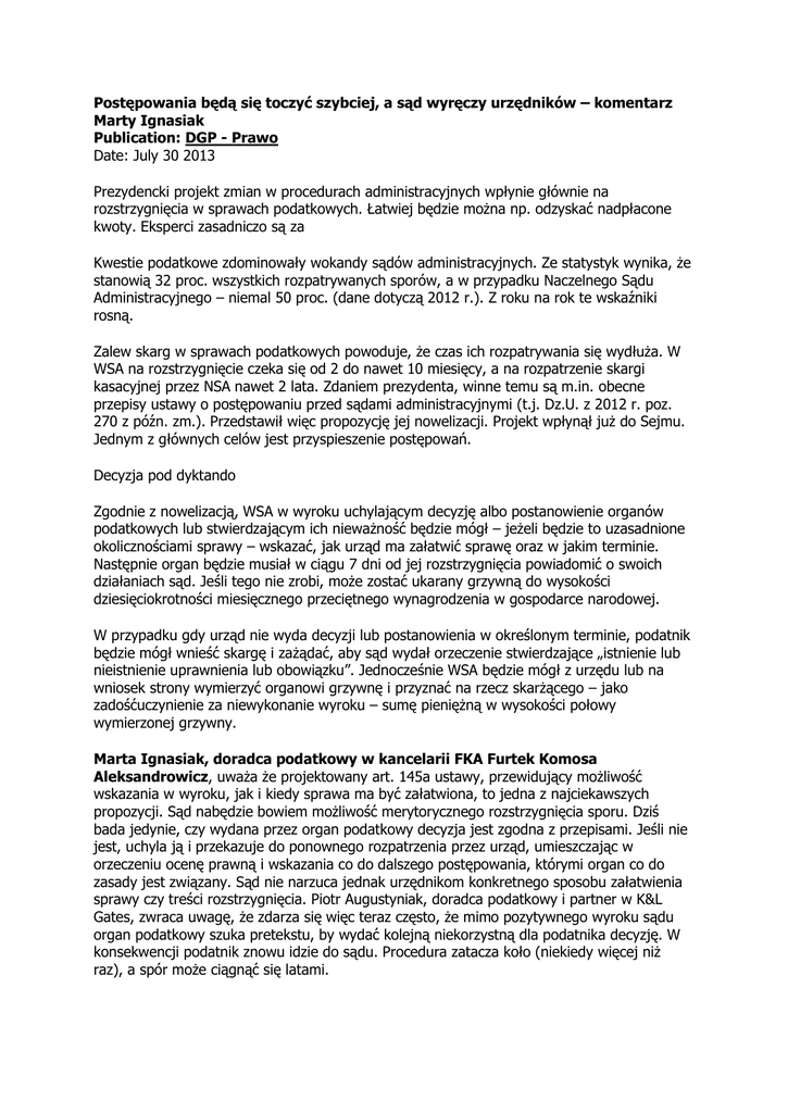 Postępowania będą się toczyć szybciej, a sąd wyręczy urzędników – komentarz Marty Ignasiak Publication: DGP - Prawo Date: July 30 2013 Prezydencki projekt zmian w procedurach administracyjnych wpłynie głównie na rozstrzygnięcia w sprawach podatkowych. Łatwiej będzie można np. odzyskać nadpłacone kwoty. Eksperci zasadniczo są za Kwestie podatkowe zdominowały wokandy sądów administracyjnych. Ze statystyk wynika, że stanowią 32 proc. wszystkich rozpatrywanych sporów, a w przypadku Naczelnego Sądu Administracyjnego – niemal 50 proc. (dane dotyczą 2012 r.). Z roku na rok te wskaźniki rosną. Zalew skarg w sprawach podatkowych powoduje, że czas ich rozpatrywania się wydłuża. W WSA na rozstrzygnięcie czeka się od 2 do nawet 10 miesięcy, a na rozpatrzenie skargi kasacyjnej przez NSA nawet 2 lata. Zdaniem prezydenta, winne temu są m.in. obecne przepisy ustawy o postępowaniu przed sądami administracyjnymi (t.j. Dz.U. z 2012 r. poz. 270 z późn. zm.). Przedstawił więc propozycję jej nowelizacji. Projekt wpłynął już do Sejmu. Jednym z głównych celów jest przyspieszenie postępowań. Decyzja pod dyktando Zgodnie z nowelizacją, WSA w wyroku uchylającym decyzję albo postanowienie organów podatkowych lub stwierdzającym ich nieważność będzie mógł – jeżeli będzie to uzasadnione okolicznościami sprawy – wskazać, jak urząd ma załatwić sprawę oraz w jakim terminie. Następnie organ będzie musiał w ciągu 7 dni od jej rozstrzygnięcia powiadomić o swoich działaniach sąd. Jeśli tego nie zrobi, może zostać ukarany grzywną do wysokości dziesięciokrotności miesięcznego przeciętnego wynagrodzenia w gospodarce narodowej. W przypadku gdy urząd nie wyda decyzji lub postanowienia w określonym terminie, podatnik będzie mógł wnieść skargę i zażądać, aby sąd wydał orzeczenie stwierdzające „istnienie lub nieistnienie uprawnienia lub obowiązku”. Jednocześnie WSA będzie mógł z urzędu lub na wniosek strony wymierzyć organowi grzywnę i przyznać na rzecz skarżącego – jako zadośćuczynienie za niewykonanie wyroku – sumę pieniężną w wysokości połowy wymierzonej grzywny. Marta Ignasiak, doradca podatkowy w kancelarii FKA Furtek Komosa Aleksandrowicz, uważa że projektowany art. 145a ustawy, przewidujący możliwość wskazania w wyroku, jak i kiedy sprawa ma być załatwiona, to jedna z najciekawszych propozycji. Sąd nabędzie bowiem możliwość merytorycznego rozstrzygnięcia sporu. Dziś bada jedynie, czy wydana przez organ podatkowy decyzja jest zgodna z przepisami. Jeśli nie jest, uchyla ją i przekazuje do ponownego rozpatrzenia przez urząd, umieszczając w orzeczeniu ocenę prawną i wskazania co do dalszego postępowania, którymi organ co do zasady jest związany. Sąd nie narzuca jednak urzędnikom konkretnego sposobu załatwienia sprawy czy treści rozstrzygnięcia. Piotr Augustyniak, doradca podatkowy i partner w K&L Gates, zwraca uwagę, że zdarza się więc teraz często, że mimo pozytywnego wyroku sądu organ podatkowy szuka pretekstu, by wydać kolejną niekorzystną dla podatnika decyzję. W konsekwencji podatnik znowu idzie do sądu. Procedura zatacza koło (niekiedy więcej niż raz), a spór może ciągnąć się latami. Proponowane rozwiązanie powinno skrócić czas od momentu wydania wyroku przez sąd do momentu uzyskania przez podatnika korzystnej decyzji administracyjnej – stwierdza Piotr Augustyniak. Dodatkowo, zdaniem naszego rozmówcy, groźba zasądzenia wynagrodzenia dla podatnika przyczyni się do terminowego załatwiania spraw przez urzędników, z czym obecnie w praktyce bywa różnie. Artur Nowak, radca prawny i partner w kancelarii Domański Zakrzewski Palinka, ma nadzieję, że sądy chętnie będą wskazywać, jak powinna brzmieć decyzja administracyjna. Będą to mogły jednak robić, jeżeli będzie to „uzasadnione okolicznościami” sprawy. Zdaniem Artura Nowaka to zastrzeżenie jest zbyt pojemne i nieostre. Wtóruje mu Marta Ignasiak, która uważa, że nie jest jasne, co ta formuła oznacza. – Czy chodzi tu o każdy przypadek, gdy nie wystąpiły błędy proceduralne, tzn. takie nieprawidłowości, które wymagają powtórzenia czynności przez organ administracyjny (np. uzupełnienie postępowania dowodowego) i możliwe jest rozstrzygnięcie co do istoty sprawy, czy tylko o przypadki ewidentne, gdy istnieje ryzyko, że organ nie zastosuje się do zawartych w rozstrzygnięciu sądu oceny prawnej i wskazań co do dalszego postępowania – zastanawia się ekspert. Inaczej niż inni eksperci Marta Ignasiak jest jednak przeciwna mieszaniu uprawnień władzy wykonawczej i sądowniczej, nawet kosztem efektywności i ekonomiki procesu. – Rolą sądów administracyjnych jest orzekanie o zgodności z prawem decyzji administracyjnych, a nie ich przygotowywanie za urzędników – mówi. Wskazuje też, że umieszczane dziś w orzeczeniu ocena prawna i wskazania co do dalszego postępowania w większości przypadków wystarczają do wydania decyzji zgodnej z wolą sądu. Jeśli mimo to organy postępują inaczej, to sąd powinien mieć w takich wypadkach możliwość nakładania na nie grzywny. Szybszy zwrot pieniędzy Specjaliści zwracają jednak uwagę, że przyspieszenie postępowań sądowoadministracyjnych pozwoli na szybsze odzyskiwanie nadpłaconego podatku. Chodzi o sytuację, gdy podatnik uregulował daninę po wydaniu decyzji przez dyrektora izby skarbowej, a później uzyskał korzystny wyrok WSA. Piotr Augustyniak tłumaczy, że obecnie decyzje ostateczne (a więc wydane przez dyrektora izby skarbowej) co do zasady podlegają wykonaniu, niezależnie od złożenia skargi do sądu. Jeśli wynika z nich podatek do zapłaty, to należy go uiścić. – Często kwoty wynikające z tych rozstrzygnień są bardzo wysokie i znane są przypadki, w których podatnicy po latach wygrywali ostatecznie sprawy w sądach, ale wcześniej musieli zamykać firmy