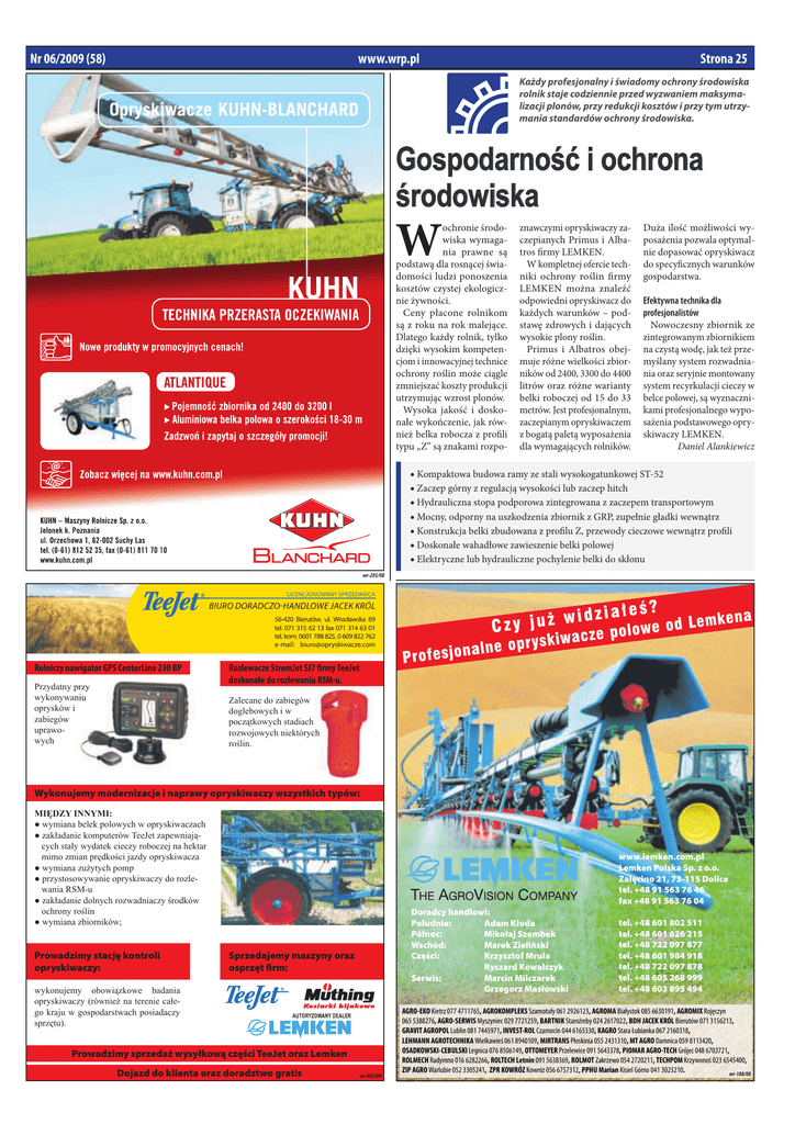 Nr 06/2009 (58) www.wrp.pl Strona 25 Każdy profesjonalny i świadomy ochrony środowiska rolnik staje codziennie przed wyzwaniem maksymalizacji plonów, przy redukcji kosztów i przy tym utrzymania standardów ochrony środowiska. Gospodarność i ochrona środowiska W ochronie środowiska wymagania prawne są podstawą dla rosnącej świadomości ludzi ponoszenia kosztów czystej ekologicznie żywności. Ceny płacone rolnikom są z roku na rok malejące. Dlatego każdy rolnik, tylko dzięki wysokim kompetencjom i innowacyjnej technice ochrony roślin może ciągle zmniejszać koszty produkcji utrzymując wzrost plonów. Wysoka jakość i doskonałe wykończenie, jak również belka robocza z profili typu „Z” są znakami rozpo- znawczymi opryskiwaczy zaczepianych Primus i Albatros firmy LEMKEN. W kompletnej ofercie techniki ochrony roślin firmy LEMKEN można znaleźć odpowiedni opryskiwacz do każdych warunków – podstawę zdrowych i dających wysokie plony roślin. Primus i Albatros obejmuje różne wielkości zbiorników od 2400, 3300 do 4400 litrów oraz różne warianty belki roboczej od 15 do 33 metrów. Jest profesjonalnym, zaczepianym opryskiwaczem z bogatą paletą wyposażenia dla wymagających rolników. Duża ilość możliwości wyposażenia pozwala optymalnie dopasować opryskiwacz do specyficznych warunków gospodarstwa. Efektywna technika dla profesjonalistów Nowoczesny zbiornik ze zintegrowanym zbiornikiem na czystą wodę, jak też przemyślany system rozwadniania oraz seryjnie montowany system recyrkulacji cieczy w belce polowej, są wyznacznikami profesjonalnego wyposażenia podstawowego opryskiwaczy LEMKEN. Daniel Alankiewicz • Kompaktowa budowa ramy ze stali wysokogatunkowej ST-52 • Zaczep górny z regulacją wysokości lub zaczep hitch • Hydrauliczna stopa podporowa zintegrowana z zaczepem transportowym • Mocny, odporny na uszkodzenia zbiornik z GRP, zupełnie gładki wewnątrz • Konstrukcja belki zbudowana z profilu Z, przewody cieczowe wewnątrz profili • Doskonałe wahadłowe zawieszenie belki polowej • Elektryczne lub hydrauliczne pochylenie belki do skłonu wr-205/08 LICENCJONOWANY SPRZEDAWCA BIURO DORADCZO-HANDLOWE JACEK KRÓL 56-420 Bierutów, ul. Wrocławska 69 tel. 071 315 62 13 fax 071 314 63 01 tel. kom. 0601 788 825, 0 609 822 762 e-mail: [email protected] Rolniczy nawigator GPS CenterLine 230 BP Przydatny przy wykonywaniu oprysków i zabiegów uprawowych Rozlewacze StremJet SJ7 firmy TeeJet doskonałe do rozlewania RSM-u. Zalecane do zabiegów doglebowych i w początkowych stadiach rozwojowych niektórych roślin. Wykonujemy modernizacje i naprawy opryskiwaczy wszystkich typów: MIĘDZY INNYMI: ● wymiana belek polowych w opryskiwaczach ● zakładanie komputerów TeeJet zapewniających stały wydatek cieczy roboczej na hektar mimo zmian prędkości jazdy opryskiwacza ● wymiana zużytych pomp ● przystosowywanie opryskiwaczy do rozlewania RSM-u ● zakładanie dolnych rozwadniaczy środków ochrony roślin ● wymiana zbiorników; Prowadzimy stację kontroli opryskiwaczy: Doradcy handlowi: Południe: Adam Kłoda Północ: Mikołaj Szembek Wschód: Marek Zieliński Części: Krzysztof Mrula Ryszard Kowalczyk Serwis: Marcin Milczarek Grzegorz Masłowski Sprzedajemy maszyny oraz osprzęt firm: wykonujemy obowiązkowe badania opryskiwaczy (również na terenie całego kraju w gospodarstwach posiadaczy sprzętu). Prowadzimy sprzedaż wysyłkową części TeeJet oraz Lemken Dojazd do klienta oraz doradztwo gratis wr-002/09 www.lemken.com.pl Lemken Polska Sp. z o.o. Zalęcino 21, 73-115 Dolice tel. +48 91 563 76 46 fax +48 91 563 76 04 tel. +48 601 802 511 tel. +48 601 626 215 tel. +48 722 097 877 tel. +48 601 984 918 tel. +48 722 097 878 tel. +48 605 268 999 tel. +48 603 895 494 AGRO-EKO Kietrz 077 4711765, AGROKOMPLEKS Szamotuły 061 2926123, AGROMA Białystok 085 6630191, AGROMIX Rojęczyn 065 5388276, AGRO-SERWIS Myszyniec 029 7721259, BARTNIK Staroźreby 024 2617022, BDH JACEK KRÓL Bierutów 071 3156213, GRAVIT AGROPOL Lublin 081 7445971, INVEST-ROL Czarnocin 044 6165330, KAGRO Stara Łubianka 067 2160318, LEHMANN AGROTECHNIKA Wielkawieś 061 8940109, MIRTRANS Płoskinia 055 2431310, MT AGRO Damnica 059 8113420, OSADKOWSKI-CEBULSKI Legnica 076 8506149, OTTOMEYER Przelewice 091 5643378, PIOMAR AGRO-TECH Grójec 048 6703721, ROLMECH Radymno 016 6282266, ROLTECH Letnin 091 5638369, ROLMOT Zakrzewo 054 2720211, TECHPOM Krzywonoś 023 6545400, ZIP AGRO Warlubie 052 3305241, ZPR KOWRÓZ Kowróz 056 6757312, PPHU Marian Kisiel Górno 041 3023210. wr-188/08