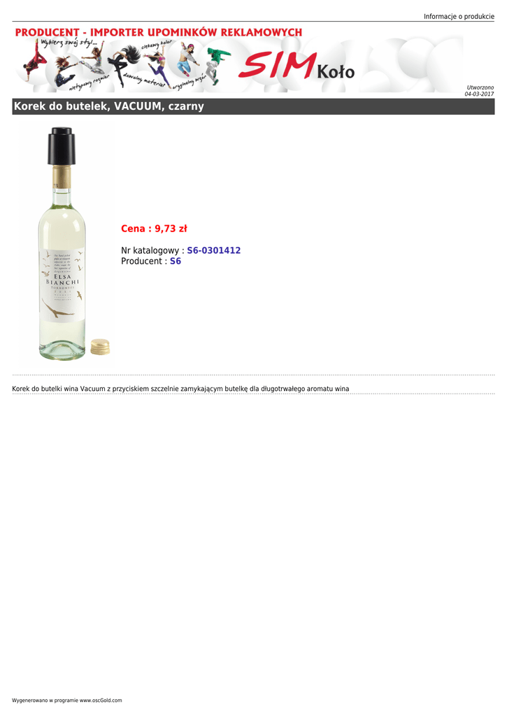 Informacje o produkcie Utworzono 04-03-2017 Korek do butelek, VACUUM, czarny Cena : 9,73 zł Nr katalogowy : S6-0301412 Producent : S6 Korek do butelki wina Vacuum z przyciskiem szczelnie zamykającym butelkę dla długotrwałego aromatu wina Wygenerowano w programie www.oscGold.com