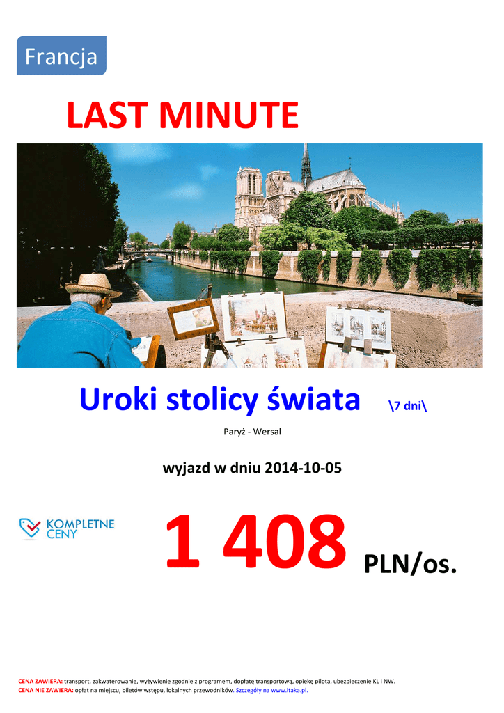 Francja LAST MINUTE Uroki stolicy świata \7 dni\ Paryż - Wersal wyjazd w dniu 2014-10-05 1 408 PLN/os. CENA ZAWIERA: transport, zakwaterowanie, wyżywienie zgodnie z programem, dopłatę transportową, opiekę pilota, ubezpieczenie KL i NW. CENA NIE ZAWIERA: opłat na miejscu, biletów wstępu, lokalnych przewodników. Szczegóły na www.itaka.pl. Włochy LAST MINUTE Wieczne i słoneczne \10 dni\ Florencja - Rzym - Watykan - Asyż - Groty Frasassi - San Marino - Rimini - Wenecja wyjazd w dniu 2014-09-16 1 568 PLN/os. CENA ZAWIERA: transport, zakwaterowanie, wyżywienie zgodnie z programem, dopłatę transportową, opiekę pilota, ubezpieczenie KL i NW. CENA NIE ZAWIERA: opłat na miejscu, biletów wstępu, lokalnych przewodników. Szczegóły na www.itaka.pl. Czechy LAST MINUTE Nad Dunajem i Wełtawą \6 dni\ Bratysława - Wiedeń - Budapeszt - Praga wyjazd w dniu 2014-09-13 968 PLN/os. CENA ZAWIERA: transport, zakwaterowanie, wyżywienie zgodnie z programem, dopłatę transportową, opiekę pilota, ubezpieczenie KL i NW. CENA NIE ZAWIERA: opłat na miejscu, biletów wstępu, lokalnych przewodników. Szczegóły na www.itaka.pl.