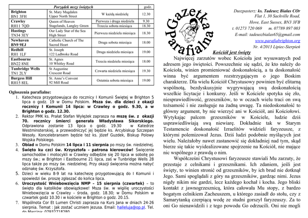 Porządek mszy świętych Brighton BN1 3FH Crawley RH11 7QD Hastings TN34 3EY Newhaven BN9 9EJ Redhill RH1 1LF Eastbourne BN22 8NE Tunbridge Wells TN1 2LY Burgess Hill RH15 8EL godz. nc St. Mary Magdalen Upper North Street Queen of Heaven Stagelands, Langley Green Our Lady Star of the Sea High Street Catholic Church of The Sacred Heart St. Joseph 122 Ladbroke Road St. Agnes 10 Whitley Road St Augustine Crescent Road St. Anne’s Convent 92 Mill Road W każdą niedzielę 12.30 Pierwsza i druga niedziela Trzecia sobota miesiąca 9.30 18.30 Pierwsza niedziela miesiąca 18.30 Druga sobota miesiąca 18.00 Druga niedziela miesiąca 19.00 Trzecia niedziela miesiąca 18.00 Czwarta niedziela miesiąca 19.30 Ostatnia sobota miesiąca 19.00 Ogłoszenia parafialne: 1. Katecheza przygotowująca do rocznicy I Komunii Świętej w Brighton 5 lipca o godz. 19 w Domu Polskim. Msza św. dla dzieci z okazji rocznicy I Komunii 14 lipca: w Crawley o godz. 9.30, a w Brighton o godz. 12.30. 2. Rektor PMK ks. Prałat Stefan Wylężek zaprasza na mszę św. z okazji 70. rocznicy śmierci generała Władysława Sikorskiego. Odprawiona zostanie 13 lipca o godz. 19.30 w Katedrze Westminsterskiej, a przewodniczyć jej będzie ks. Arcybiskup Szczepan Wesoły. Koncelebransem będzie też ks. Józef Guzdek, Biskup Polowy Wojska Polskiego. 3. Obiad w Domu Polskim 14 lipca i 11 sierpnia po mszy św. niedzielnej. 4. Święto ku czci św. Krzysztofa – patrona kierowców! Święcenie doczesne i wieczne samochodówWartości i motocykli w Crawley odbędzie się 20 lipca w sobotę po „Troszczcie się nie o ten pokarm, 6, 27). Wells 28 mszy św.; w Brighton i Eastbourne 21 który lipca, ginie” zaś w (JTunbridge Pan lipca Jezustakże dowartościował doczesność, równocześnie oczy po mszy św. niedzielnej. Przy okazji otwierając święcenia nam można nabyć odznakę św. Krzysztofa. na wartości wieczne. 5. Dziecicudu w wieku 8-9 latchleba, na katechezę przygotowującą do I Komunii i Dokonał rozmnożenia aby dowartościować doczesność. spowiedzi św. proszę zgłaszać do końca lipca. Podzielił również ryby. Był to cud wyjątkowo oczywisty, ponieważ z pięciu 6. Uroczystość Wniebowzięcia NMP zebrali – 15 sierpnia – to bochenków podzielonego chleba Apostołowie dwanaście(czwartek) koszów święto dla katolików obowiązkowe! Msza św. w wigilię uroczystości ułomków. Wniebowzięcia Crawley – chleb, środa,przekazany godz. 18.30; w Domu Polskim w Był to błogosławionywchleb, święty ludziom jako pokarm czwartek godz 10.30 i w kościele w Brighton o godz. 20.15. dla ich ciała w trosce o to, aby nie ustali, gdy będą wracać do domu. Tego 7. Wspólnota CoruEt Lumen Christi zaprasza na Kurs Jana w dniach 24-26 chleba głodni szukali Chrystusa także na drugi dzień. sierpnia. Temat : Jak zostać uczniem Jezusa. Email: [email protected]. Tel. do Marcina: 07932718280 Duszpasterz: ks. Tadeusz Białas COr Flat 1, 30 Sackville Road, Hove, East Sussex, BN3 3FB t. 01273 720 069 m. 07789 897 003 E-mail: [email protected] www.parafiabrighton.org Nr. 4/2013 Lipiec-Sierpień Kościół jest święty Najwięcej zarzutów wobec Kościoła jest wysuwanych pod adresem jego świętości. Powszechnie się sądzi, że kto należy do Kościoła, winien promieniować doskonałością, a ta doskonałość winna być argumentem rozstrzygającym o jego Boskim charakterze. Dla wielu Kościół Chrystusowy powinien być elitarną wspólnotą, bezdyskusyjnie wygrywającą swą doskonałością wszelkie licytacje i konkursy. Jeśli w Kościele spotyka się zło, niesprawiedliwość, grzeszników, to w oczach wielu traci on swą tożsamość i nie zasługuje na żadną uwagę. Ta niedoskonałość to główny argument, by nie wierzyć ani w Kościół, ani Kościołowi. Wytykając palcem grzeszników w Kościele, ludzie dziś usprawiedliwiają swą niewiarę. Dokładnie tak w Starym Testamencie doskonałość Izraelitów widzieli faryzeusze, z którymi polemizował Jezus. Dziś ludzi podobnie myślących jest wielu. Należałoby nawet zastanowić się dokładniej nad tym, skąd bierze się takie wyidealizowane spojrzenie na Kościół, nie mające nic wspólnego z prawdą o nim. Współcześni Chrystusowi faryzeusze stawiali Mu zarzuty, że przestaje z celnikami i grzesznikami. Ich zdaniem, jeśli jest święty, to winien stronić od grzeszników, by ich brud nie dotknął Jego. Sami spoglądali z góry na grzeszników, gardząc nimi. Jezus nigdy nikim nie gardzi, lecz każdego kochał i kocha. Jego bliski kontakt z jawnogrzesznicą, która całowała Mu stopy, z bardzo bogatym celnikiem Zacheuszem, u którego zasiadł do stołu, czy z Samarytanką czerpiącą wodę ze studni gorszył faryzeuszy. Za to oni Go nienawidzili i z tego powodu Go odrzucili. Oni nie mogli tego pojąć, że w Jego kontakcie z grzesznikami nie grzech przelewał się na Niego, lecz Jego świętość przelewała się na grzeszników. Faryzeusze budowali swoje stronnictwo z ludzi doskonałych, czyli w ich oczach świętych. Tymczasem Jezus budował i buduje wspólnotę swego Kościoła z grzeszników. Jego zdaniem zdrowi nie potrzebują lekarza, lecz źle się mający... On jest lekarzem, a Jego Kościół jest szpitalem pełnym pacjentów o różnym stopniu zdrowia, czyli doskonałości. To ewangeliczne spojrzenie na świętość Kościoła należy oczyścić z naleciałości faryzeizmu, który szkodzi zarówno wierzącym, jak i tym, którzy spoglądają na Kościół z zewnątrz. Kościół jest święty nie dlatego, że wszyscy jego członkowie są doskonali, ale dlatego, że on nie boi się grzechu. Nie boi się dlatego, ponieważ posiada Lekarza, który potrafi uleczyć z każdej choroby i jest w stanie budować wspólnotę z pacjentów, którzy wracając do zdrowia, umieją sobie wzajemnie pomagać. Kościół nie boi się grzechu tych, którzy do niego przychodzą. Wystarczy bowiem, że z wiarą przejdą przez chrzcielną wodę, a zostaną 