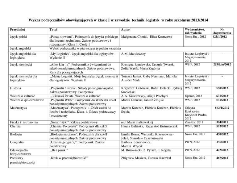 Wykaz podręczników obowiązujących w klasie I w zawodzie technik logistyk w roku szkolnym 2013/2014 Przedmiot Tytuł Język polski Język angielski „Ponad słowami”. Podręcznik do języka polskiego Małgorzata Chmiel, Eliza Kostrzewa dla liceum i technikum. Zakres podstawowy i rozszerzony. Klasa 1. Część 1 Wybór podręcznika w pierwszym tygodniu września Język angielski dla logistyków „My Logistics”. Język angielski dla logistyków. Wydanie II A.M. Matulewscy Język niemiecki „Alles klar 1a”. Podręcznik z ćwiczeniami do szkół ponadgimnazjalnych. Zakres podstawowy. Kurs dla początkujących „Meine Logistik. Moja logistyka. Język niemiecki dla logistyków. Wydanie II Krystyna Łuniewska, Urszula Tworek, Zofia Wąsik. Maria Zagórna Język niemiecki dla logistyków Historia Wiedza o kulturze Wiedza o społeczeństwie Matematyka Fizyka i astronomia Chemia Biologia Geografia Edukacja dla bezpieczeństwa Podstawy przedsiębiorczości „Po prostu historia”. Szkoły ponadgimnazjalne. Zakres podstawowy. Podręcznik „ Ciekawi świata. Wiedza o kulturze” „Po prostu WOS”. Podręcznik do WOS dla szkól ponadgimnazjalnych. Zakres podstawowy „Matematyka”. Podręcznik + Zbiór zadań do liceów i techników. Klasa 1. Zakres podstawowy i rozszerzony Autor Wydawnictwo, rok wydania Nowa Era , 2012 Instytut Logistyki i Magazynowania, 2012 WSiP, 2012 Nr dopuszczenia 425/1/2012 - 255/1/m/2012 - Instytut Logistyki i Magazynowania, 2012 Krzysztof Gutowski, Rafał Dolecki, Jędrzej WSiP, 2012 558/2012 Smoleński A.A. Kisielewscy, Alicja Prochyra Marek Grondas, Janusz Żmijski 631/2012 531/2012 Tomasz Janiak, Gaby Neumann, Mariola Aus der Mark Marcin Kurczab, Elżbieta Kurczab, Elżbieta Świda red. Marii Fiałkowskiej Hanna Gulińska, Krzysztof Kuśmierczyk Operon, 2012 WSiP, 2012 Oficyna Edukacyjna Krzysztof Pazdro, 2012 ZamKor, 2011 WSiP, 2012 563/1/2012 394/2011 523/2012 „Świat fizyki”. Zakres podstawowy „Chemia. Po prostu”. Podręcznik dla szkół ponadgimnazjalnych. Zakres podstawowy „Biologia na czasie”. Podręcznik dla szkół ponadgimnazjalnych. Zakres podstawowy „Czas na geografię”. Podręcznik. Zakres podstawowy „Bez paniki” Emilia Bonar, Weronika KrzeszowiecJeleń, Stanisław Czachorowski Barbara Lenartowicz, Marcin Wójcik M. Borowiecki, Z. Pytasz, E. Regała Nowa Era, 2012 450/2012 PWN, 2012 355/2011 PWN, 2012 422/2012 „Krok w przedsiębiorczość” Zbigniew Makieła, Tomasz Rachwał Nowa Era, 2012 467/2012 Bezpieczeństwo i higiena pracy Logistyka w procesach produkcji Zapasy i magazynowanie Ekonomika w logistyce Religia „Bezpieczeństwo i higiena pracy” Andrzej Komosa Ekonomik, 2012 - „Podstawy elektrotechniki i elektroniki dla elektryków” „ Zapasy i magazynowanie”. Andrzej Chochowski WSiP, 2008 - Stanisław Krzyżaniak Instytut Logistyki i Magazynowania, 2008 - red. Ks. P. Pierzchała, Wydawnictwo Katechetyczne, 2012 „Być świadkiem zmartwychwstałego w kościele”. Podręcznik do nauczania religii w klasach 1 liceum i technikum -