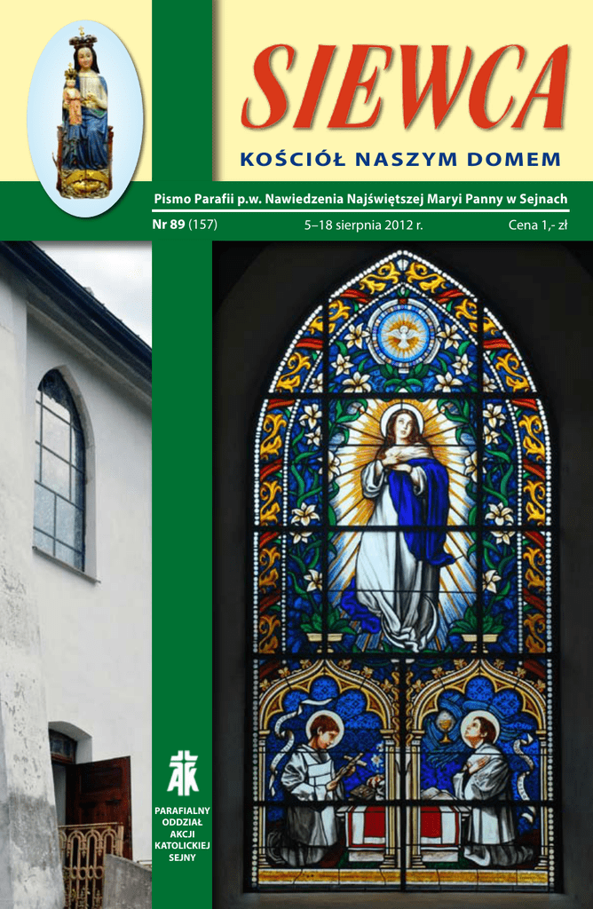 KO Ś C I Ó Ł N A S Z YM D O M E M Pismo Parafii p.w. Nawiedzenia Najświętszej Maryi Panny w Sejnach Nr 89 (157) PARAFIALNY ODDZIAŁ AKCJI KATOLICKIEJ SEJNY 5–18 sierpnia 2012 r. Cena 1,- zł MOC SŁOWA Niedziela XVIII Zwykła – 5 sierpnia 2012 J 6,24-35 K iedy ludzie z tłumu zauważyli, że na brzegu jeziora nie ma Jezusa, a także Jego uczniów, wsiedli do łodzi, przybyli do Kafarnaum i tam Go szukali. Gdy zaś Go odnaleźli na przeciwległym brzegu, rzekli do Niego: „Rabbi, kiedy tu przybyłeś?” Odpowiedział im Jezus:„Zaprawdę, zaprawdę powiadam wam: Szukacie Mnie nie dlatego, że widzieliście znaki, ale dlatego, że jedliście chleb do sytości. Troszczcie się nie o ten pokarm, który ginie, ale o ten, który trwa na wieki, a który da wam Syn Człowieczy; Jego to bowiem pieczęcią swą naznaczył Bóg Ojciec”. Oni zaś rzekli do Niego:„Cóż mamy czynić, abyśmy wykonywali dzieła Boże?” Jezus odpowiadając rzekł do nich: „Na tym polega dzieło zamierzone przez Boga, abyście uwierzyli w Tego, którego On posłał”. Rzekli do Niego:„Jakiego więc dokonasz znaku, abyśmy go widzieli i Tobie uwierzyli? Cóż zdziałasz? Ojcowie nasi jedli mannę na pustyni, jak napisano: «Dał im do jedzenia chleb z nieba»”. Rzekł do nich Jezus: „Zaprawdę, zaprawdę powiadam wam: Nie Mojżesz dał wam chleb z nieba, ale dopiero Ojciec mój da wam prawdziwy chleb z nieba. Albowiem chlebem Bożym jest Ten, który z nieba zstępuje i życie daje światu”. Rzekli więc do Niego: „Panie, dawaj nam zawsze tego chleba”. Odpowiedział im Jezus: „Jam jest chleb życia. Kto do Mnie przychodzi, nie będzie łaknął; a kto we Mnie wierzy, nigdy pragnąć nie będzie”. Refleksja niedzielna: Słuchając słów dzisiejszej Ewangelii, zauważa się, że Jezus wypowiada się dwuznacznie. Chleb to nie tylko kromka, którą można zaspokoić głód, ale też pokarm duchowy, który zaspokaja głód duszy. Jezus mówiąc: „Jam jest chleb życia”, wskazuje, że może zaspokoić głód duszy. Ale czym jest głód duszy? Zapewne chodzi o pragnienie szczęścia, uznania i szacunku. Krótko mówiąc - pragnienie bycia kochanym. Każdy potrzebuje szacunku jak wody i chleba. Każdy chce codziennie czuć, że jest ważny i kochany. Temu, komu odmawia się tego rodzaju uczuć od wczesnego dzieciństwa, doskwiera brak spokoju w życiu. A może być jeszcze gorzej, gdy dusza sama stara się zaspokoić swój głód. Wtedy może wezbrać w niej tak bezmierna tęsknota, że nic i nikt nie jest już w stanie jej zaspokoić, a lęk przed poczuciem niższości łatwo przeradza się w manię wielkości. Czy wtedy Jezus może pomóc? Zapewne tak. Oferuje bezwarunkową miłość. Przy Nim przygnębiające poczucie niższości okazuje się bezzasadne. Całkowicie bowiem poświęcił siebie dla zbawienia człowieka. Jak więc można przy Nim czuć się bez znaczenia, niewiele wartym, nie za dobrym? Niedziela XIX Zwykła – 12 sierpnia 2012 J 6,41-51 Ż ydzi szemrali przeciwko Jezusowi, dlatego że powiedział: „Jam jest chleb, który z nieba zstąpił”, i mówili:„Czyż to nie jest Jezus, syn Józefa, którego ojca i matkę znamy? Jakżeż może On teraz mówić: «Z nieba zstąpiłem»?” Jezus im odpowiedział: «Nie szemrajcie między sobą. Nikt nie może przyjść do Mnie, jeżeli go nie pociągnie Ojciec, który Mnie posłał; Ja zaś wskrzeszę go w dniu ostatecznym. Napisane jest u Proroków: «Oni wszyscy będą uczniami Boga». Każdy, kto od Ojca usłyszał i nauczył się, przyjdzie do Mnie. Nie znaczy to, aby ktokolwiek widział Ojca; jedynie Ten, który jest od Boga, widział Ojca. Zaprawdę, zaprawdę powiadam wam: Kto we Mnie wierzy, ma życie wieczne. Jam jest chleb życia. Ojcowie wasi jedli mannę na pustyni i pomarli. To jest chleb, który z nieba zstępuje: kto go spożywa, nie umrze. Ja jestem chlebem żywym, który zstąpił z nieba. Jeśli kto spożywa ten chleb, będzie żył na wieki. Chlebem, który Ja dam, jest moje ciało za życie świata”. Refleksja niedzielna: Chociaż niektóre Ewangelie słyszeliśmy już wiele razy, to jednak wciąż wydają się tajemnicze. Tak jest też z dzisiejszym tekstem. „Jam jest chleb życia” i „kto we Mnie wierzy, ma życie wieczne”... Mimo wszystkich prób wyjaśnienia tych słów, nadal pozostają bardzo zagadkowe. W takich sytuacjach dobrze jest przyjrzeć się bliżej czytaniu ze Starego Testamentu: „Wstań, jedz i pij!” – mówi anioł do zmęczonego, zrezygnowanego proroka Eliasza. „Przed tobą długa droga. Posil się, by nie okazała się za długa dla ciebie”. Słowa te są bardzo zrozumiałe. Gdy jest się głodnym i spragnionym, łatwo traci się siły, każdy krok jest męczarnią, a cel zdaje się nieosiągalny. Ani życie, ani wędrówka nie sprawiają żadnej radości. Każda droga może okazać się za długa, jeśli nie można się posilić i nabrać sił. Każdy cel może okazać się zbyt odległy, SIEWCA jeśli chcemy polegać tylko na sobie. Odnosi się to także do naszej drogi z Jezusem i do celu, do którego chce nas doprowadzić. Jeśli nas nie posila podczas Uczty eucharystycznej, wspólnego – z innymi towarzyszami podróży - przystępowania do Jego stołu, to może się zdarzyć, że nawet niewielka przeszkoda zda się murem nie do pokonania, a każde skrzyżowanie groźbą zejścia na manowce. „Wstań i jedz!” – mówi anioł do Eliasza, i to nie jeden raz. Eliaszowi udało się dotrzeć do Góry Bożej. Czy nam wystarczy sił, by dotrzeć do Miasta niebieskiego? Na pierwszej stronie Witraż w klasztorze podominikańskim w Sejnach. Witraż, który zniszczono w latach komunizmu. Powstał z inicjatywy ks. Romualda Jałbrzykowskiego w latach 1876 – 1955, wicerektora Seminarium Duchownego w Sejnach, późniejszego Arcybiskupa Wileńskiego. Rekonstrukcję wykonano w 2012 r. przez Pawła Przyrowskiego, w Pracowni Witraży S.C. w Warszawie, ufundowała Irena Kaspero