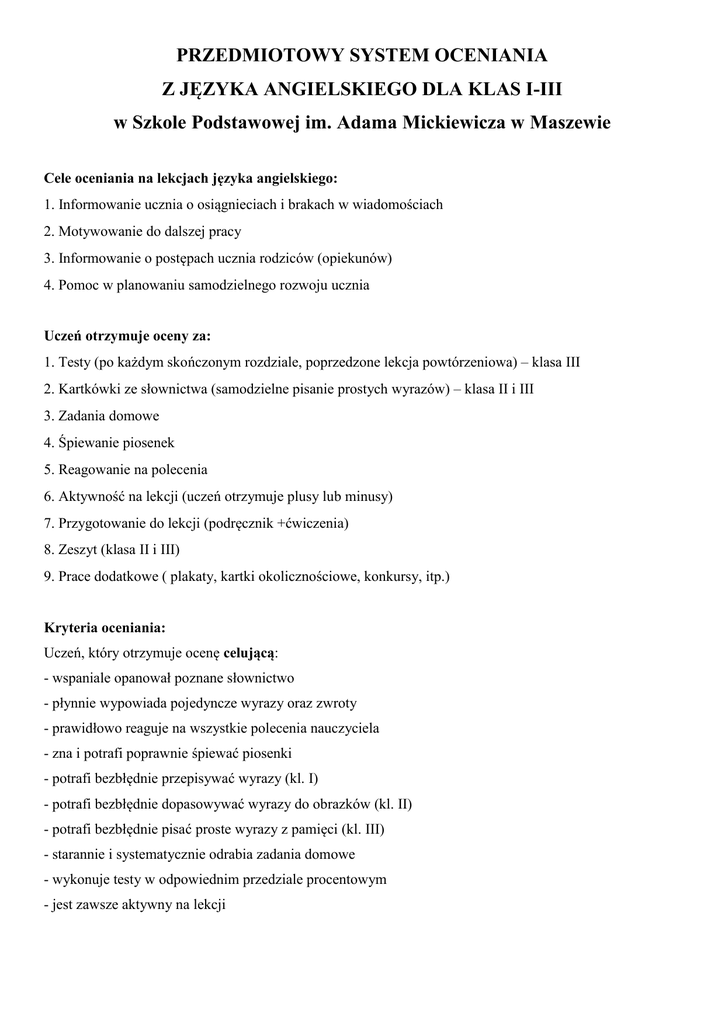 PRZEDMIOTOWY SYSTEM OCENIANIA Z JĘZYKA ANGIELSKIEGO DLA KLAS I-III w Szkole Podstawowej im. Adama Mickiewicza w Maszewie Cele oceniania na lekcjach języka angielskiego: Informowanie ucznia o osiągnieciach i brakach w wiadomościach Motywowanie do dalszej pracy Informowanie o postępach ucznia rodziców (opiekunów) Pomoc w planowaniu samodzielnego rozwoju ucznia Uczeń otrzymuje oceny za: Testy (po każdym skończonym rozdziale, poprzedzone lekcja powtórzeniowa) – klasa III Kartkówki ze słownictwa (samodzielne pisanie prostych wyrazów) – klasa II i III Zadania domowe Śpiewanie piosenek Reagowanie na polecenia Aktywność na lekcji (uczeń otrzymuje plusy lub minusy) Przygotowanie do lekcji (podręcznik +ćwiczenia) Zeszyt (klasa II i III) Prace dodatkowe ( plakaty, kartki okolicznościowe, konkursy, itp.) Kryteria oceniania: Uczeń, który otrzymuje ocenę celującą: - wspaniale opanował poznane słownictwo - płynnie wypowiada pojedyncze wyrazy oraz zwroty - prawidłowo reaguje na wszystkie polecenia nauczyciela - zna i potrafi poprawnie śpiewać piosenki - potrafi bezbłędnie przepisywać wyrazy (kl. I) - potrafi bezbłędnie dopasowywać wyrazy do obrazków (kl. II) - potrafi bezbłędnie pisać proste wyrazy z pamięci (kl. III) - starannie i systematycznie odrabia zadania domowe - wykonuje testy w odpowiednim przedziale procentowym - jest zawsze aktywny na lekcji Uczeń, który otrzymuje ocenę bardzo dobrą: - bardzo dobrze opanował poznane słownictwo - poprawnie wypowiada pojedyncze wyrazy oraz zwroty - prawidłowo reaguje na większość poleceń nauczyciela - zna i potrafi poprawnie śpiewać większość piosenek - potrafi przeważnie bezbłędnie przepisywać wyrazy (kl. I) - potrafi w większości bezbłędnie dopasowywać wyrazy do obrazków (kl. II) - poprawnie pisze większość prostych wyrazów z pamięci (kl. III) - starannie i systematycznie odrabia zadania domowe - wykonuje testy w odpowiednim przedziale procentowym - jest bardzo często aktywny na lekcji Uczeń, który otrzymuje ocenę dobrą: - dobrze opanował poznane słownictwo - przeważnie poprawnie wypowiada pojedyncze wyrazy oraz zwroty - często prawidłowo reaguje na polecenia nauczyciela - zna i potrafi poprawnie śpiewać wiele piosenek - czasami błędnie przepisuje wyrazy (kl. I) - czasami popełnia błędy dopasowując wyrazy do obrazków (kl. II) - czasami popełnia błędy pisząc proste wyrazy z pamięci (kl. III) - nie zawsze starannie i systematycznie odrabia zadania domowe - wykonuje testy w odpowiednim przedziale procentowym - jest często aktywny na lekcji Uczeń, który otrzymuje ocenę dostateczną: - słabo opanował poznane słownictwo - rzadko poprawnie wypowiada pojedyncze wyrazy oraz zwroty - często nieprawidłowo reaguje na polecenia nauczyciela - zna i potrafi poprawnie śpiewać niektóre piosenek - często błędnie przepisuje wyrazy (kl. I) - często popełnia błędy dopasowując wyrazy do obrazków (kl. II) - często popełnia błędy pisząc proste wyrazy z pamięci (kl. III) - mało starannie i niesystematycznie odrabia zadania domowe - wykonuje testy w odpowiednim przedziale procentowym - jest rzadko aktywny na lekcji Uczeń, który otrzymuje ocenę dopuszczającą: - bardzo słabo opanował poznane słownictwo - bardzo rzadko poprawnie wypowiada pojedyncze wyrazy oraz zwroty - przeważnie nieprawidłowo reaguje na polecenia nauczyciela - zna i potrafi poprawnie śpiewać niewiele piosenek - bardzo często błędnie przepisuje wyrazy (kl. I) - bardzo często popełnia błędy dopasowując wyrazy do obrazków (kl. II) - bardzo często popełnia błędy pisząc proste wyrazy z pamięci (kl. III) - przeważnie nie odrabia zadań domowych - wykonuje testy w odpowiednim przedziale procentowym - jest bardzo rzadko aktywny na lekcji Uczeń, który otrzymuje ocenę niedostateczną: - nie opanował poznanego słownictwa - nie potrafi wypowiedzieć pojedynczych wyrazów nawet z pomocą nauczyciela - nie potrafi reagować na polecenia nauczyciela - nie zna i nie potrafi śpiewać piosenek - bardzo często błędnie przepisuje wyrazy (kl. I) - nie potrafi dopasować wyrazów do obrazków (kl. II) - nie potrafi napisać prostych wyrazów z pamięci (kl. III) - nie odrabia zadań domowych - wykonuje testy poniżej 40% - nie jest zainteresowany lekcją Uczniowie otrzymują oceny według następującej skali procentowej: Celujący 100% – 96% Bardzo dobry 95% – 90% Dobry 89% – 70% Dostateczny 69% – 50% Dopuszczający 49% – 40% Niedostateczny 39% – 0%