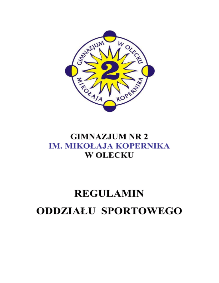 GIMNAZJUM NR 2 IM. MIKOŁAJA KOPERNIKA W OLECKU REGULAMIN ODDZIAŁU SPORTOWEGO POSTANOWIENIA OGÓLNE 1. Gimnazjum nr2 im. Mikołaja Kopernika w Olecku prowadzi oddziały sportowe wg zasad określonych w Statucie. 2. Oddział z rozszerzonym programem piłki siatkowej dziewcząt i koszykówki oraz piłki nożnej i piłki ręcznej chłopców tworzony jest na poziomie oddziału pierwszego i realizuje program szkolenia sportowego przez trzy kolejne lata nauki w gimnazjum. 3. Szkolenie sportowe prowadzone jest w oparciu o bieżące, szczegółowe przepisy dotyczące szkolnictwa sportowego. 4. Uczniem oddziału sportowego może zostać zarówno uczeń mieszkający w obwodzie szkoły, jak i uczeń mieszkający poza jej obwodem. 5. Uczniowie oddziału sportowego wyłaniani są w drodze postępowania kwalifikacyjnego określonego w zasadach naboru do oddziału sportowego. 6. Na wniosek nauczyciela oddziału sportowego dyrektor szkoły może podjąć decyzję o skreśleniu ucznia z listy uczniów oddziału sportowego z końcem semestru lub roku szkolnego. Nauczyciel dokonuje oceny przydatności ucznia do dalszego szkolenia w terminie do końca maja każdego roku lub w uzasadnionych przypadkach po obozie sportowym. PRAWA UCZNIA ODDZIAŁU SPORTOWEGO Uczeń oddziału sportowego ma wszystkie prawa ucznia Gimnazjum nr2 im. Mikołaja Kopernika w Olecku, a ponadto: 1) ma prawo korzystać z pomocy dyrekcji i nauczycieli oddziału sportowego w rozwiązywaniu problemów wynikających z konieczności pogodzenia nauki i sportu, a w szczególności do pomocy dydaktycznej w przezwyciężaniu trudności w nauce (zajęcia wyrównawcze), 2) ma prawo do korzystania pod opieką nauczyciela-opiekuna grupy sportowej ze sprzętu sportowego oraz infrastruktury sportowo-rekreacyjnej szkoły, 3) po jednodniowych lub kilkudniowych zawodach sportowych ma prawo być nieprzygotowany do lekcji w dniu następnym z zakresu materiału przerabianego w czasie swojej nieobecności, 4) absencja ucznia wynikająca z udziału w zawodach sportowych nie jest ujmowana w dokumentacji szkolnej jako nieobecność, a odnotowywana jest jako „zawody”, OBOWIĄZKI UCZNIA ODDZIAŁU SPORTOWEGO Uczeń oddziału sportowego wypełnia wszystkie obowiązki wynikające ze Statutu Gimnazjum nr 2 im. Mikołaja Kopernika w Olecku, a ponadto ma obowiązek: 1) systematycznie, aktywnie i z zaangażowaniem uczestniczyć w zajęciach sportowych, lekcjach wychowania fizycznego w wymiarze 10 godzin tygodniowo i posiadać wymagany strój sportowy odpowiedni do miejsca zajęć; 2) sumiennie i starannie wypełniać stawiane mu zadania i obowiązki; 3) podnosić swoją sprawność fizyczną i umiejętności ruchowe; 4) wyróżniać się przykładnym zachowaniem oraz kulturą osobistą; 5) wzorowo zachowywać się wobec nauczycieli i pracowników szkoły; 6) reprezentować godnie szkołę we wszystkich imprezach i zawodach sportowych ujętych w programie sportowym szkoły oraz wynikających z programu szkoleniowego i kalendarza imprez sportowych; 7) uczestniczyć w obozach sportowych; 8) poddawać się wyznaczonym badaniom lekarskim w przychodni sportowo-lekarskiej dwa razy w roku, 9) dbać o reprezentacyjny sprzęt osobisty (dresy, koszulki, spodenki) sprzęt sportowy; przybory, przyrządy i urządzenia wykorzystywane w procesie szkolenia sportowego 10) bezwzględnie przestrzegać poleceń nauczyciela w czasie prowadzonych zajęć; 11) nie stwarzać sytuacji zagrażających swojemu bezpieczeństwu oraz osób wspólnie ćwiczących; 12) przebywać w obiektach sportowych wyłącznie pod opieką nauczyciela i podporządkować się regulaminowi tych obiektów; 13) przestrzegać zasad kulturalnego współżycia w czasie zajęć wychowania fizycznego i wyjazdów sportowych oraz stosować się do regulaminów obozów i wycieczek; 14) osiągać zadowalające wyniki w nauce i sporcie; ZASADY WSPÓŁPRACY RODZICÓW/ PRAWNYCH OPIEKUNÓW UCZNIÓW ODDZIAŁU SPORTOWEGO ZE SZKOŁĄ Rodzice/ prawni opiekunowie powinni: 1) dostarczyć do szkoły orzeczenie lekarskie wydane przez lekarza medycyny sportowej o aktualnym stanie zdrowia dziecka dwa razy w roku: do 15 września i 15 marca. 2) kontrolować postępy dziecka w nauce i sporcie; 3) długotrwałą (powyżej 7 dni) niezdolność do ćwiczeń udokumentować zwolnieniem lekarskim, a w przypadku zwolnienia długookresowego (powyżej 14 dni) przedłożyć zwolnienie wydane przez lekarza przychodni sportowo-lekarskiej; 4) o przewidywanych dłuższych nieobecnościach dziecka na zajęciach i imprezach sportowych poinformować nauczyciela i wychowawcę z kilkudniowym wyprzedzeniem; 5) partycypować w kosztach zakupu strojów sportowych; 6) opłacić wyżywienie i zakwaterowanie na obozach sportowych; POSTANOWIENIA KOŃCOWE 1. a) b) c) d) e) f) 2. a) b) c) Nie spełnia wymogów regulaminu uczeń oddziału sportowego który: nie wypełnia obowiązków wynikających ze Statutu szkoły; nie przestrzega obowiązujących regulaminów; nie posiada ważnych okresowych badań lekarskich; ma stwierdzoną przez lekarza specjalistę niezdolność do uprawiania sportu; nie reprezentuje szkoły w zawodach sportowych i nie uczestniczy w obozach szkoleniowych; ma nieodpowiednie zachowanie, a jego postawa wpływa negatywnie na pozostałych uczniów; Wobec uczenia, który nie stosuje się do regulaminu podczas zajęć wychowania fizycznego, wyjazdu na zawody, czy obozu sportowego przewidziane są kary zgodnie z WSO Gimnazjum nr 2 im. Mikołaja Kopernika w Olecku, a ponadto może ponieść karę w postaci: pozbawienia prawa aktywnego uczestnictwa w zajęciach lekcyjnych i treningowych na czas określony; pozbawienia prawa reprezentowania szkoły w zawodach sportowych; pozbawienia prawa uczestnictwa w obozie sportowym; d) usunięcia z obozu sportowego lub imprezy sportowej przy jednoczesnym nałożeniu na prawnych opiekunów ucznia obowiązku odebrania dziecka z miejsca jego pobytu na ich koszt w najkrótszym możliwym terminie. e) przeniesienia ucznia d