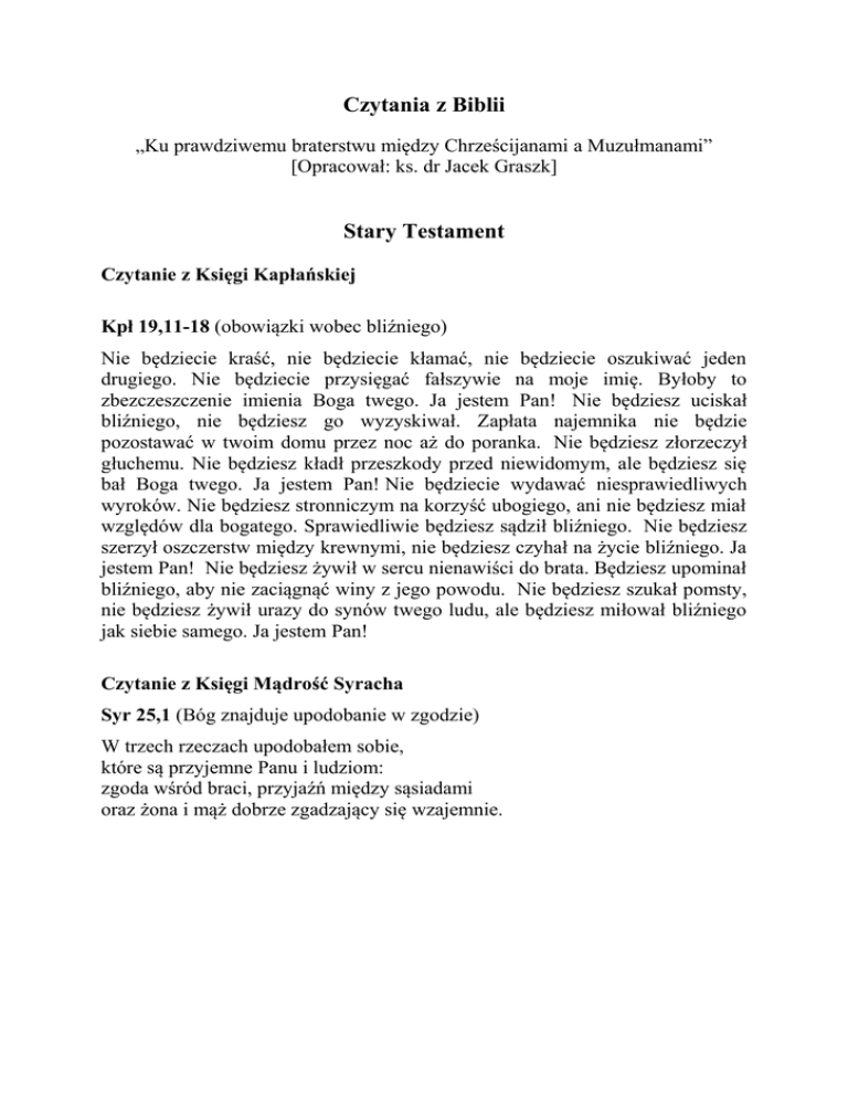 Czytania z Biblii „Ku prawdziwemu braterstwu między Chrześcijanami a Muzułmanami” [Opracował: ks. dr Jacek Graszk] Stary Testament Czytanie z Księgi Kapłańskiej Kpł 19,11-18 (obowiązki wobec bliźniego) Nie będziecie kraść, nie będziecie kłamać, nie będziecie oszukiwać jeden drugiego. Nie będziecie przysięgać fałszywie na moje imię. Byłoby to zbezczeszczenie imienia Boga twego. Ja jestem Pan! Nie będziesz uciskał bliźniego, nie będziesz go wyzyskiwał. Zapłata najemnika nie będzie pozostawać w twoim domu przez noc aż do poranka. Nie będziesz złorzeczył głuchemu. Nie będziesz kładł przeszkody przed niewidomym, ale będziesz się bał Boga twego. Ja jestem Pan! Nie będziecie wydawać niesprawiedliwych wyroków. Nie będziesz stronniczym na korzyść ubogiego, ani nie będziesz miał względów dla bogatego. Sprawiedliwie będziesz sądził bliźniego. Nie będziesz szerzył oszczerstw między krewnymi, nie będziesz czyhał na życie bliźniego. Ja jestem Pan! Nie będziesz żywił w sercu nienawiści do brata. Będziesz upominał bliźniego, aby nie zaciągnąć winy z jego powodu. Nie będziesz szukał pomsty, nie będziesz żywił urazy do synów twego ludu, ale będziesz miłował bliźniego jak siebie samego. Ja jestem Pan! Czytanie z Księgi Mądrość Syracha Syr 25,1 (Bóg znajduje upodobanie w zgodzie) W trzech rzeczach upodobałem sobie, które są przyjemne Panu i ludziom: zgoda wśród braci, przyjaźń między sąsiadami oraz żona i mąż dobrze zgadzający się wzajemnie. Nowy Testament Czytanie z Ewangelii według Św. Mateusza Mt 18,19 – 20 (moc braterskiej, wspólnej modlitwy) Dalej, zaprawdę, powiadam wam: Jeśli dwaj z was na ziemi zgodnie o coś prosić będą, to wszystkiego użyczy im mój Ojciec, który jest w niebie. Bo gdzie są dwaj albo trzej zebrani w imię moje, tam jestem pośród nich». Czytanie z Pierwszego Listu Św. Jana Apostoła 1J 4,20-21 (kto nie miłuje brata swego, którego widzi, nie może miłować Boga, którego nie widzi) Jeśliby ktoś mówił: «Miłuję Boga», a brata swego nienawidził, jest kłamcą, albowiem kto nie miłuje brata swego, którego widzi, nie może miłować Boga, którego nie widzi. Takie zaś mamy od Niego przykazanie, aby ten, kto miłuje Boga, miłował też i brata swego. Czytania z Koranu [Opracowała Rada Wspólna Katolików i Muzułmanów] -5:82 (...) I z pewnością się przekonasz, że najbliżsi, przez swoją przyjaźń, tym, którzy uwierzyli, są ci, którzy mówią: „My jesteśmy chrześcijanami!”(...) -29:46 I nie sprzeczajcie się z ludem Księgi inaczej, jak w sposób uprzejmy - z wyjątkiem tych spośród nich, którzy są niesprawiedliwi i mówcie: „Uwierzyliśmy w to, co nam zostało zesłane, i w to, co wam zostało zesłane. Nasz Bóg i wasz Bóg jest jeden i my jesteśmy Mu całkowicie poddani.” - 57:27 Następnie posłaliśmy w ich ślady Naszych posłańców; i posłaliśmy w ślad za nimi Jezusa, syna Marii, i daliśmy Mu Ewangelię; i złożyliśmy w serca tych, którzy poszli za Nim, łagodność i miłosierdzie; (...) - 3:115 Cokolwiek uczynią dobrego, to im nie zostanie zaprzeczone. Bóg zna dobrze ludzi bogobojnych. tłum. na jęz. polski: Józef Bielawski Modlitwa wiernych (przygotowana na 26 stycznia 2015 roku – dzień, kiedy obchodzimy XV Dzień Islamu w Kościele katolickim w Polsce) Miłosiernemu Bogu, który jest zawsze wierny swoim obietnicom i przymierzu, z wiarą i ufnością przedstawiajmy nasze modlitwy. 1. Módlmy się o Boży dar miłości, sprawiedliwości i życia w pokoju dla wszystkich ludzi oraz łaskę do powstawania z grzechów, aby zwyciężało w nas prawdziwe braterstwo. Ciebie prosimy… 2. Módlmy się o dar mądrości Bożej dla rządzących państwami i przywódców religijnych, aby ich posługa polityczna i duchowa oparta na prawdzie, sprawiedliwości i miłości, wydała dobre owoce w budowaniu wzajemnego szacunku między ludźmi wszystkich ras, narodowości i wyznań. Ciebie prosimy … 3. Módlmy się za wszystkich chrześcijan i muzułmanów, aby przeciwstawiali się przemocy wyznaniowej, a uczyli życia w sprawiedliwości i pokoju. Ciebie prosimy … 4. Polecajmy w modlitwie naszą Ojczyznę, która od wieków jest ojczyzną wielu pokoleń wyznawców chrześcijaństwa, islamu, judaizmu i innych religii, abyśmy potrafili układać swoje życie we wzajemnej przyjaźni, zaufaniu i ofiarnej współpracy. Ciebie prosimy… 5. Wstawiajmy się do Boga za wszystkimi pokrzywdzonymi: ofiarami wojen, zamachów, kataklizmów, chorymi, opuszczonymi, samotnymi, przebywającymi na obczyźnie, aby doświadczali szczególnej opieki Bożej i pomocnej dłoni bliźniego. Ciebie prosimy… 6. Błagajmy za wszystkimi, którzy stracili swoje życie w toczących się wojnach i różnych konfliktach, aby Bóg – Ojciec Miłosierdzia przyjął ich do siebie. Ciebie prosimy… 7. Nam, zgromadzonym na tej modlitwie i naszym bliskim, daj Boże łaskę, abyśmy dobrze wypełnili nałożone na nas obowiązki i budowali cywilizację miłości. Ciebie prosimy… Wszechmogący, wieczny Boże zmiłuj się nad nami, którzy nieustannie wołamy do Ciebie, wysłuchaj naszych modlitw i spraw, abyśmy stali się Twoimi „narzędziami pokoju i sprawiedliwości”. Przez Chrystusa, Pana naszego. Amen. PAPIESKA RADA DS. DIALOGU MIĘDZYRELIGIJNEGO Ku prawdziwemu braterstwu między chrześcijanami a muzułmanami PRZESŁANIE NA ZAKOŃCZENIE RAMADANU ‘Id al-Fitr 1435 H. / A.D. 2014 Drodzy Muzułmańscy Bracia i Siostry, odczuwamy wielką radość, gdy przesyłamy Wam serdeczne gratulacje oraz najlepsze życzenia z okazji święta ‛Id al-Fitr na zakończenie Ramadanu, miesiąca postu, modlitwy i pomocy ubogim. W zeszłym roku, inaugurując posługiwanie na Stolicy Piotrowej, Papież Franciszek osobiście podpisał Przesłanie skierowane do Was z okazji ‛Id alFitr. Zwracając się przy innej okazji, użył zwrotu „nasi bracia i siostry” (An