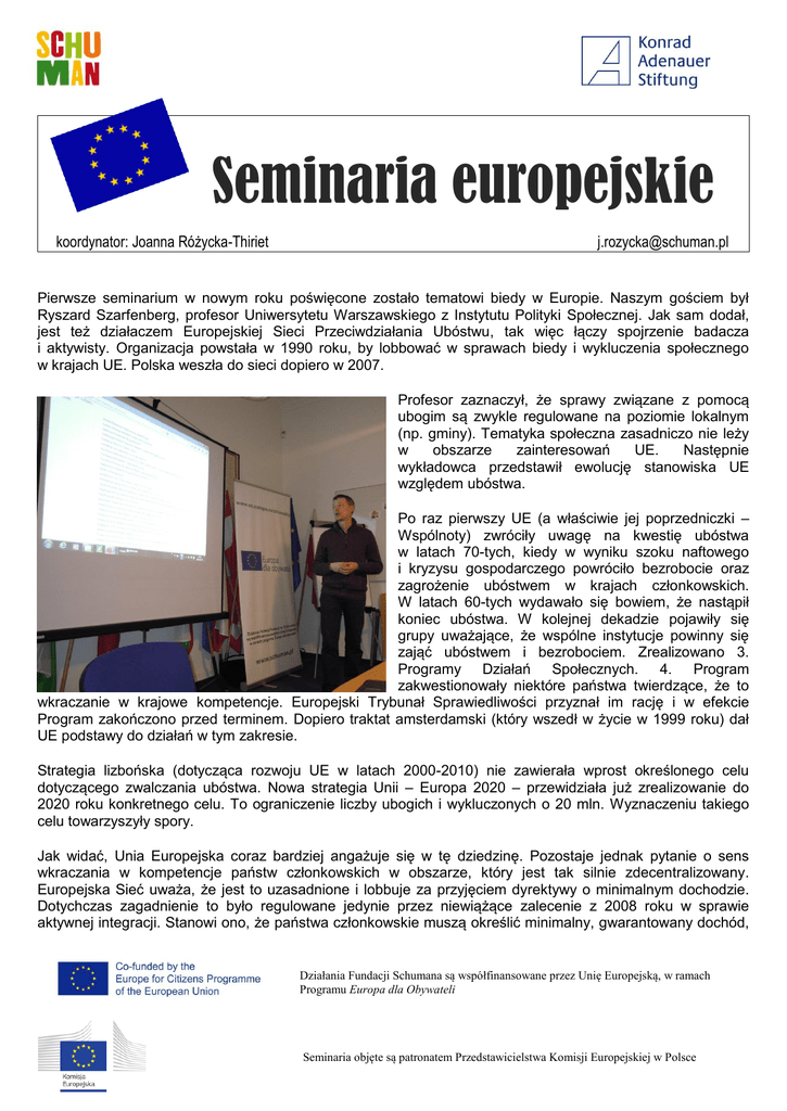 Seminaria europejskie koordynator: Joanna Różycka-Thiriet [email protected] Pierwsze seminarium w nowym roku poświęcone zostało tematowi biedy w Europie. Naszym gościem był Ryszard Szarfenberg, profesor Uniwersytetu Warszawskiego z Instytutu Polityki Społecznej. Jak sam dodał, jest też działaczem Europejskiej Sieci Przeciwdziałania Ubóstwu, tak więc łączy spojrzenie badacza i aktywisty. Organizacja powstała w 1990 roku, by lobbować w sprawach biedy i wykluczenia społecznego w krajach UE. Polska weszła do sieci dopiero w 2007. Profesor zaznaczył, że sprawy związane z pomocą ubogim są zwykle regulowane na poziomie lokalnym (np. gminy). Tematyka społeczna zasadniczo nie leży w obszarze zainteresowań UE. Następnie wykładowca przedstawił ewolucję stanowiska UE względem ubóstwa. Po raz pierwszy UE (a właściwie jej poprzedniczki – Wspólnoty) zwróciły uwagę na kwestię ubóstwa w latach 70-tych, kiedy w wyniku szoku naftowego i kryzysu gospodarczego powróciło bezrobocie oraz zagrożenie ubóstwem w krajach członkowskich. W latach 60-tych wydawało się bowiem, że nastąpił koniec ubóstwa. W kolejnej dekadzie pojawiły się grupy uważające, że wspólne instytucje powinny się zająć ubóstwem i bezrobociem. Zrealizowano 3. Programy Działań Społecznych. 4. Program zakwestionowały niektóre państwa twierdzące, że to wkraczanie w krajowe kompetencje. Europejski Trybunał Sprawiedliwości przyznał im rację i w efekcie Program zakończono przed terminem. Dopiero traktat amsterdamski (który wszedł w życie w 1999 roku) dał UE podstawy do działań w tym zakresie. Strategia lizbońska (dotycząca rozwoju UE w latach 2000-2010) nie zawierała wprost określonego celu dotyczącego zwalczania ubóstwa. Nowa strategia Unii – Europa 2020 – przewidziała już zrealizowanie do 2020 roku konkretnego celu. To ograniczenie liczby ubogich i wykluczonych o 20 mln. Wyznaczeniu takiego celu towarzyszyły spory. Jak widać, Unia Europejska coraz bardziej angażuje się w tę dziedzinę. Pozostaje jednak pytanie o sens wkraczania w kompetencje państw członkowskich w obszarze, który jest tak silnie zdecentralizowany. Europejska Sieć uważa, że jest to uzasadnione i lobbuje za przyjęciem dyrektywy o minimalnym dochodzie. Dotychczas zagadnienie to było regulowane jedynie przez niewiążące zalecenie z 2008 roku w sprawie aktywnej integracji. Stanowi ono, że państwa członkowskie muszą określić minimalny, gwarantowany dochód, Działania Fundacji Schumana są współfinansowane przez Unię Europejską, w ramach Programu Europa dla Obywateli Seminaria objęte są patronatem Przedstawicielstwa Komisji Europejskiej w Polsce stworzyć włączający rynek pracy aktywizujący ubogich i świadczyć prointegracyjne usługi (np. instytucjonalną opiekę nad dziećmi, rehabilitację dla niepełnoprawnych, które umożliwią ludziom wejście na rynek pracy). Elementy te powinny się łączyć w spójną strategię. Nie jest to łatwe, gdyż istnieje napięcie między wysokimi świadczeniami pieniężnymi, a aktywizacją zawodową (po co mam pracować, skoro mam wysoki zasiłek?). A przecież praca najlepiej chroni przez ubóstwem. W 2013 roku UE przyjęła Pakiet Inwestycji Społecznych. Nastąpiła zmiana języka. Teraz mówi się np. że środki przeznaczane na rozwój dzieci to inwestycje, a nie koszty czy polityka społeczna. Położono nacisk na usługi społeczne (np. przedszkola, żłobki). Ale nawet w kontekście świadczeń pieniężnych mówi się o tym, że i tak zostaną one w części zainwestowane w dzieci, w ich zdrowie itd. UE posiada także instrumenty finansowe do zwalczania ubóstwa. Europejski Fundusz Społeczny (EFS) istnieje od początku procesu integracji europejskiej. Ale początkowo finansował kwestie związane z zatrudnieniem, miał sprzyjać zatrudnieniu np. przekwalifikowaniu robotników po upadku przemysłu. W 2013 roku wyznaczono EFS nowy priorytet na lata 2014-2020. To inkluzja społeczna i zwalczanie ubóstwa. Każdy kraj członkowski został zobowiązany do uchwalenia ram przeciwdziałania ubóstwu. Także w krajowych programach dotyczących wydatkowania unijnych funduszy trzeba wyodrębnić cele związane z ubóstwem. Istnieje także Europejski Fundusz Pomocy Najbardziej Potrzebującym (FEAD). Został on stworzony w związku z prowadzoną przez Unię polityką rolną. Interwencje na rynku rolnym wiązały się z nadwyżkami żywności, które rozdawano najbardziej potrzebującym. Zapasy więc stopniowo malały. W efekcie trzeba było dofinansować program z unijnego budżetu, co wywołało kontrowersje. Stoczono walkę o utrzymanie tej inicjatywy, który jest obecnie częścią EFS. Na marginesie profesor dodał, że w Polsce banki żywności są popularne, chętnie dajemy żywność. Tymczasem w Wielkiej Brytanii wydaje się dziwne, że w tych czasach można jeszcze rozdawać jedzenie. UE nie przeznacza pieniędzy na świadczenia pieniężne. Następnie wykładowca wyjaśnił, jak UE obliczy, czy cel 20 mln w 2020 roku został osiągnięty. Są trzy metody obliczeń, a za zagrożonych ubóstwem i wykluczeniem społecznym lub wręcz za ubogich i wykluczonych uznaje się ludzi spełniających co najmniej jedno kryterium. Po pierwsze, mamy osoby relatywnie ubogie, których dochody znajdują się poniżej pewnej granicy (tym przypadku poniżej 60% mediany dochodów gospodarstw domowych w danym kraju). Jak pokazuje badanie z 2013 roku dotyczące ubóstwa względnego (obrazujące dochody w wysokości co najwyżej 60% mediany dochodów według parytetu siły nabywczej), w Rumunii mówimy o ubóstwie względnym na dużo niższym poziomie dochodów niż w Luksemburgu. Wynika to z tego, że koszty utrzymania w obu krajach są zupełnie inne. Ubogi Luksemburczyk żyłby na bardzo wysokim poziomie w Rumunii. A ubogi Rumun w Luksemburgu uznałby tamtejszą biedę za bogactwo. Zresztą biednych na Zachodzie Europy dużo lepiej się 