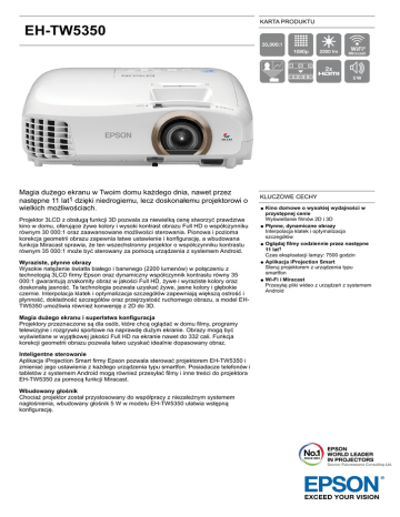 KARTA PRODUKTU EH-TW5350 Magia dużego ekranu w Twoim domu każdego dnia, nawet przez następne 11 lat1 dzięki niedrogiemu, lecz doskonałemu projektorowi o wielkich możliwościach. Projektor 3LCD z obsługą funkcji 3D pozwala za niewielką cenę stworzyć prawdziwe kino w domu, oferujące żywe kolory i wysoki kontrast obrazu Full HD o współczynniku równym 30 000:1 oraz zaawansowane możliwości sterowania. Pionowa i pozioma korekcja geometrii obrazu zapewnia łatwe ustawienie i konfigurację, a wbudowana funkcja Miracast sprawia, że ten wszechstronny projektor o współczynniku kontrastu równym 35 000:1 może być sterowany za pomocą urządzenia z systemem Android. Wyraziste, płynne obrazy Wysokie natężenie światła białego i barwnego (2200 lumenów) w połączeniu z technologią 3LCD firmy Epson oraz dynamiczny współczynnik kontrastu równy 35 000:1 gwarantują znakomity obraz w jakości Full HD, żywe i wyraziste kolory oraz doskonałą jasność. Ta technologia pozwala uzyskać żywe, jasne kolory i głębokie czernie. Interpolacja klatek i optymalizacja szczegółów zapewniają większą ostrość i płynność, dokładność szczegółów oraz przejrzystość ruchomego obrazu, a model EHTW5350 umożliwia również konwersję z 2D do 3D. Magia dużego ekranu i superłatwa konfiguracja Projektory przeznaczone są dla osób, które chcą oglądać w domu filmy, programy telewizyjne i rozgrywki sportowe na naprawdę dużym ekranie. Obrazy mogą być wyświetlane w wyjątkowej jakości Full HD na ekranie nawet do 332 cali. Funkcja korekcji geometrii obrazu pozwala łatwo uzyskać idealnie dopasowany obraz. Inteligentne sterowanie Aplikacja iProjection Smart firmy Epson pozwala sterować projektorem EH-TW5350 i zmieniać jego ustawienia z każdego urządzenia typu smartfon. Posiadacze telefonów i tabletów z systemem Android mogą również przesyłać filmy i inne treści do projektora EH-TW5350 za pomocą funkcji Miracast. Wbudowany głośnik Chociaż projektor został przystosowany do współpracy z niezależnym systemem nagłośnienia, wbudowany głośnik 5 W w modelu EH-TW5350 ułatwia wstępną konfigurację. KLUCZOWE CECHY Kino domowe o wysokiej wydajności w przystępnej cenie Wyświetlanie filmów 2D i 3D Płynne, dynamiczne obrazy Interpolacja klatek i optymalizacja szczegółów Oglądaj filmy codziennie przez następne 11 lat1 Czas eksploatacji lampy: 7500 godzin Aplikacja iProjection Smart Steruj projektorem z urządzenia typu smartfon Wi-Fi i Miracast Przesyłaj pliki wideo z urządzeń z systemem Android SPECYFIKACJE PRODUKTU TECHNIKA System projekcyjny Technologia 3LCD, Ciekłokrystaliczna migawka RGB Panel LCD 0,61 cal z MLA (D9) OBRAZ Natężenie światła barwnego 2.200 lumen- 1.500 lumen (tryb ekonomiczny) zgodne z normą ISO IDMS15.4 Natężenie światła białego 2.200 lumen - 1.500 lumen (tryb ekonomiczny) zgodne z normą ISO 21118:2012 Rozdzielczość Full HD 1080p, 1920 x 1080, 16:9 Stosunek kontrastu 35.000 : 1 Lampa 200 W, 4.000 h Żywotność, 7.500 h Żywotność (w trybie oszczędnym) Korekcja obrazu Auto pionowo: ± 30 °, Ręczna obsługa (lub "Instrukcja obsługi") poziomo ± 30 ° Odwzorowanie kolorów Do 1,07 mld kolorów High Definition Full HD 3D Współczynnik proporcji obrazu 16:9 Przetwarzanie wideo 10 Bit Częstotliwość odświeżania 192 Hz - 240 Hz pionowego 2D Częstotliwość odświeżania 400 Hz - 480 Hz pionowego 3D UKŁAD OPTYCZNY Stosunek projekcji 1,22 - 1,47:1 Zoom Manual, Factor: 1,2 Rozmiar projekcji 34 cale - 332 cale Odległość wyświetlania, tryb 1,62 m - 1,95 m ( 60 cal ekran) szerokokątny/tele Odległość ogniskowa 16,9 mm - 20,28 mm Fokus Ręcznie ZŁĄCZA Przyłącza Wejście audio typu cinch, MHL, Stereofoniczne wyjście audio mini-jack, Wejście sygnału kompozytowego, Wejście HDMI (2x), Wejście VGA, Złącze USB 2.0 typu Mini-B, Złącze USB 2.0 typu A, Wi-Fi Direct Połączenie ze smartfonem nie dot. ZAAWANSOWANE FUNKCJE 3D Aktywne Tryby kolorów 2D Dynamiczny, Naturalne, Kino, Jasny Kinowy Tryby kolorów 3D Dynamiczny 3D, Kinowy 3D Funkcje Regulacja głębi 3D, Częstotliwość odświeżania 480 Hz obrazu 3D, Wbudowany głośnik, Epson Super White, Interpolacja klatek, Pozioma i pionowa korekcja geometrii obrazu, Interfejs audio/wideo MHL, Projekcja sieciowa, Funkcja podziału ekranu, Możliwość połączenia z bezprzewodową siecią LAN INFORMACJE OGÓLNE Zużycie energii 291 W, 224 W (tryb ekonomiczny), 0,28 W (w trybie czuwania) Wymiary produktu 297 x 245 x 114 mm (Szerokość x Głębokość x Wysokość) Waga produktu 3,1 kg Poziom hałasu Tryb normalny: 37 dB (A) - Tryb ekonomiczny: 27 dB (A) Głośniki 5W Colour White INNE Gwarancja 24 miesiące/miesięcy Klient zanosi do serwisu, Lampa: 36 miesiące/miesięcy lub 3.000 h Dostępne opcjonalne przedłużenie gwarancji EH-TW5350 ZAWARTOŚĆ ZESTAWU Dokumenty gwarancyjne Instrukcja obsługi (CD) Pilot z bateriami Skrócona instrukcja uruchomienia Kabel zasilający Urządzenie podstawowe OPCJONALNE AKCESORIA EH-TW5350 3D Glasses (Active, RF) - ELPGS03 V12H548001 Air Filter - ELPAF32 V13H134A32 Ceiling Mount ELPMB23 (EB-G5000 series) V12H003B23 Pipe 450mm Silver ELPFP13 (EB-G5000 series) V12H003P13 Pipe 700mm Silver ELPFP14 (EB-G5000 series) V12H003P14 Lamp - ELPLP88 - EB-9xxH/S27/X27/W29 V13H010L88 INFORMACJA LOGISTYCZNA SKU V11H709040 Kod kreskowy 8715946601465 Wymiary opakowania pojedynczego 350 x 355 x 195 mm Waga pudełka 4,34 kg szt. 1 Liczba jednostek Kraj pochodzenia Filipiny Rozmiar palety 60 szt. (6 x 10) Epson Europe B.V. Sp. z o.o. Oddział w Polsce ul. Bokserska 66 02-690 Warszawa Tel.: +48 22 375 7500 Faks: +48 22 375 7501 Infolinia: 801 64 64 53 (Opłata za połączenie wg taryfy operatora.) www.epson.pl Znaki towarowe oraz zastrzeżone znaki towarowe są własnością firmy Seiko Epson Corporation lub odpowiednich firm. Informacje o produkcie mogą ulec zmianie bez uprzedzenia. 1. — Obliczenia na podstawie wyświetlania filmów