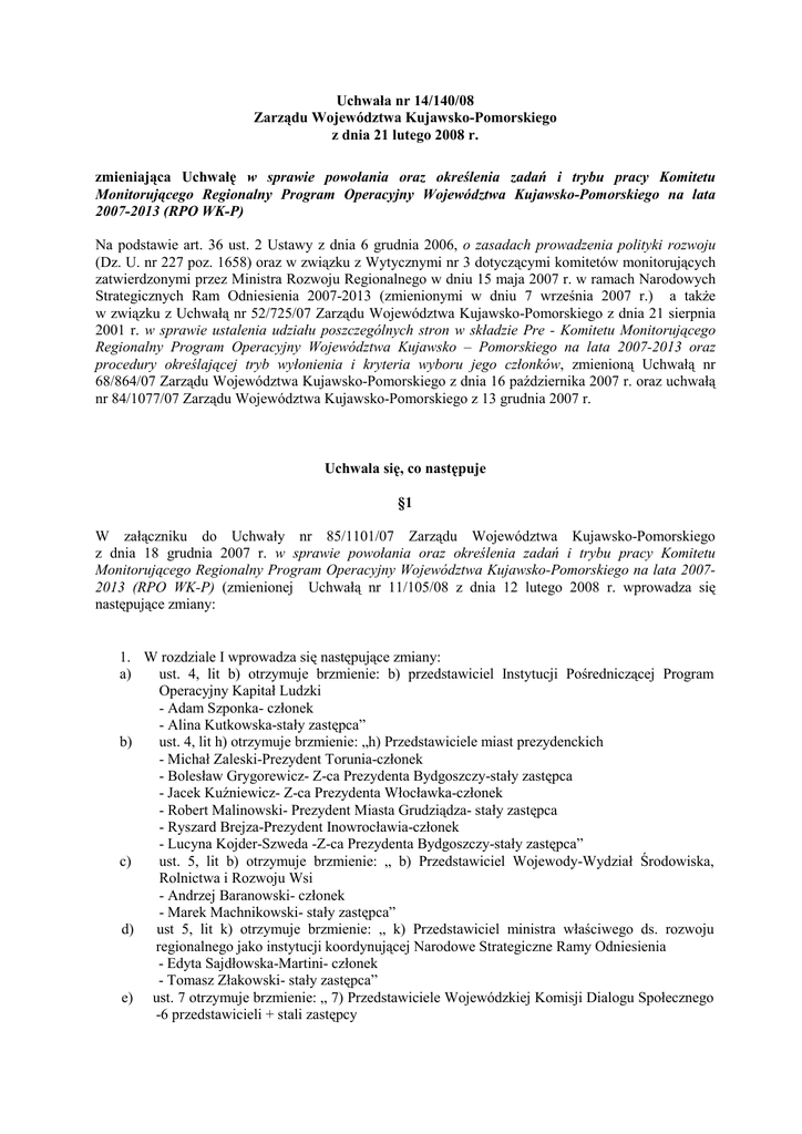 Uchwała nr 14/140/08 Zarządu Województwa Kujawsko-Pomorskiego z dnia 21 lutego 2008 r. zmieniająca Uchwałę w sprawie powołania oraz określenia zadań i trybu pracy Komitetu Monitorującego Regionalny Program Operacyjny Województwa Kujawsko-Pomorskiego na lata 2007-2013 (RPO WK-P) Na podstawie art. 36 ust. 2 Ustawy z dnia 6 grudnia 2006, o zasadach prowadzenia polityki rozwoju (Dz. U. nr 227 poz. 1658) oraz w związku z Wytycznymi nr 3 dotyczącymi komitetów monitorujących zatwierdzonymi przez Ministra Rozwoju Regionalnego w dniu 15 maja 2007 r. w ramach Narodowych Strategicznych Ram Odniesienia 2007-2013 (zmienionymi w dniu 7 września 2007 r.) a takŜe w związku z Uchwałą nr 52/725/07 Zarządu Województwa Kujawsko-Pomorskiego z dnia 21 sierpnia 2001 r. w sprawie ustalenia udziału poszczególnych stron w składzie Pre - Komitetu Monitorującego Regionalny Program Operacyjny Województwa Kujawsko – Pomorskiego na lata 2007-2013 oraz procedury określającej tryb wyłonienia i kryteria wyboru jego członków, zmienioną Uchwałą nr 68/864/07 Zarządu Województwa Kujawsko-Pomorskiego z dnia 16 października 2007 r. oraz uchwałą nr 84/1077/07 Zarządu Województwa Kujawsko-Pomorskiego z 13 grudnia 2007 r. Uchwala się, co następuje §1 W załączniku do Uchwały nr 85/1101/07 Zarządu Województwa Kujawsko-Pomorskiego z dnia 18 grudnia 2007 r. w sprawie powołania oraz określenia zadań i trybu pracy Komitetu Monitorującego Regionalny Program Operacyjny Województwa Kujawsko-Pomorskiego na lata 20072013 (RPO WK-P) (zmienionej Uchwałą nr 11/105/08 z dnia 12 lutego 2008 r. wprowadza się następujące zmiany: 1. W rozdziale I wprowadza się następujące zmiany: a) ust. 4, lit b) otrzymuje brzmienie: b) przedstawiciel Instytucji Pośredniczącej Program Operacyjny Kapitał Ludzki - Adam Szponka- członek - Alina Kutkowska-stały zastępca” b) ust. 4, lit h) otrzymuje brzmienie: „h) Przedstawiciele miast prezydenckich - Michał Zaleski-Prezydent Torunia-członek - Bolesław Grygorewicz- Z-ca Prezydenta Bydgoszczy-stały zastępca - Jacek Kuźniewicz- Z-ca Prezydenta Włocławka-członek - Robert Malinowski- Prezydent Miasta Grudziądza- stały zastępca - Ryszard Brejza-Prezydent Inowrocławia-członek - Lucyna Kojder-Szweda -Z-ca Prezydenta Bydgoszczy-stały zastępca” c) ust. 5, lit b) otrzymuje brzmienie: „ b) Przedstawiciel Wojewody-Wydział Środowiska, Rolnictwa i Rozwoju Wsi - Andrzej Baranowski- członek - Marek Machnikowski- stały zastępca” d) ust 5, lit k) otrzymuje brzmienie: „ k) Przedstawiciel ministra właściwego ds. rozwoju regionalnego jako instytucji koordynującej Narodowe Strategiczne Ramy Odniesienia - Edyta Sajdłowska-Martini- członek - Tomasz Złakowski- stały zastępca” e) ust. 7 otrzymuje brzmienie: „ 7) Przedstawiciele Wojewódzkiej Komisji Dialogu Społecznego -6 przedstawicieli + stali zastępcy a) Ogólnopolskie Porozumienie Związków Zawodowych GraŜyna Ciemniak - członek Harald Matuszewski- stały zastępca b) Międzyregionalny Zespół Koordynacyjny NSZZ „Solidarność” Leszek Walczak- członek Ewa Kozanecka- stały zastępca c) Forum Związków Zawodowych Andrzej Arndt- członek Sławomir Wittkowicz- stały zastępca d) Kujawsko-Pomorski Związek Pracodawców i Przedsiębiorców Waldemar KsiąŜczak- członek Hanna Wysocka -stały zastępca e)Kujawsko-Pomorska Izba Rzemiosła i Przedsiębiorczości Jan Gogolewski -członek Andrzej Hadrysiak.-stały zastępca f) Krzysztof Matela- Businnes Centre Club Związek Pracodawców - członek Miron Klomfas- Kujawsko-Pomorska Organizacja Pracodawców -stały zastępca” §2 Wykonanie uchwały powierza się Dyrektorowi Departamentu Polityki Regionalnej w Urzędzie Marszałkowskim Województwa Kujawsko-Pomorskiego w Toruniu. §3 Uchwała wchodzi w Ŝycie z dniem podjęcia. Uzasadnienie Zgodnie z art. 63 ust. 1 Rozporządzenia Rady (WE) nr 1083/2006 z dnia 11 lipca 2006, ustanawiającego przepisy ogólne dotyczące Europejskiego Funduszu Rozwoju Regionalnego, Europejskiego Funduszu Społecznego i Funduszu Spójności i uchylającego rozporządzenie (WE) nr 1260/1999 Rozporządzenie ogólne) oraz art. 36 ust 2 ustawy z dnia 6 grudnia 2006 o zasadach prowadzenia polityki rozwoju (ze zm.), Instytucja Zarządzająca Regionalnym Programem Operacyjnym dla Województwa Kujawsko-Pomorskiego na lata 2007-2013Zarząd Województwa Kujawsko-Pomorskiego jest zobowiązany powołać Komitet Monitorujący. Zgodnie z art. 35 ust. 3 Ustawy z dnia 6 grudnia 2006, o zasadach prowadzenia polityki rozwoju (Dz. U. nr 227 poz. 1658), Ministerstwo Rozwoju Regionalnego opracowało wytyczne dotyczące powoływania Komitetów Monitorujących dla programów operacyjnych i regionalnych programów operacyjnych, ustalania jego składu, zadań oraz trybu działania. W dniu 18 grudnia 2007 r. Zarząd Województwa Kujawsko-Pomorskiego podjął Uchwałę w sprawie powołania i określenia zadań oraz trybu pracy Komitetu Monitorującego Regionalny Program Operacyjny Województwa Kujawsko-Pomorskiego na lata 2007-2013 (RPO WK-P). W związku z tym, iŜ Regionalny Program Operacyjny Województwa Kujawsko- Pomorskiego został zatwierdzony decyzją Komisji Europejskiej CCI 2007PL161PO106 z dnia 10 października 2007 r., a zgodnie z art. 63 Rozporządzeniem Rady 1083/2006, Instytucja Zarządzająca zobowiązana jest powołać Komitet Monitorujący w ciągu 3 m-cy od dnia notyfikacji Kraju Członkowskiego przez Komisję Europejską o zatwierdzeniu programu (co nastąpiło 11 października 2007 r.), powołanie składu Komitetu Monitorującego oraz pierwsze jego posiedzenie musiało odbyć się przed 11 stycznia 2008 r. Jako, Ŝe do tego momentu Wojewódzka Komisja Dialogu Społecznego nie wskazała przedstawicieli do prac w Komitecie, zgodnie z ustaloną przez Instytucję Zarządzającą liczbą, został on powołany bez ich udziału. Zgodnie z Wytycznymi nr 3 Ministra Rozwoju Regionalnego dotyczącymi komitetów mo