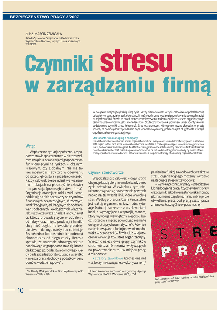 BEZPIECZEŃSTWO PRACY 3/2007 dr in¿. MARCIN ¯EMIGA£A Katedra Systemów Zarz¹dzania, Politechnika £ódzka Wy¿sza Szko³a Ekonomii, Turystyki i Nauk Spo³ecznych w Kielcach Czynniki stresu w zarz¹dzaniu firm¹ W zwi¹zku z obejmuj¹c¹ ka¿d¹ sferê ¿ycia i ka¿dy niemal¿e okres w ¿yciu cz³owieka wspó³zale¿ności¹ cz³owiek – organizacja (przedsiêbiorstwo, firma) nieuchronne wydaje siê powstawanie pewnych napiêæ na tej w³aśnie linii. Stawia to przed mened¿erami wyzwanie radzenia sobie ze stresem organizacyjnym zarówno pracowniczym, jak i mened¿erskim. Skuteczny kierownik powinien umieæ identyfikowaæ podstawowe czynniki stresu (stresory). Stres jest procesem, którego nie mo¿na z³agodziæ w prosty sposób, za pomoc¹ doraźnych dzia³añ b¹dź jednorazowych akcji, potrzebna jest d³ugotrwa³a strategia ³agodzenia stresu organizacyjnego. Stress factors in managing a company Wstêp The relationship between human and an organization includes every area of life and almost every period in a lifetime. With regard to that fact, some tensions have become inevitable. It challenges managers to cope with organizational stress, both workers’ and managerial. An effective manager should be able to identify basic stress factors (stressors). One should remember that stress is a process which cannot be reduced in a straightforward way by means of temporary operations or isolated actions. What is essential is a long-term strategy of alleviating organizational stress. Wspó³czesna sytuacja spo³eczno-gospodarcza stawia spo³eczeñstwo w nierozerwalnym zwi¹zku z organizacjami gospodarczymi funkcjonuj¹cymi na rynkach – lokalnym, krajowym, czy globalnym. Nie ma takiej mo¿liwości, aby ¿yæ w oderwaniu od przedsiêbiorstwa i przedsiêbiorczości. Ka¿dy cz³owiek bierze udzia³ we wzajemnych relacjach na p³aszczyźnie cz³owiek – organizacja (przedsiêbiorstwo, firma). Organizacje otaczaj¹ce ludzi z wielu stron, oddzia³uj¹ na nich pocz¹wszy od czynników finansowych, organizacyjnych, s³u¿bowych, kwalifikacyjnych, edukacyjnych do oddzia³ywañ spo³ecznych i ekologicznych w³¹cznie. Jak s³usznie zauwa¿a Charles Handy „nawet ci, którzy prowadz¹ ¿ycie w oddaleniu od fabryk oraz miejsc produkcji i handlu, chc¹ mieæ pogl¹d na kwestie przedsiêbiorstwa – do kogo nale¿y i po co istnieje. Bezpośrednio lub pośrednio ich dobrobyt ekonomiczny od niego zale¿y. Recesja sprawia, ¿e znaczenie zdrowego sektora handlowego w gospodarce staje siê istotne dla ka¿dego gospodarstwa domowego. Kiedy pada przedsiêbiorstwo, upada wszystko – miejsca pracy, dochody z podatków, ceny domów, wydatki rz¹dowe”1. Wspó³zale¿nośæ cz³owiek – organizacja obejmuje ka¿d¹ sferê i niemal¿e ka¿dy okres ¿ycia cz³owieka. W zwi¹zku z tym, nieuchronne wydaje siê powstawanie pewnych napiêæ na tej w³aśnie linii, które wywo³uj¹ stres. Wed³ug profesora Józefa Penca „stres jest reakcj¹ organizmu na tzw. trudne sytuacje (sytuacje sprzeczne z oczekiwaniami ludzi, a wymagaj¹ce akceptacji), stanem, który wywo³uje wewnêtrzny niepokój, budzi sprzeciw i mêczy, powoduj¹c rozmaite dolegliwości psychosomatyczne”2. Równie¿ napiêcia zwi¹zane z funkcjonowaniem cz³owieka w organizacji (w firmie), lub w jej otoczeniu wywo³uj¹ tzw. stres organizacyjny. Wyró¿niæ nale¿y dwie grupy czynników stresotwórczych (stresorów) wp³ywaj¹cych na powstawanie stresu w miejscu pracy, a mianowicie: stresory zawodowe (profesjonalne) – s¹ to czynniki zwi¹zane z wykonywaniem/ 1 Ch. Handy Wiek paradoksu. Dom Wydawniczy ABC, Warszawa 1996, s. 126 2 J. Penc Kreowanie zachowañ w organizacji. Agencja Wydawnicza PLACET, Warszawa 2001, s. 154 Czynniki stresotwórcze pe³nieniem funkcji zawodowych; w zakresie stresu organizacyjnego mo¿emy wyró¿niæ nastêpuj¹ce stresory zawodowe: – wynikaj¹ce z natury pracy – przeci¹¿enie lub niedoci¹¿enie prac¹, fizyczne warunki pracy oraz czynniki szkodliwe na stanowiskach pracy, jak: nadmierne zapylenie, ha³as, wibracje, z³e oświetlenie; praca pod presj¹ czasu, praca zmianowa (szczególnie w porze nocnej) ieczeñstwa – Konkurs na plakat bezp Ewa Stanis³awska-Balicka pracy „Stres” – CIOP 1997 10 BEZPIECZEŃSTWO PRACY 3/2007 tres”– CIO P 1997 tzw. transfer stresu poza miejsce pracy (np. na p³aszczyznê ¿ycia rodzinnego lub pozazawodowe interakcje spo³eczne). 3 Szerzej na ten temat pisze J. Penc Kreatywne kierowanie. Agencja Wydawnicza PLACET, Warszawa 2000, s. 236-237 zpieczeñst na plakat be z – Konkurs Terechowic Wyró¿nia siê dwa rodzaje stresu organizacyjnego, a mianowicie stres pracowniczy i stres mened¿erski3. Stres pracowniczy dotyczy ka¿dego pracownika w przedsiêbiorstwie i towarzyszy mu ju¿ od pierwszej rozmowy kwalifikacyjnej, przez wszystkie etapy kariery zawodowej, a¿ do uzyskania emerytury, dobrowolne odejście lub w najgorszym wypadku zwolnienie z pracy. Natomiast stres mened¿erski jest ściśle zwi¹zany z pe³nieniem funkcji kierowniczych, du¿o wiêksz¹ odpowiedzialności¹ oraz dalece bardziej skomplikowanymi stosunkami organizacyjnymi wynikaj¹cymi ze specyfiki stanowiska kierowniczego. Stres pracowniczy wywo³ywany jest najczêściej przez nastêpuj¹ce czynniki: z³a organizacja pracy monotonia wykonywanych czynności rutynizacja zachowañ zbyt ścis³y nadzór upokarzaj¹co niskie p³ace, niewystarczaj¹ce na godziwe ¿ycie i utrzymanie rodziny brak wyraźnego określenia zakresu obowi¹zków przy jednoczesnym stawianiu wygórowanych wymagañ poczucie braku kontroli nad wykonywan¹ prac¹ oraz braku zainteresowania osob¹ pracownika, niedocenianie wk³adu pracownika w realizacjê celów przedsiêbiorstwa, w sukces firmy. Z kolei stres mened¿erski wywo³uj¹ miêdzy innymi takie czynniki, jak: skomplikowany proces podejmowania decyzji, czêsto bardzo trudnych, dotycz¹cych np. zwolnieñ pracowników lub du¿ych inwestycji finansowych wysokie wymagania w zakresie odpowiedz