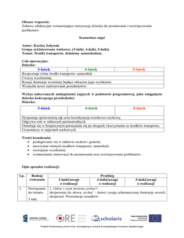 Obszar wsparcia: Zabawy edukacyjne wzmacniające motywację dziecka do poznawania i rozwiązywania problemów. Scenariusz zajęć Autor: Karina Jedynak Grupa zróżnicowana wiekowo: (3-latki, 4-latki, 5-latki) Temat: Środki transportu. Jedziemy samochodem. Cele operacyjne: Dziecko: 3-latek 4-latek 5-latek Rozpoznaje różne środki transportu: samochód. Ćwiczy wyobraźnię. Rysuje ilustracje wcześniej będące obrazem jego wyobraźni. Wymyśla nowe zastosowanie przedmiotów. Wykaz nabywanych umiejętności (ujętych w podstawie programowej, jako osiągnięcia dziecka kończącego przedszkole): Dziecko: 3-latek 4-latek 5-latek Dysponuje sprawnością rąk oraz koordynacją wzrokowo-ruchową. Odgrywa role w zabawach parateatralnych. Orientuje się w bezpiecznym poruszaniu się po drogach i korzystaniu ze środków transportu. Uczestniczy w zajęciach ruchowych. Treści kształcenia:  posługiwanie się w zabawie ruchem i gestem;  nazywanie różnych środków transportu: samochód;  rozwijanie wyobraźni;  wzmacnianie motywacji do poznawania oraz rozwiązywania problemów. Opis sposobu realizacji: Lp. 1. Rodzaj ćwiczenia Nawiązanie do tematu. 3 min. Przebieg 3-latki/uwagi 4-latki/uwagi 5-latki/uwagi o realizacji o realizacji o realizacji 1. Gdzie i czym możemy jechać?: skojarzenia do słowa: jechać – dzieci rysują schematyczną ilustrację swoich skojarzeń. Prezentacja rysunków. Projekt finansowany przez Unię Europejską w ramach Europejskiego Funduszu Społecznego Ćwiczenia pamięci. 2 min. Ćwiczenia dramowe. 1 min. 2. Ćwiczenia właściwe. 10 min. 3. Ćwiczenia kończące. 2 min. 2. Dokąd podążą nasze myśli?: dzieci siedzą w kręgu (jeśli jest duża grupa, można podzielić dzieci na 2-3 zespoły). Pierwsze dziecko mówi słowo kojarzące się z podróżami. Kolejne, po jego lewej stronie, powtarza słowo kolegi i dodaje swoje. Każde następne dziecko powtarza słowa od początku do dodania swojego własnego słowa. 3. Jedziemy samochodem: dzieci, dobrane w czteroosobowe grupy, wykonują czynności zgodnie z nagraniem (załącznik nr 5). Przed włączeniem nagrania N może powiedzieć dzieciom, aby wyobraziły sobie przed sobą czteroosobowy samochód. 4. Co to za przedmiot?: N zachęca dzieci do oglądania prezentacji multimedialnej (załącznik nr 6). Dzieci odgadują, co przedstawiają poszczególne slajdy, a następnie wymyślają nowe zastosowanie tego przedmiotu np. kierownica samochodu może być karuzelą dla lalek. 5. Koło: 5. Kierownica: 5. Jak można dzieci uzupełniają dzieci uzupełniają wykorzystać części ilustrację wg własnego ilustrację wg własnego samochodowe?: pomysłu (załącznik pomysłu (załącznik dzieci rysują na kartce nr 1). nr 2). rzecz, w której zastosowanie znajdą przedmioty wymienione we wcześniej oglądanej prezentacji multimedialnej. 6. Widok zza szyby samochodu: chętne dzieci mogą zagrać w gry multimedialne (załączniki nr 7 i 8). 7. Zza szyby samochodu: wizualizacja. Dzieci siedzą z zamkniętymi oczami. N czyta wolno tekst, zatrzymując się w odpowiednich momentach, aby ułatwić dzieciom wyobrażenie sobie treści opowiadania (załącznik nr 3). Następnie dzieci uzupełniają ilustrację zgodnie ze swoimi wyobrażeniami z wizualizacji (załącznik nr 4). Uwagi: Propozycje zawarte w scenariuszu zostały przygotowane w taki sposób, aby nauczyciel mógł dostosować czas realizacji zajęć do możliwości dzieci w grupie oraz z zachowaniem tzw. zasady 1/5, zalecanej w części podstawy programowej dotyczącej zalecanych warunków i sposobu jej realizacji. Zajęcia nie powinny trwać dłużej niż 15 minut. Jeżeli niektóre dzieci pomimo upływu czasu są zainteresowane proponowanymi działaniami nie należy im przerywać tej aktywności. Dzieci, których uwaga się wyczerpała, w naturalny sposób powracają do realizacji „programu własnego”, czyli wybranego przez siebie rodzaju aktywności (np. zabawowej). Projekt finansowany przez Unię Europejską w ramach Europejskiego Funduszu Społecznego Metody za M. Kwiatowską (1985): Czynne: ćwiczeń praktycznych. Słowne: objaśnienia i instrukcje. Percepcyjne: obserwacja i pokaz, przykład dorosłych. Formy pracy: praca indywidualna jednolita i zróżnicowana, zbiorowa jednolita i zróżnicowana. Środki dydaktyczne: kartki formatu A4, kredki, komputer z dostępem do Internetu oraz głośnikami lub tablica multimedialna oraz środki dydaktyczne zamieszczone na portalu Scholaris (dla nauczyciela, do wykorzystania w pracy z dzieckiem): 1. 2. 3. 4. 5. 6. 7. 8. Ilustracja - Koło; Ilustracja - Kierownica; Tekst wizualizacji - Zza szyby samochodu; Ilustracja - Zza szyby samochodu; Plik dźwiękowy - Jedziemy samochodem; Prezentacja multimedialna - Co to za przedmiot?; Puzzle multimedialne - Samochód; Kolorowanka multimedialna - Widok zza szyby samochodu. Projekt finansowany przez Unię Europejską w ramach Europejskiego Funduszu Społecznego